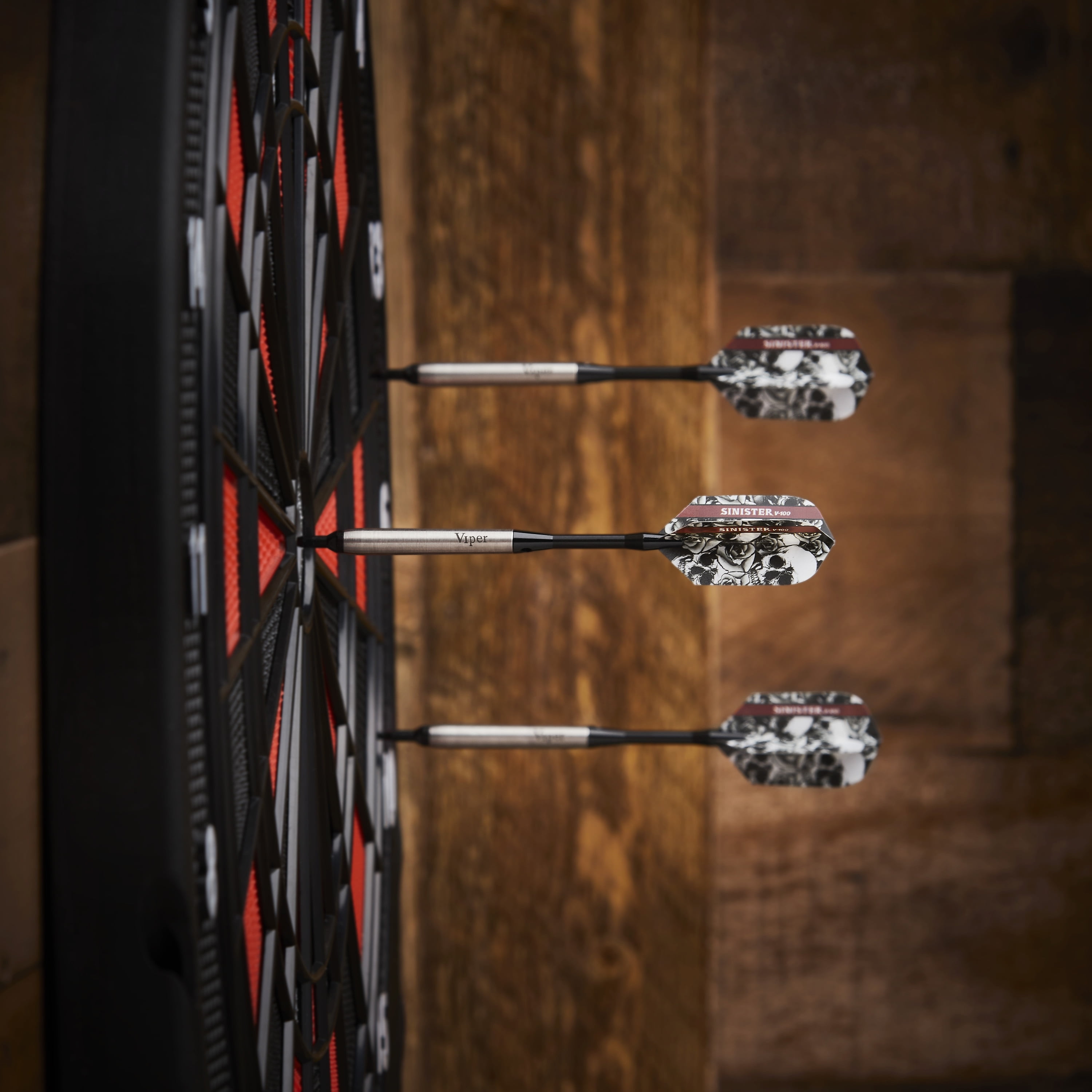 Elevate your game with Viper Sinister soft tip darts, designed for use with electronic dartboards. The barrels of these darts are 95% tungsten, a durable metal that makes the world’s best darts. This is because tungsten’s high density allows the darts to be made slimmer, which allows for tighter groupings and higher scores. Each barrel’s smooth grip ensures an easy release for more accurate throws. The aluminum dart shafts are stronger than nylon or plastic and feature locking holes to help keep them secure. To top it off, each one is adorned with an exclusive Sinister high speed dart flight, perfect for straight, fast throws. Each set includes three fully assembled soft tip darts, three extra nylon shafts, three extra tips, three extra flights, and a dart wrench.
