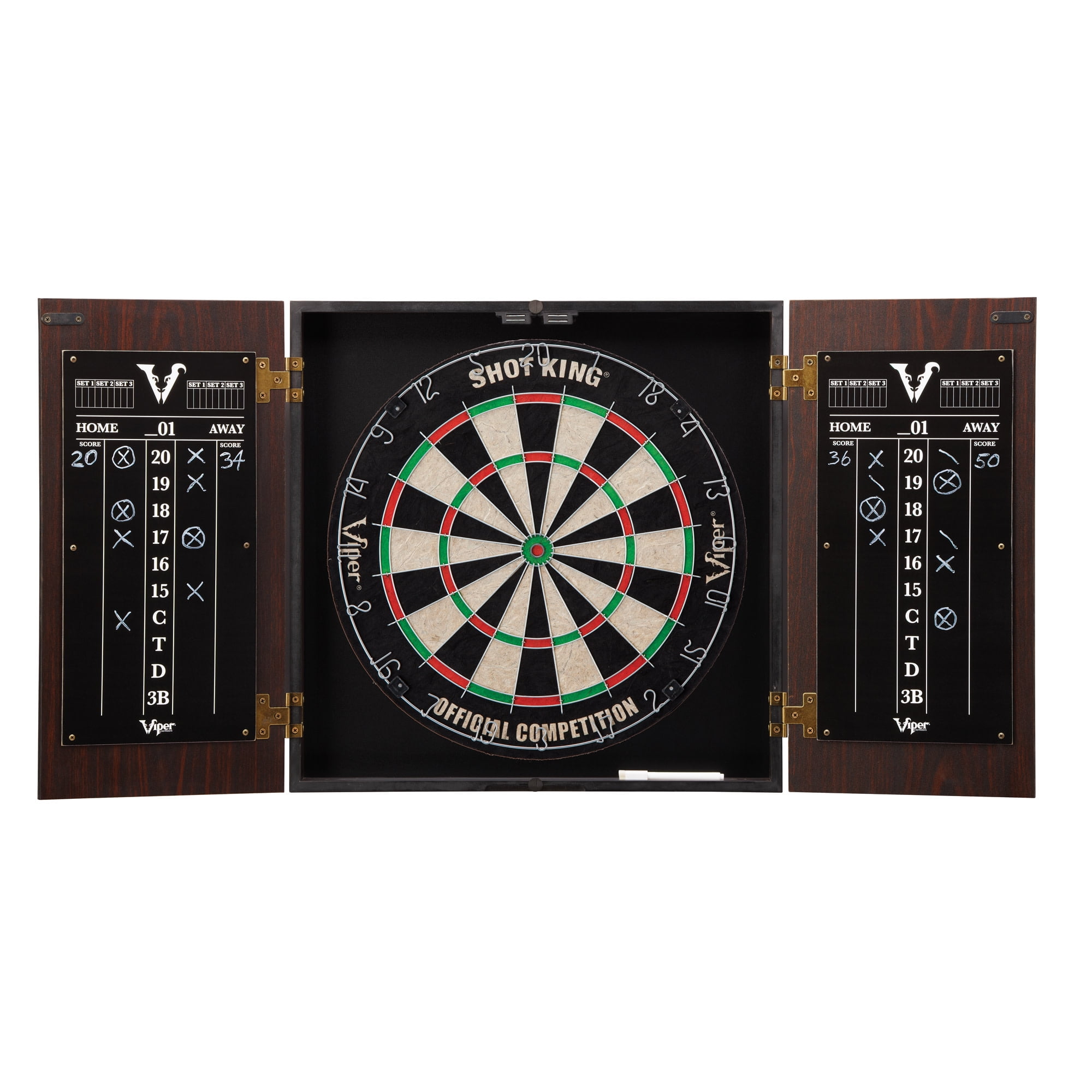 Your reign starts now! Introducing the Viper Stadium Cabinet with Shot King Sisal Dartboard & “The Bull Starts Here” Throw Line Marker Bundle – the bundle every King or Queen of Darts needs in their royal treasury! The Shot King is Tournament Quality Regulation 17.75″ in diameter and made from compressed sisal fibers, granting it substantial longevity in comparison to older, wood-based boards. This is due to the material’s “self-healing” nature: the sisal fibers automatically close the holes left behind by your darts, essentially returning the board to its original state whenever a dart is removed. You can also rotate the detachable number ring around the board, allowing your prime spots to move to a new section when the previous ones wear down. Its staple-free bullseye and rounded, galvanized steel wire spider also significantly decrease your odds of bouncing out upon impact, and if you want to get started right away, six starter darts are included to let you shoot first and ask questions later. Meanwhile, the Stadium Cabinet containing the board is constructed from wood and given a smooth walnut finish. Its doors feature brass-finished patina bronze hinges, built-in dry erase scoreboards, and a magnetic lock to keep the cabinet firmly shut when not in use. Darts and other accessories can be stored in the compartment below the board area, and a mounting bracket installed for you in the center of the cabinet makes hanging up your Shot King a breeze. Rounding out the bundle is a standard throw line marker that’s easily applied to any floor.