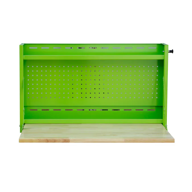 Create a workstation in an instant with this wall mounted worktable by Viper Tool Storage®! Crafted with sturdy 19-gauge steel and powder coated for a durable finish, this unique table includes a fold-down work surface, 2 shelves and built-in pegboard. Mount it to a wall at your desired height for the perfect stand-up or sit-down workstation that folds up out of the way when not in use.