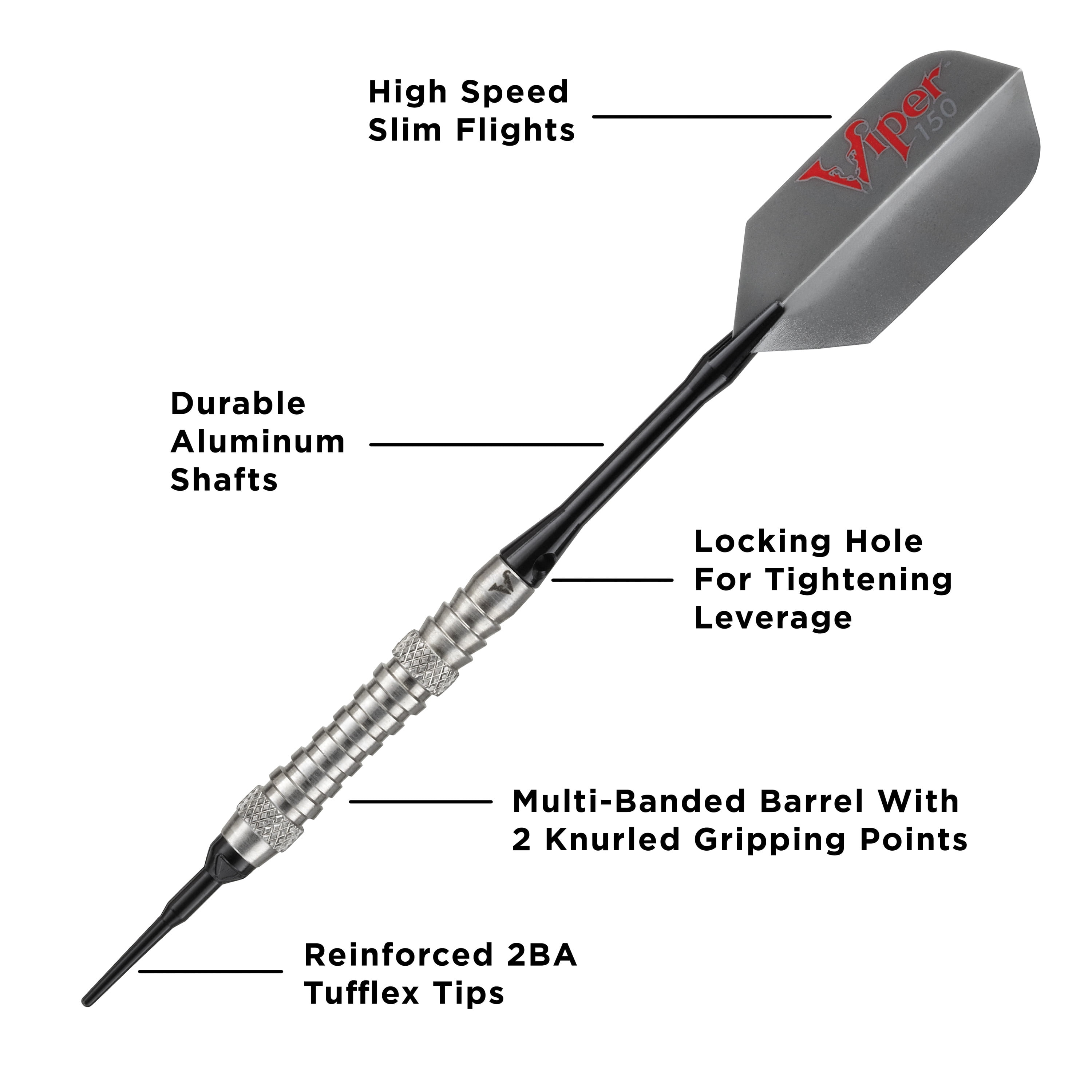 Take your game from casual to pro with the Viper V-Factor Soft Tip Darts, designed for use with either electronic dart boards or most sisal dart boards. These darts are packed with features starting with the barrel, fashioned from 90% Tungsten and 10% Nickel. Tungsten is a very dense metal, able to create slimmer darts with the same weight as lighter metals; this allows for tighter shot groupings without sacrificing control, increasing your scores. Tungsten is a sign of quality and durability as well because of its density. A higher tungsten content will produce a slimmer dart profile than one with less. More tungsten in the dart increases the price as tungsten is a rare metal and its density takes more effort to machine. The increased price gives a higher quality barrel and can improve performance, increasing scores. Each barrel enjoys deep shark fin grooves or knurled bands, allowing your grip to remain consistent throw after throw. The V-Factor Darts feature tough, 150 micron flights. The extra hardiness these flights feature means that you won’t need to replace them as often – they’ll stand up to the toughest throws. Finally, each dart is precision machined for maximum aerodynamics and a sleek, smooth look. Each set includes six high speed slim flights, three extra nylon shafts, nine 2BA Tufflex II Tips, a dart mechanic repair tool, and a Deluxe Dart Pal Dart Case. The Dart Pal is a great all-in-one solution for your new darts. Featuring a hard outer shell and cloth lined slots to keep your darts secure, the Dart Pal has room for everything included in this set!