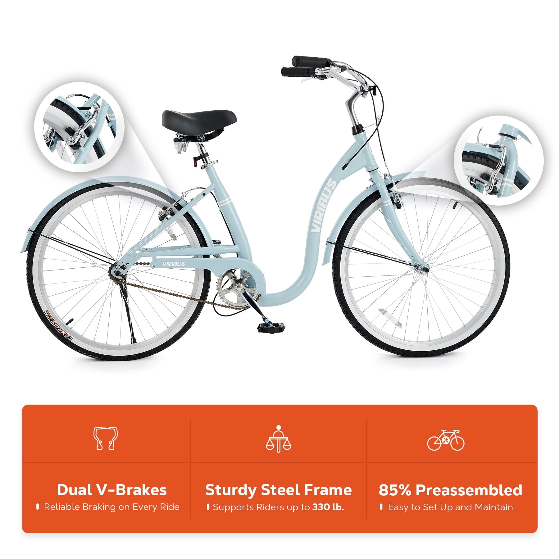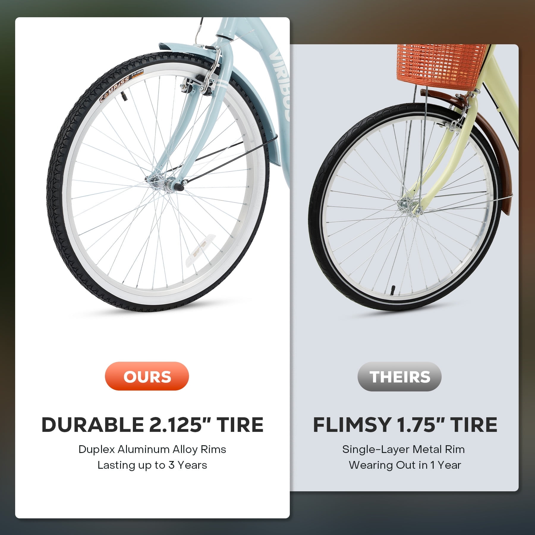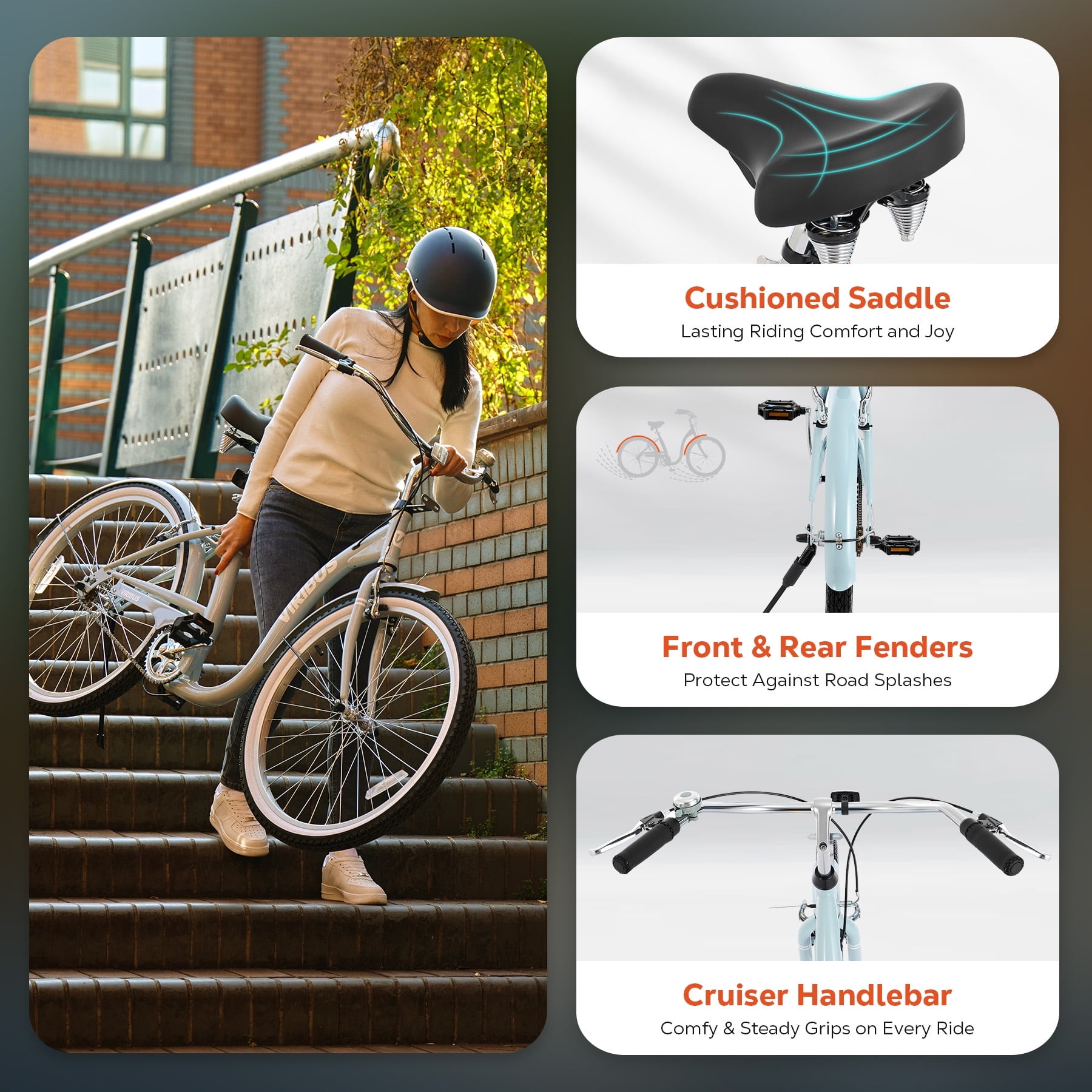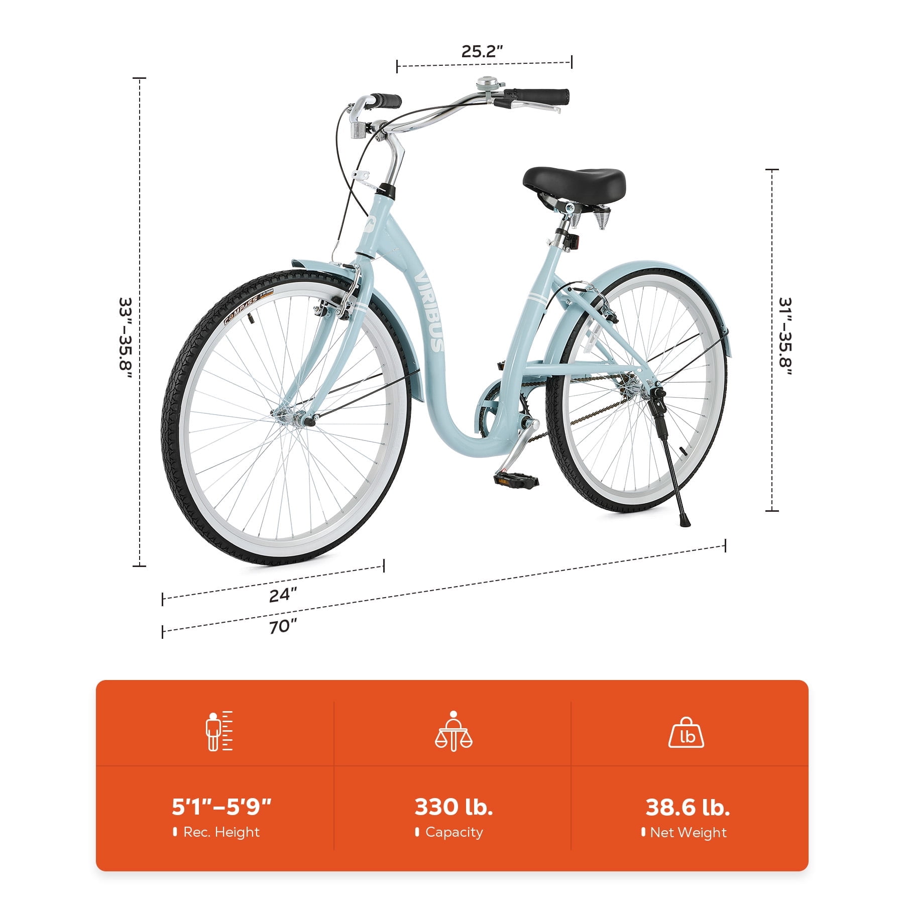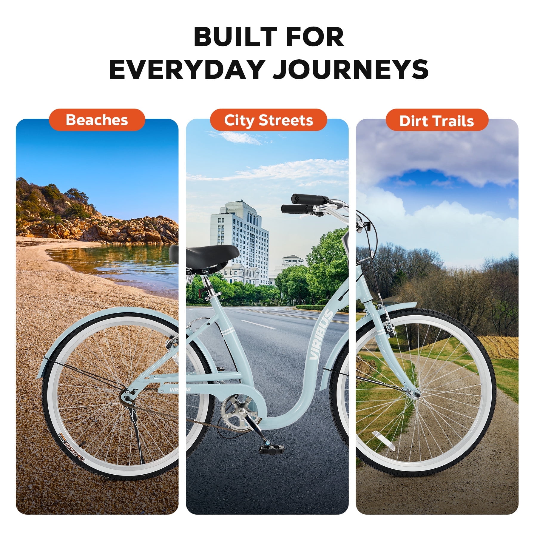 【Stylish Cruising Companion】: Available in 24″ and 26″ wheel sizes, this Viribus women’s cruiser bike blends chic style with everyday functionality, making it perfect for both leisurely rides along scenic routes and quick errands around town 【Easy for Any Rider】: Designed with a low step-through frame, this beach cruiser bike for women makes hopping on and off effortless. The single-speed design offers simple control and a smooth ride for beginners and seasoned cyclists 【Comfort in Every Ride】: The adjustable cruiser handlebar and cushioned saddle provide an upright position to reduce strain on your back and hands. Each 24″ bike fits riders 5’1″ to 5’9″, while each 26″ bike suits those 5’3″ to 6’2″ 【Built Tough for Every Trip】: Equipped with 2.125″ wide rubber tires for better traction and a sturdy steel frame that supports up to 330 lb., this women’s bike is ready to tackle a variety of rugged surfaces and last for years 【Safe & Smooth Riding】: Our women’s bicycle features powerful front and rear V-brakes for confident stopping in any weather, fenders to keep your ride splash-free, and reflectors & a bell to ensure you’re visible and heard even in low light