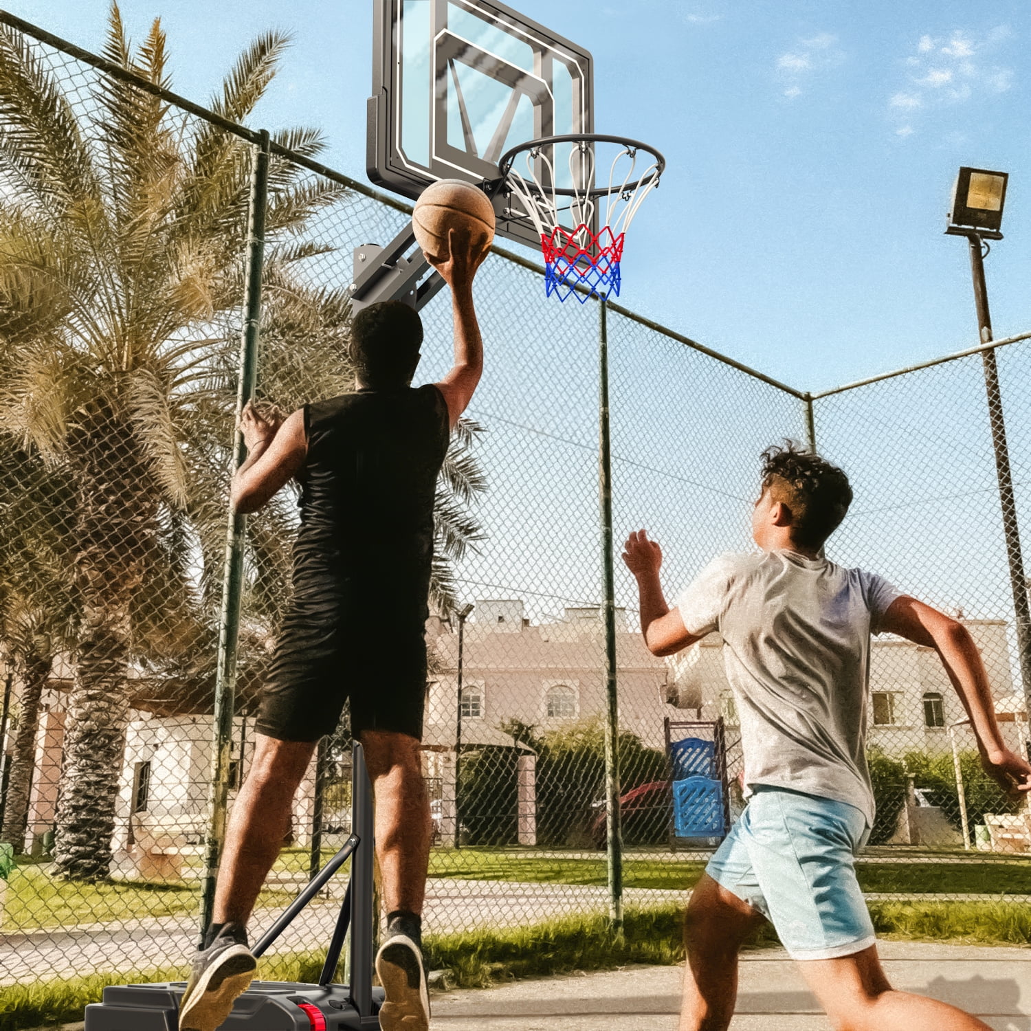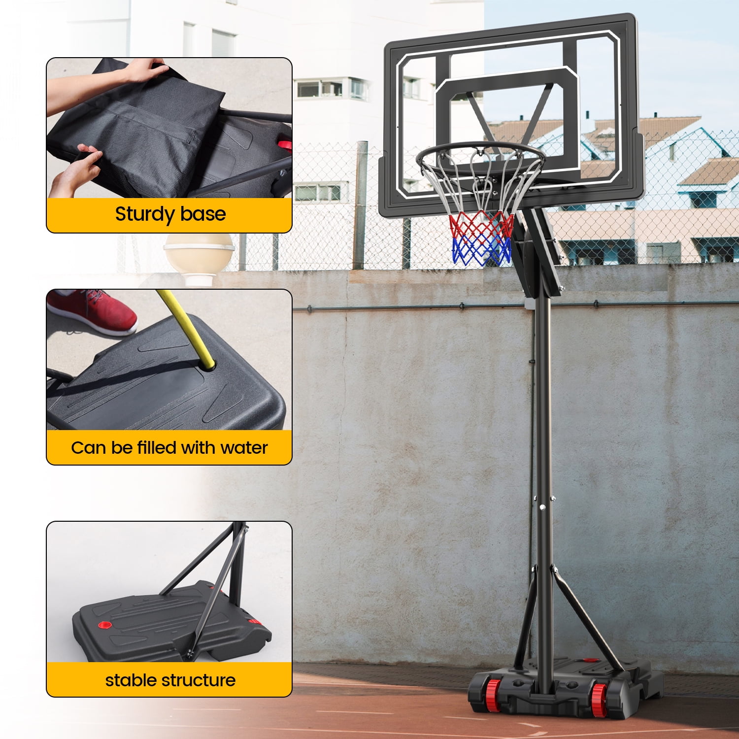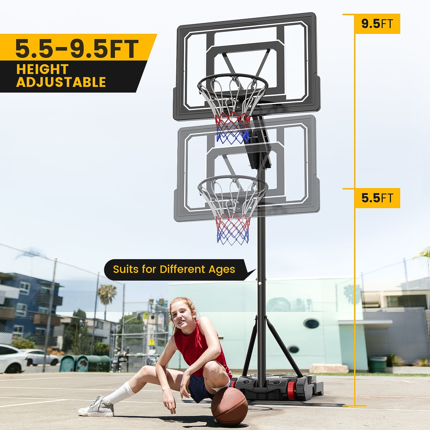 【Height Adjustable in Seconds】 Easily adjust the height of this outdoor basketball hoop system to fit players of all ages. With 5 adjustable heights from 5.5 ft to 9.5 ft, the safety latch fixation allows for quick and secure adjustments. Measure from floor to rim for accurate height selection. 【High Strength Backboard & Rim】 The transparent backboard is crafted from premium PE and PET material, offering superior impact resistance and shatterproof performance. The rounded edge design ensures added safety during play. Please note, not suitable for dunking. 【Stable Fillable Base】 The enlarged base can be filled with up to 9.2 gallons of water, 86 lbs of sand, or 105 lbs of sand + water, providing a stable center of gravity. The package also includes a free weight bag (without filling) capable of holding up to 60 lbs of sand 【All Weather Basketball Hoop System】 This package includes a weather-resistant net, designed to withstand various conditions for long-lasting use. The rustproof metal tubes with a paint surface ensure better durability, making it suitable for both indoor and outdoor play in playgrounds, gyms, backyards, and more. 【Portable & Considerate Design】 The built-in wheels on the base offer easy mobility, allowing you to move the basketball hoop system with ease. A convenient basketball holder on the base provides storage during half-time. The off-prevent hooks on the rim prevent the net from falling off during intense play.