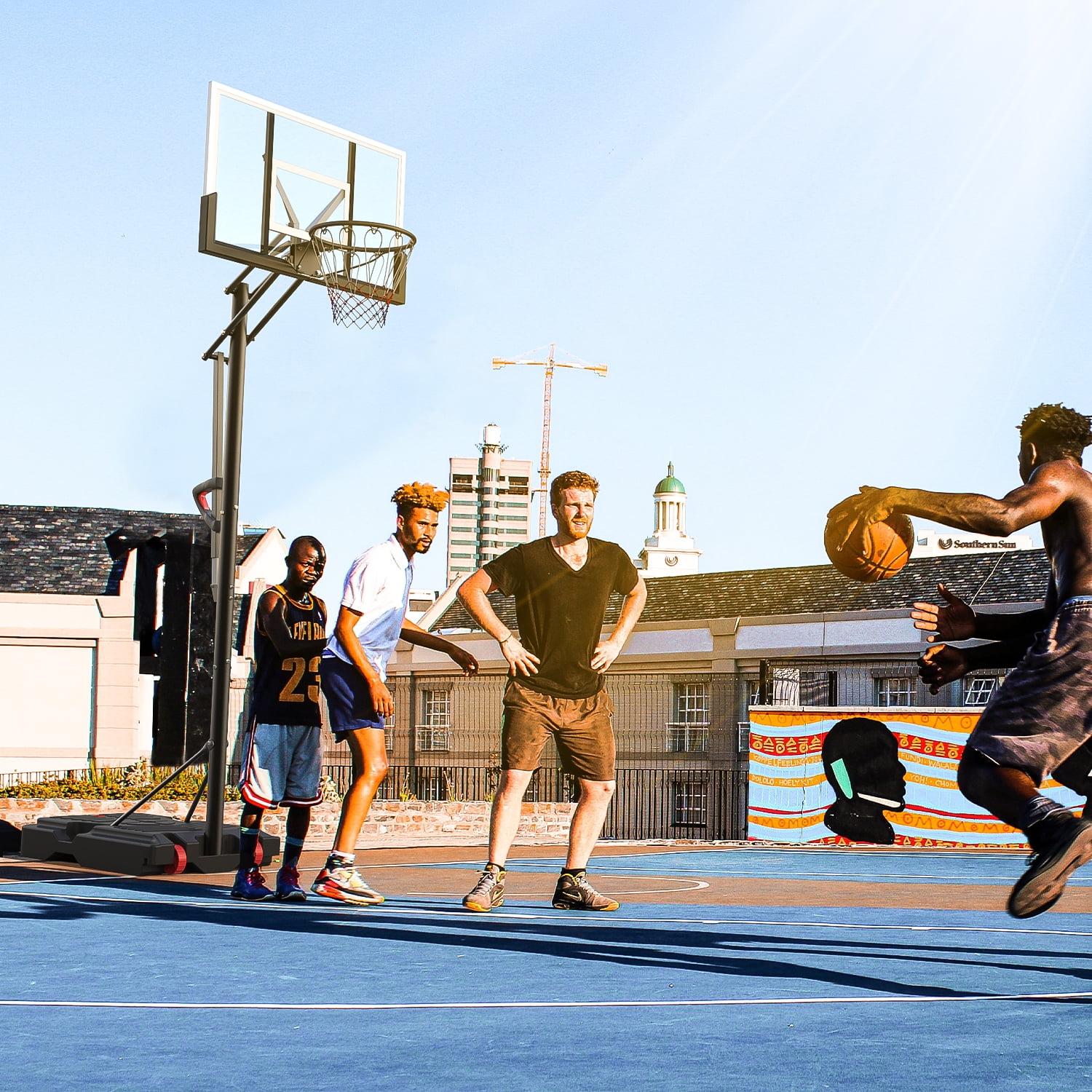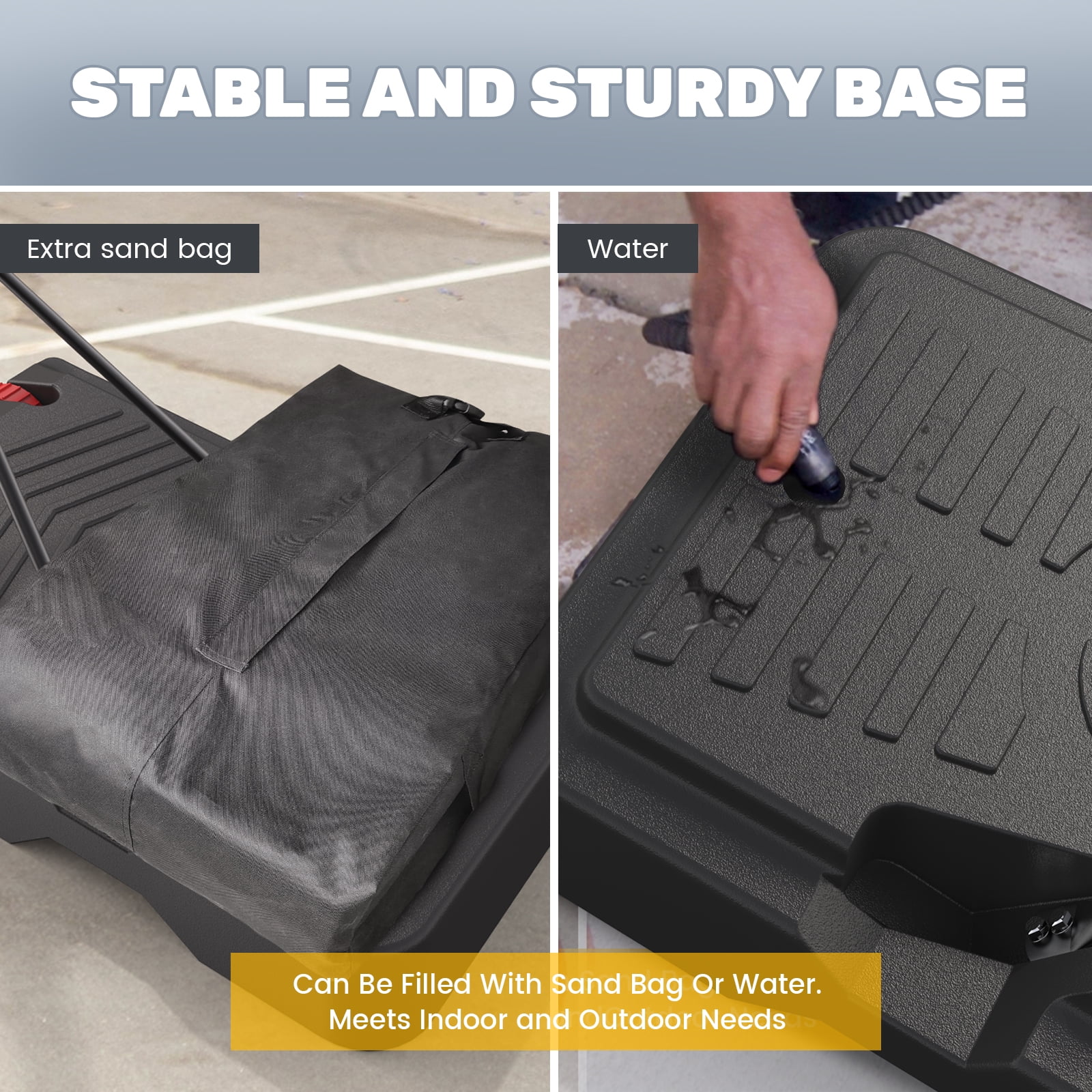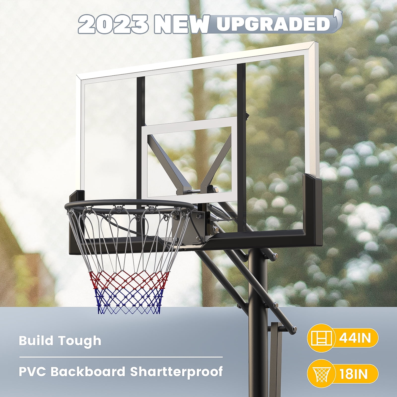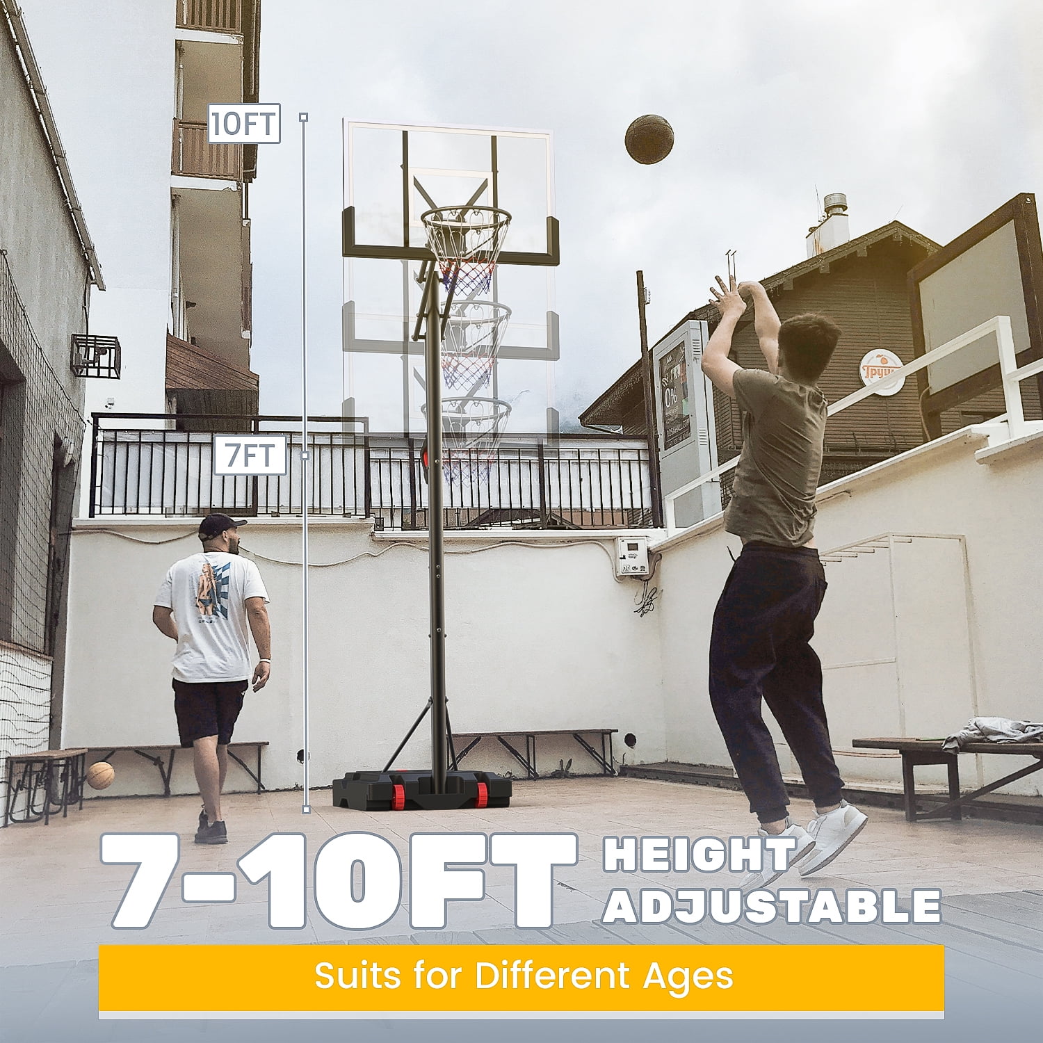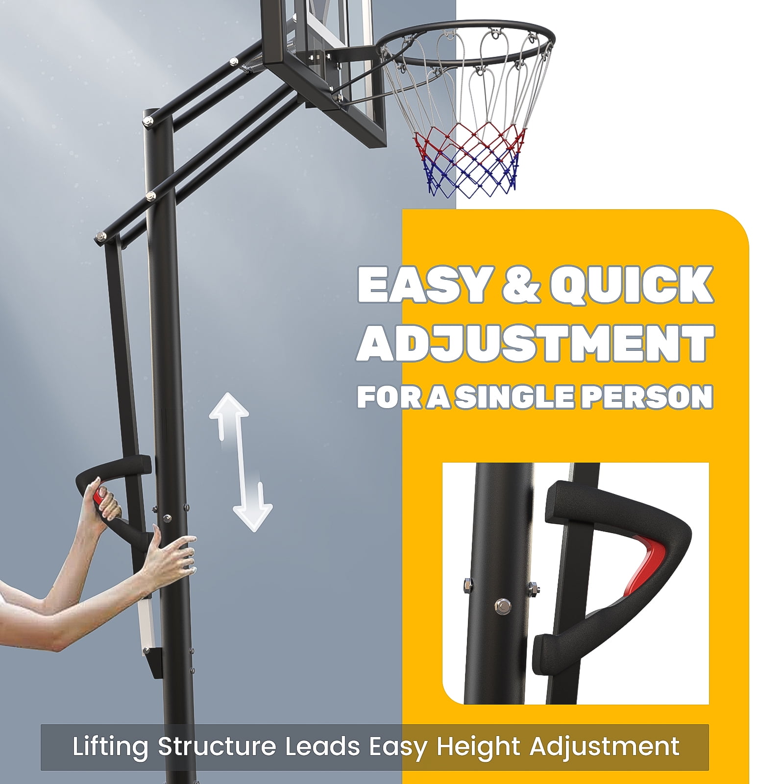 【One-button Height Adjustable】 The rim height of the basketball hoop can be easily adjusted from 7.6 feet to 10 feet by a adjustment bar. Press the adjust button, the adjustment rod can slide up and down to adjust the height. Release the adjustment button, the adjustment lever will automatically lock. You can easily adjust the height with one person, just by pressing a button. 【Weight Bag】Our weight bag is designed to fit most standard full-size portable basketball hoop bases that it can be filled with sandbags or other heavy weighted material so the basketball hoop has good stability, you don’t have to worry about the basketball hoop shaking, tilting or even falling down while playing. 【Steel Frame Backboard】Basketball hoop have steel frame for the backboard, which are stronger than the plastic frame found in most basketball hoops, so you get a basketball hoop that’s stronger and lasts longer. 【Portable Basketball Hoop】44″ BackBoard and 2 Large Wheels. This basketball hoop can be easily moved by one person. It can be moved anywhere you want.