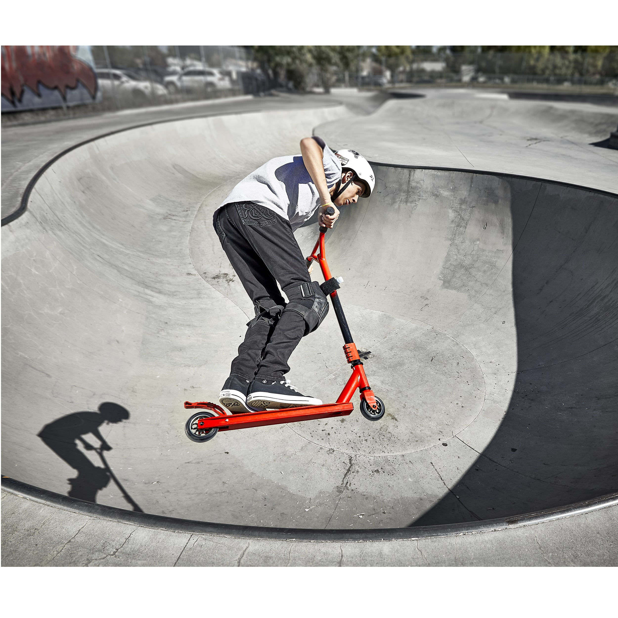 Sturdy scooter for doing stunts. Lightweight, aluminum frame. BMX-style handlebars with rubber grips. 100mm polyurethane tires with high-performance ABEC-7 bearings. Rear friction foot brake.