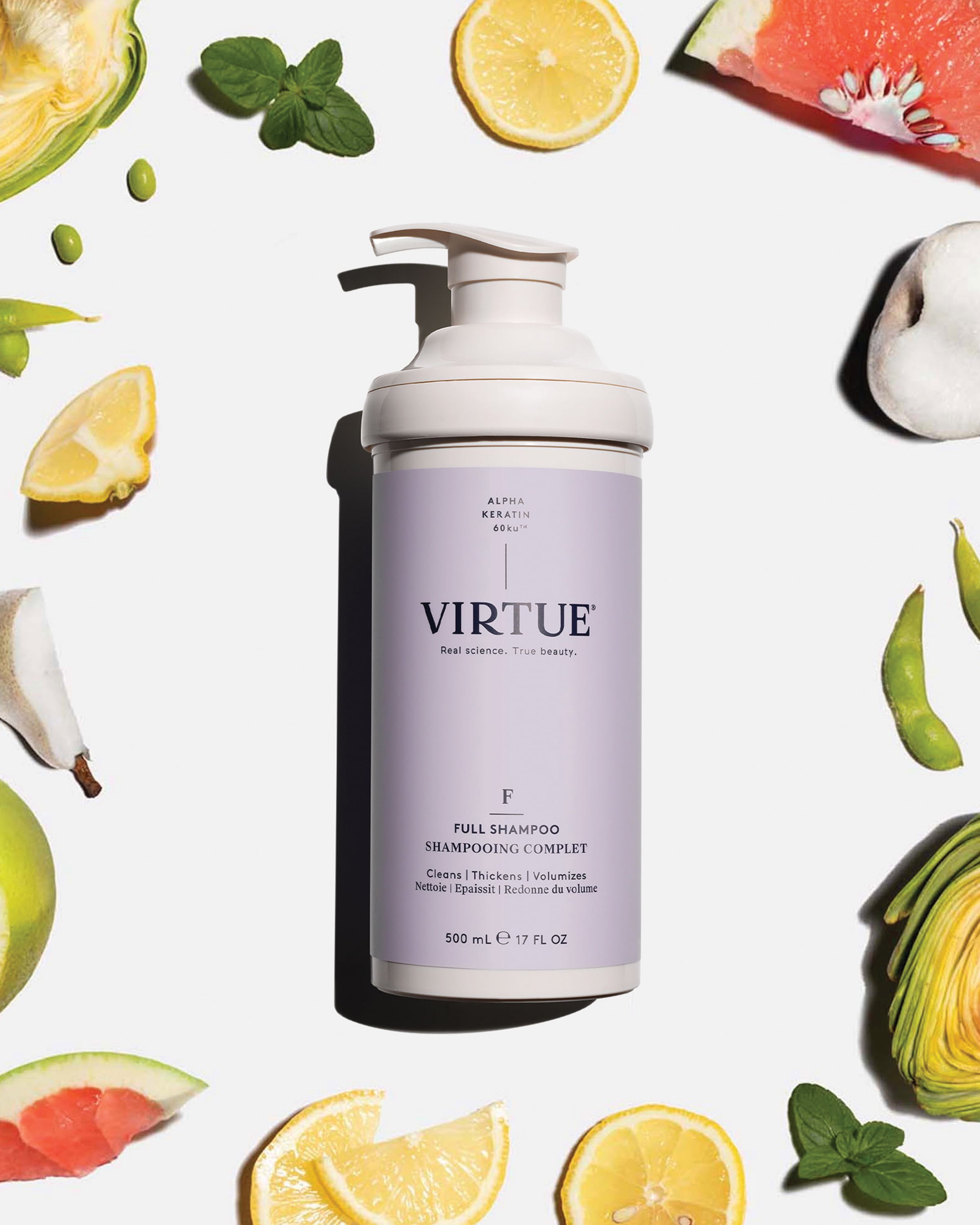 KEY INGREDIENTS • Alpha Keratin 60ku®: Virtue’s proprietary human keratin, repaves and repairs damage to give you stronger, healthier, shinier hair in as few as five uses. • Phospholipids: Molecules derived from natural soybeans that help fight frizz and protect against humidity. KEY CLAIMS: • 84% of women said their hair felt thicker.* • 87% of women said their hair had more body.* • 86% of women said their hair looked fuller.* *Consumer Perception Study of 55 women who used Full Shampoo and Conditioner for 1 week (7 uses). A light, lacy lather that rinses clean without stripping or dehydrating hair.