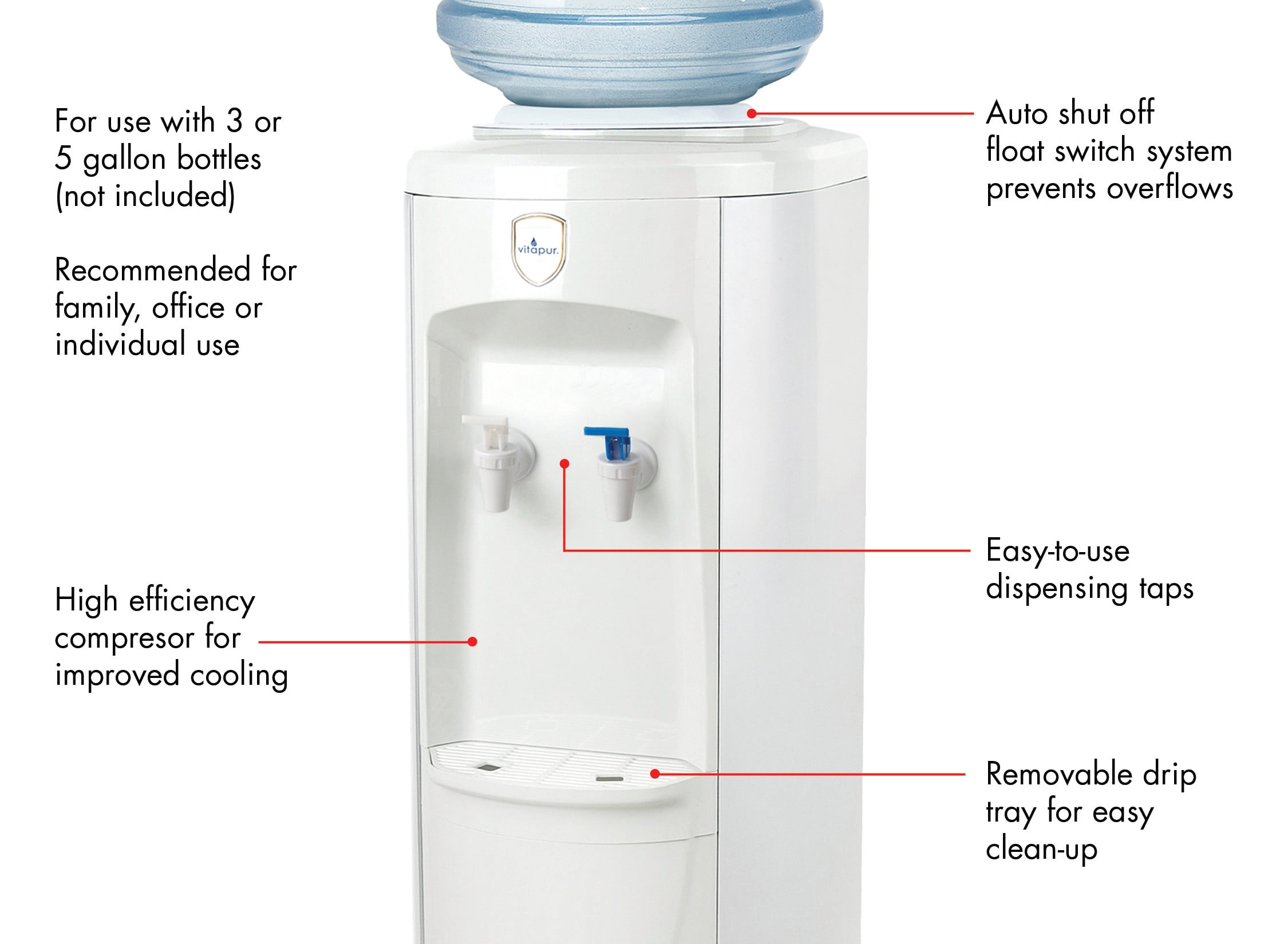 Dual taps for your choice of cold or room temperature water High efficiency compressor and adjustable thermostat for improved cooling Stainless steel reservoirs for superior long-lasting reliability