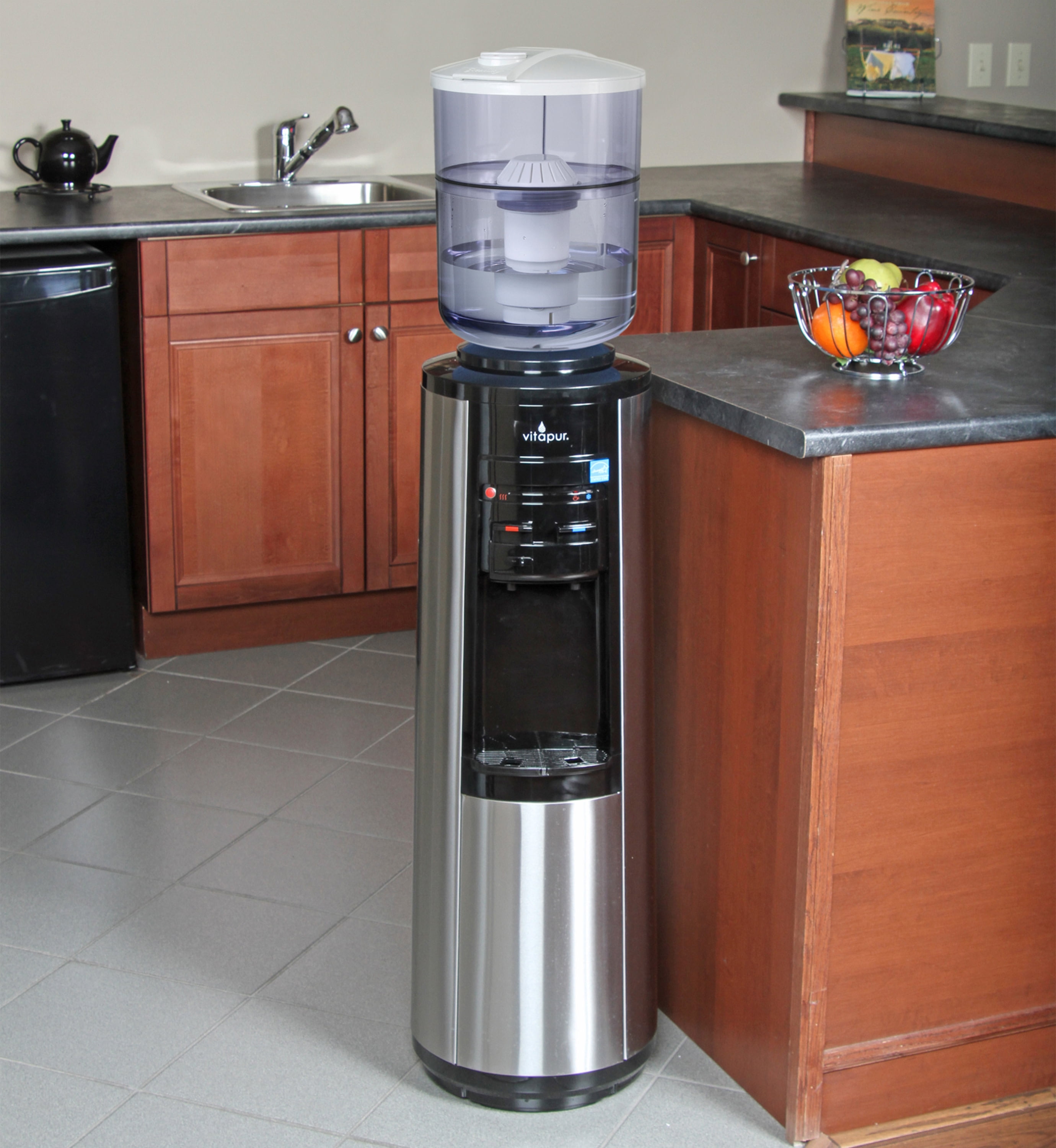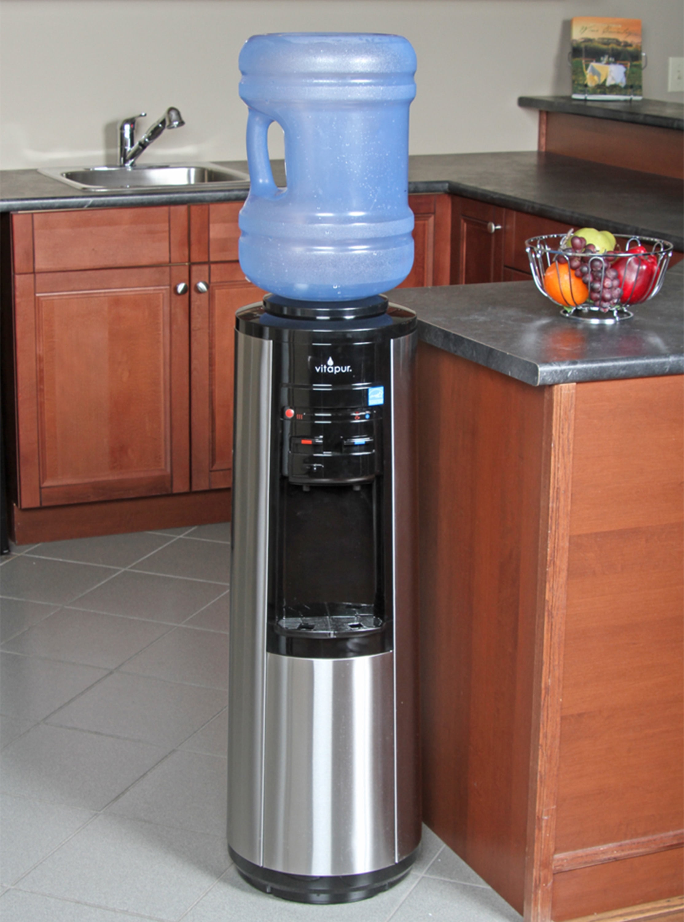 Vitapur VWD5446BLS Top Load Water Dispenser (Hot, Room and Cold) Stainless Steel Hot water in 3 minutes Patented energy-saving kettle feature rapidly provides hot water on demand in under three minutes without the cost of constantly re-heating water Stainless steel cabinet matches high-end kitchen appliances Easy-to-use push buttons controls High efficiency compressor for improved cooling Anti-fingerprint stainless steel panels stay clean Stainless steel reservoirs for superior long-lasting reliability Hot, cold, and room temperature water dispensing with lights that indicate when water is ready to dispense at ideal temperature Child safety lock prevents accidental hot water dispensing For use with 3, 4 or 5 gallon (12, 15 or 19 liter) water bottles. Support collar prevents leaking Energy Star compliant Reservoir Capacity (cold): 0. 66 gal Reservoir Capacity (room): 0. 16 gal Reservoir Capacity (hot): 0. 16 gal Temperature (cold): 39-50 °F Temperature (hot): 198-202 °F Dimensions (inches): 12. 6×12. 8×37. 8 Compatible with Vitapur GWF8BLK filtration system.
