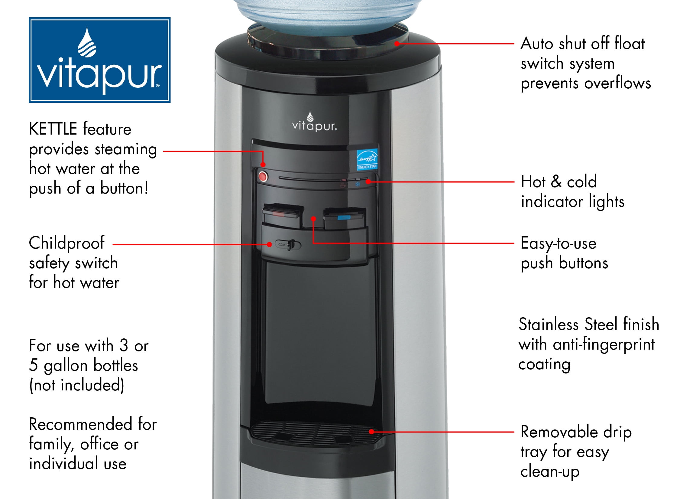 Save energy and money while enjoying great-tasting water with the Vitapur VWD5446BLS stainless steel top-load standing water dispenser. This unit features tri-temperature dispensing, an LED night light, stylish push-button controls and provides easy access to refreshing water around the clock. It also features a stainless steel cabinet that matches high-end kitchen decor and has a patented kettle feature that uses 78% less energy than traditional water dispensers and gives you hot water in under three minutes. It can accommodate a 3, 4 or 5 gallon water bottle. This dispenser is also compatible with Vitapur GWF8BLK filtration system.