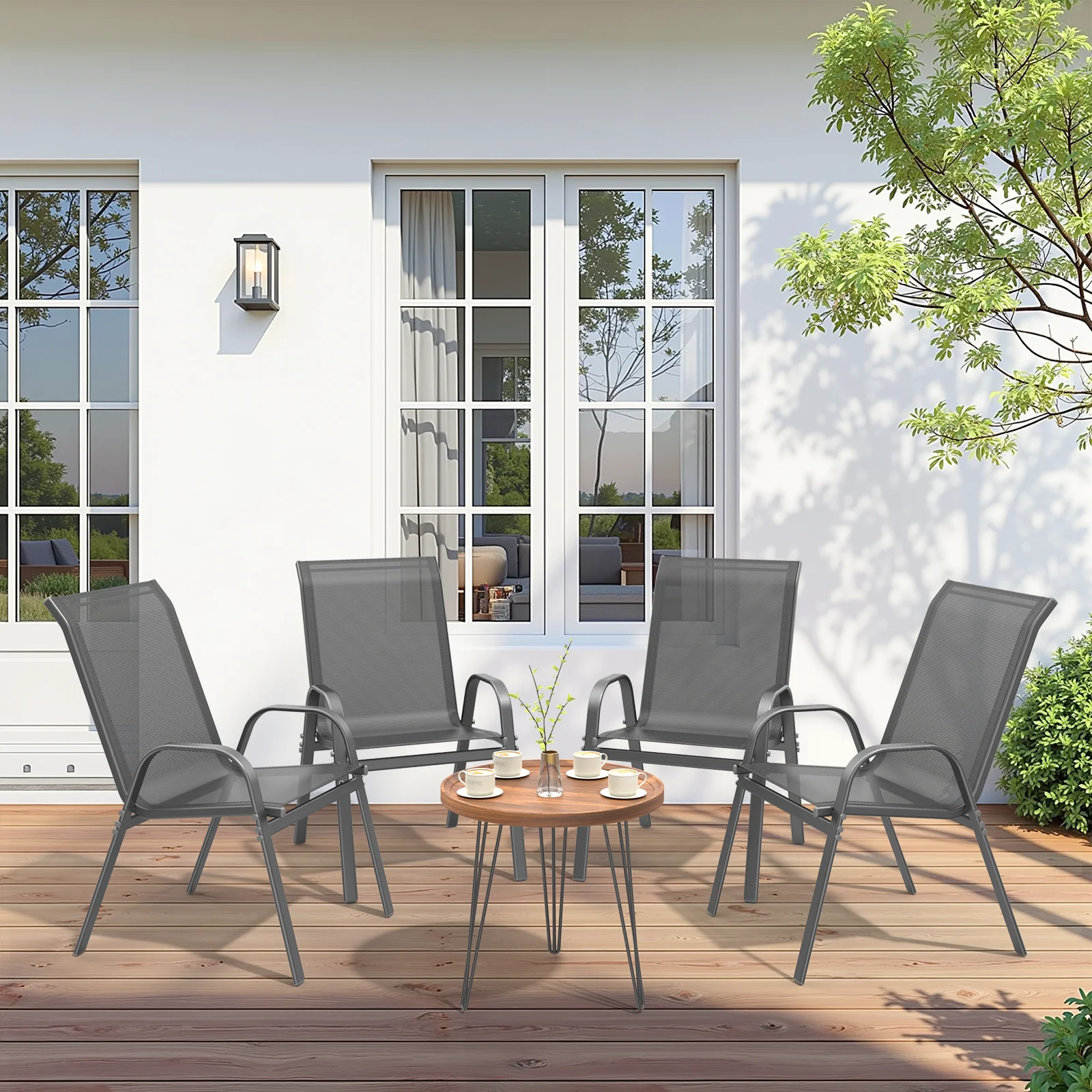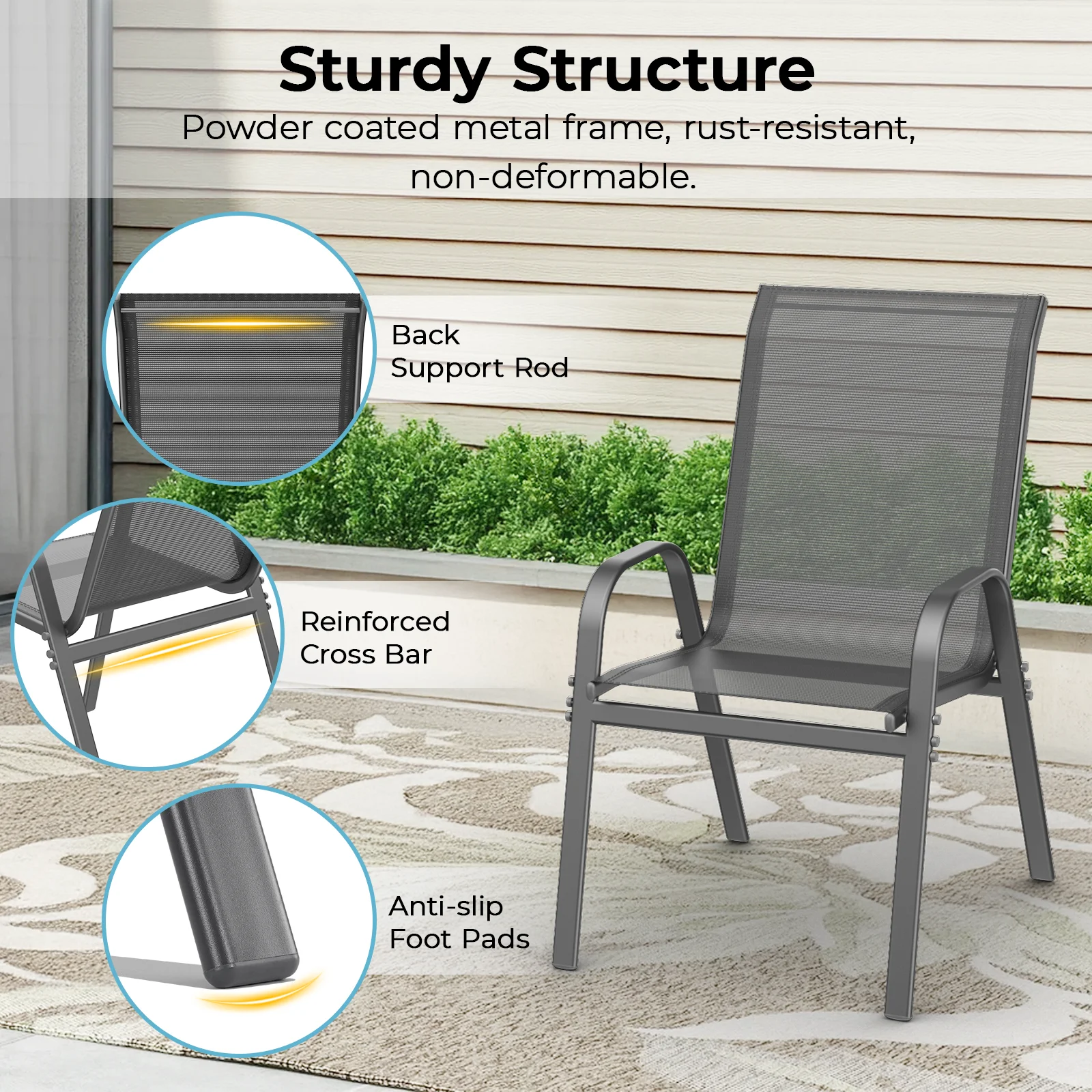 Specification: Type: Stackable Dining Chairs Set of 4 Color: Gray Material: Textilene Fabric, Metal Overall Dimensions of Each Chair: 21.7 x 25.5 x 36.5 inch (D x W x H) Seat Height: 16.5 inch Net Weight of Each Chair: 8.5 pounds Weight Capacity of Each Chair: 300 pounds Style: Simple and Modern Product Care Instructions: Wipe With a Dry Cloth. Package Includes: 4 x Patio Stacking Chairs 1 x Instruction