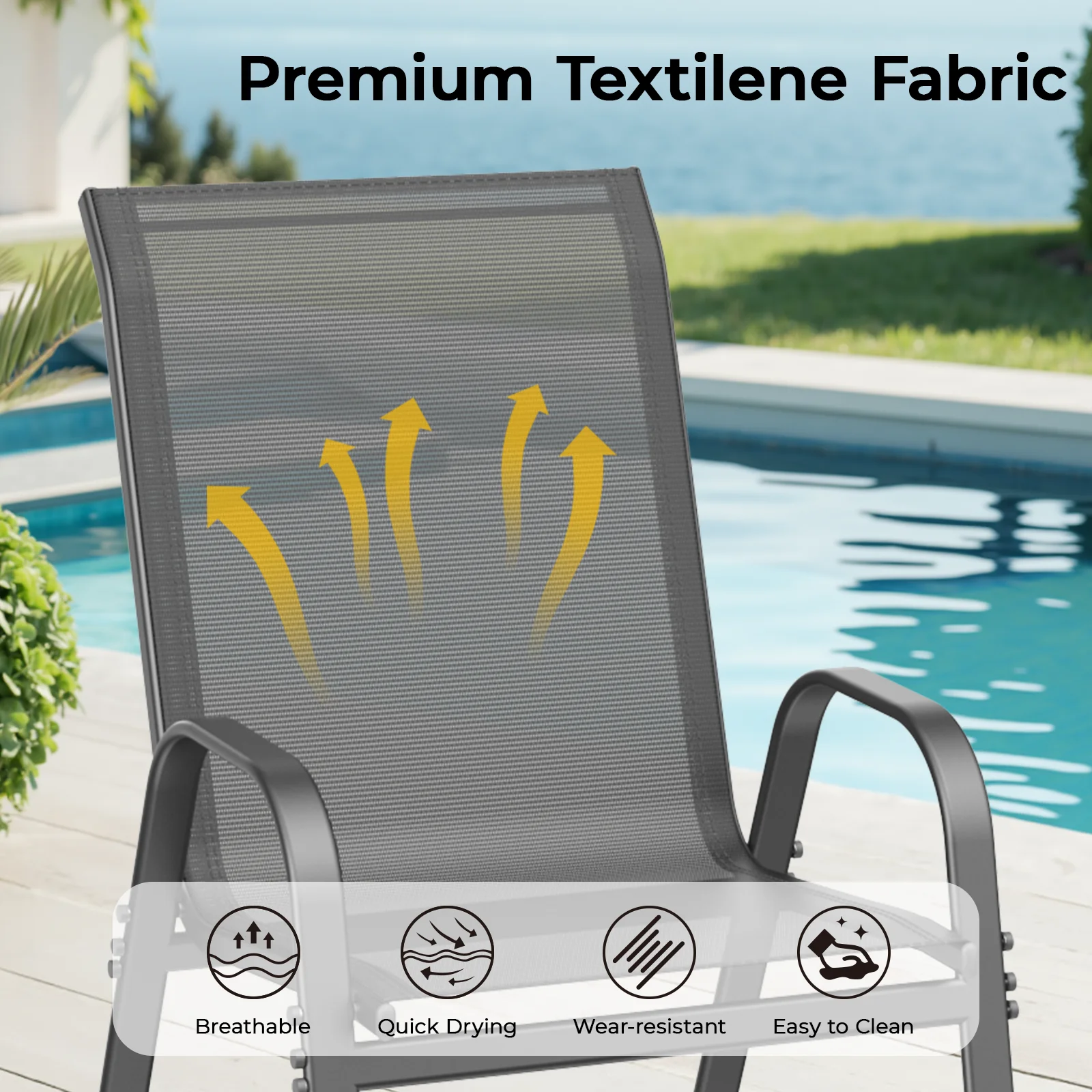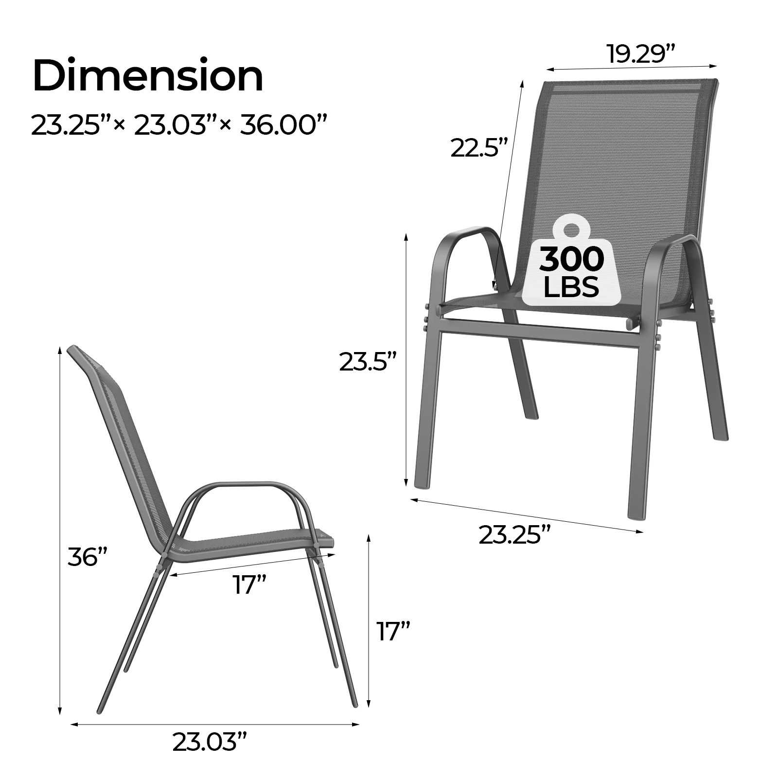 Features: Save Space: The outdoor chairs adopt a stackable design, which is convenient for storage and saves space. Lightweight: The outdooe stacable chairs are lightweight, easy to move, it is rust-proof, durable and low maintenance. Ergonomic Design: The lawn chairs feature tilted high back and spacious seats, perfectly fitting your body lines and offering deep relaxation. Curved Armrests: With ergonomic curved armrest, which can support your arms, let your arms can stretch naturally, enjoy the ultimate comfort. Extra Wide Seats: The widened 19.29 inch seats are more spacious and offer you a more comfortable experience. Textilene Fabric: The stacking dining chair with textilene fabric seat and backrest, it is comfortable, breathable and skin-friendly, quickly drying, you will not sweat even sitting for a long time in summer. Sturdy Metal Frame:The sturdy anti-rust steel frame is stable and durable, each stacking chair can bear up to 300 lbs. Non-slip Foot Pads:Equipped with non-slip pads, it not only prevents the stackable dining chairs from sliding when in use, but also stops scratching the floor. Backrest Support Rod:The sturdy backrest support rods provide strong support for the backrests of outdoor metal chairs and prevent collapse. Easy to Assemble: Each part is labeled and marked, you can put together the stackable chairs set of 4 easily according to the instruction.