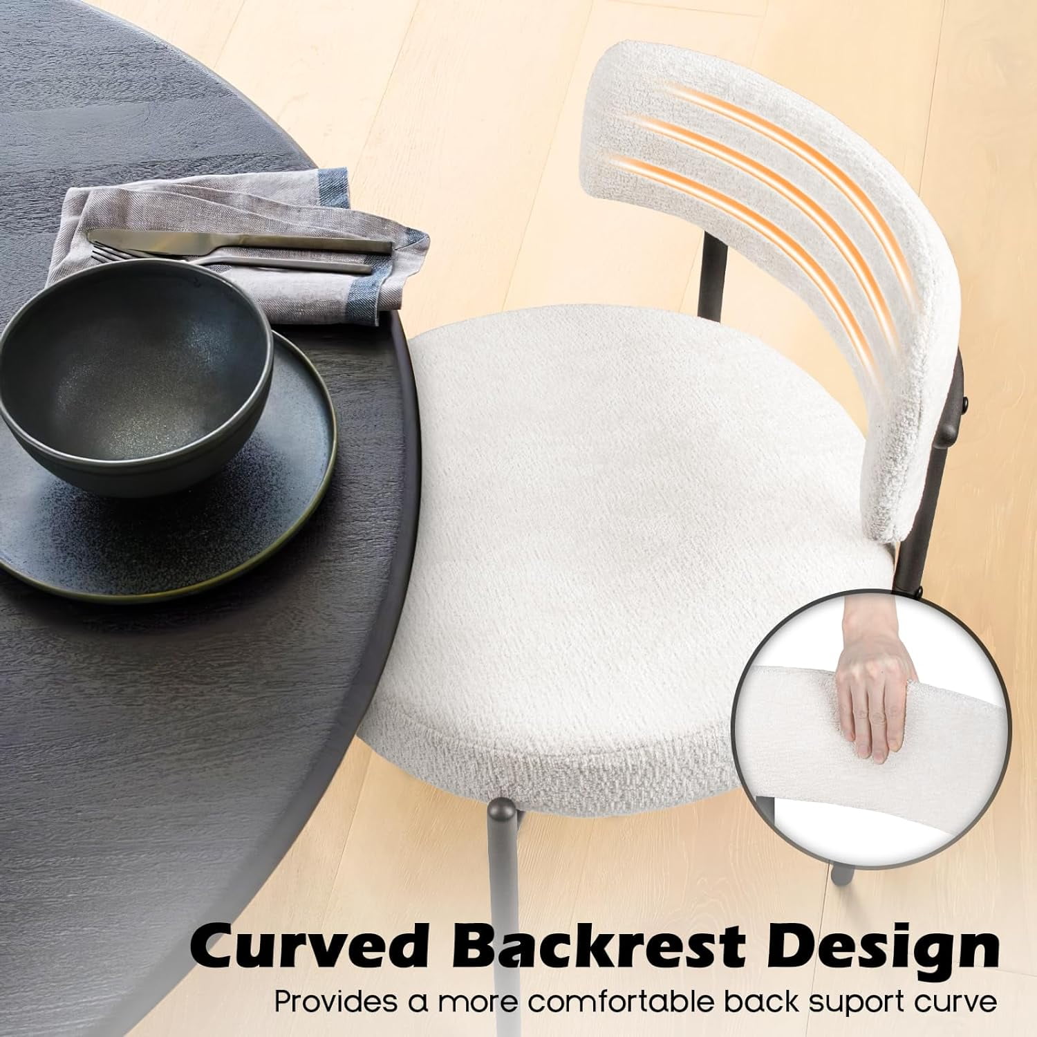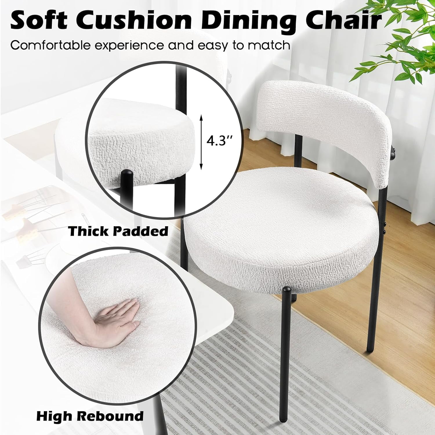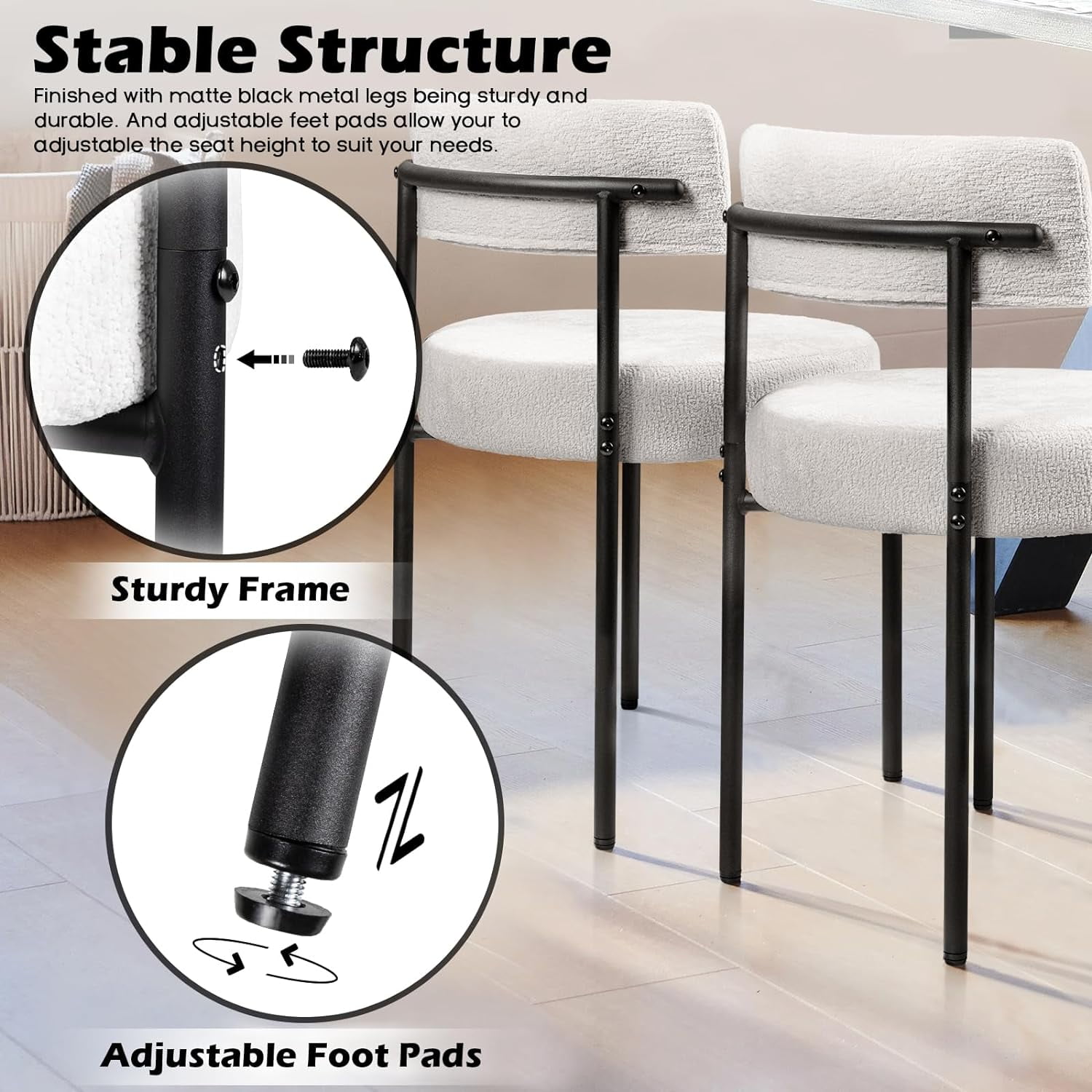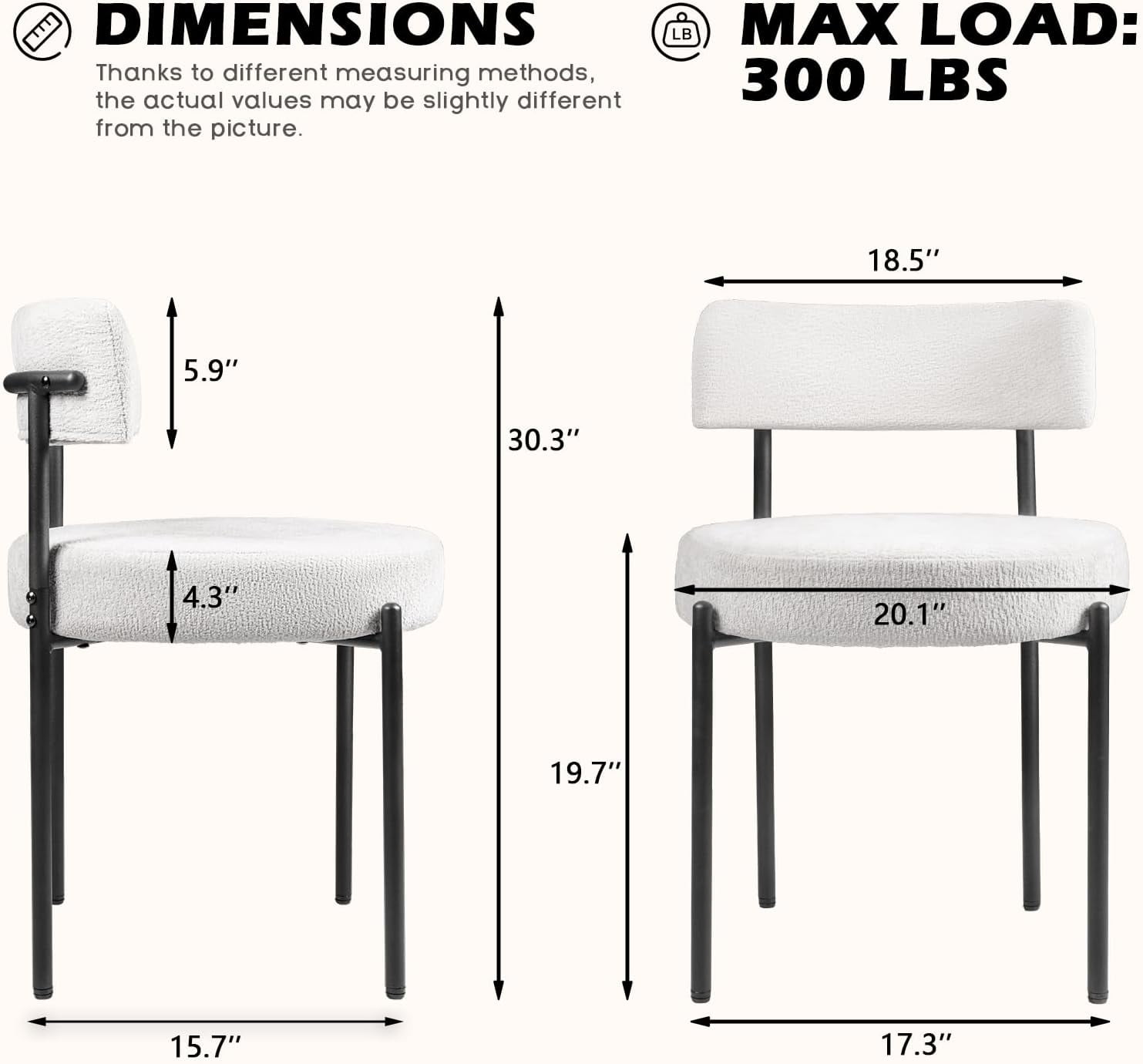 Vitesse Mid Century Modern Metal Dining Side Chairs, White (Set of 2) Thickened cushion with a diameter of 3.94 inches, filled with high-density resilience sponge for durability and comfort Soft and skin-friendly teddy boucle fabric surface for an unparalleled dining experience Curved backrest design that fits your back well, providing ample foam padding to relieve back fatigue Adjustable foot pads on the legs ensure stability on uneven floors and prevent scratches on surfaces Sturdy matte black metal legs combine modern aesthetics with lightweight construction, supporting a weight capacity of up to 330 lbs Easy assembly with provided hardware and detailed instructions for a hassle-free setup