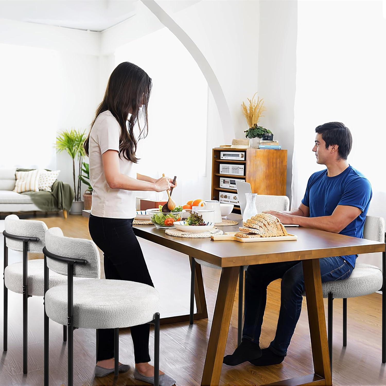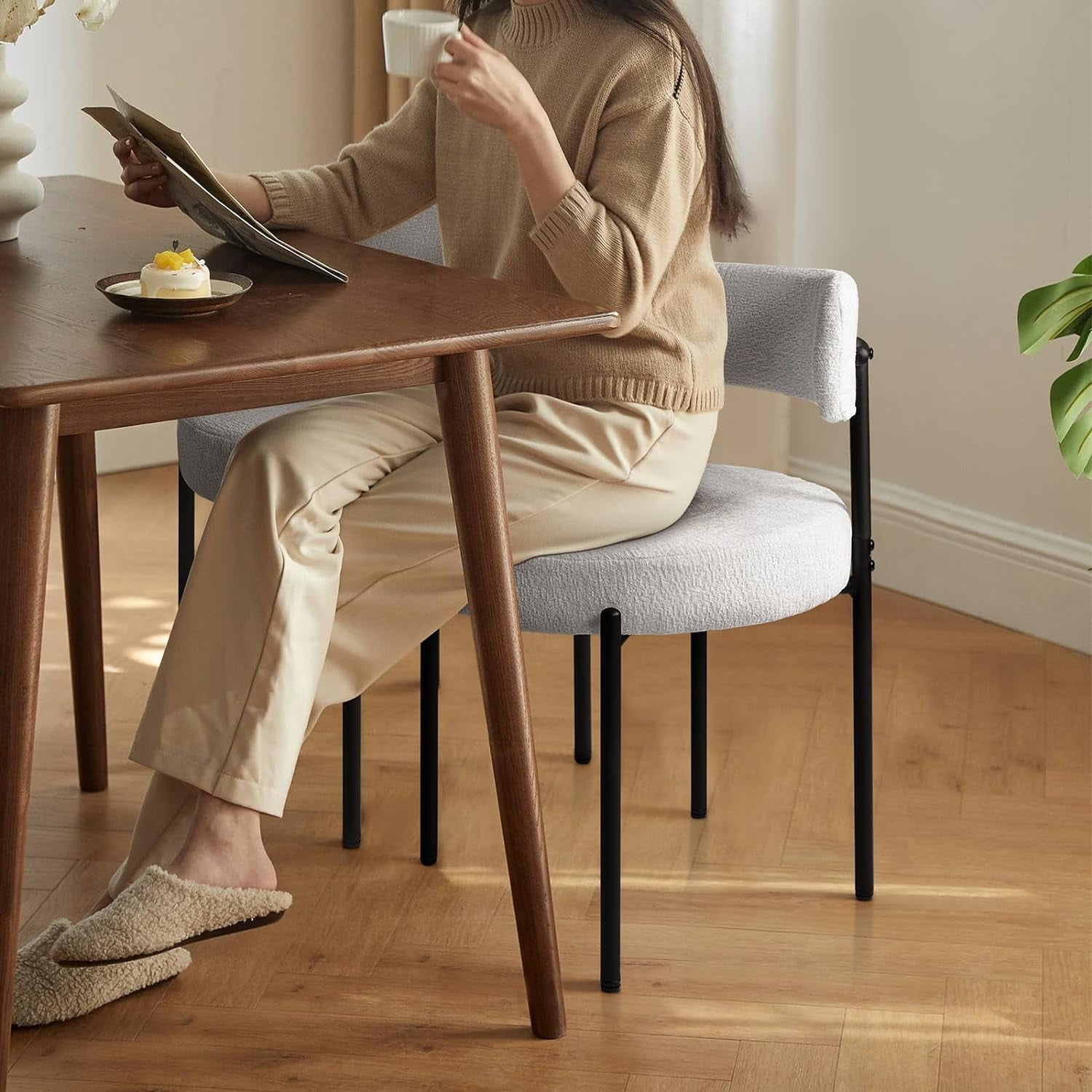 Liven up your dining area with this boucle fabric dining chair. This mid-century modern dining chair with a curved back designed to create beautiful curves will fit your back nicely when you eat and rest. Round cushioned, the backrest is padded with foam, so your back won’t feel hard when you lean back in the chair. Its rounded appearance gives it a contemporary look perfect for any modern living space. This chair is just the right height to kick back and enjoy your meal. Don’t miss out on this must-have addition to your dining room! Specifications: Color: White/ Black/Beige/Grey Frame Material: Metal Seat Thickness: 3.94″ Weight Capacity: 330lbs Seat Dimension:20.1″x20.1″ Overall Dimension: 20.1″ x 20.1″ x 30″ Package Included: 2 x dining chairs 1 x Install Instruction