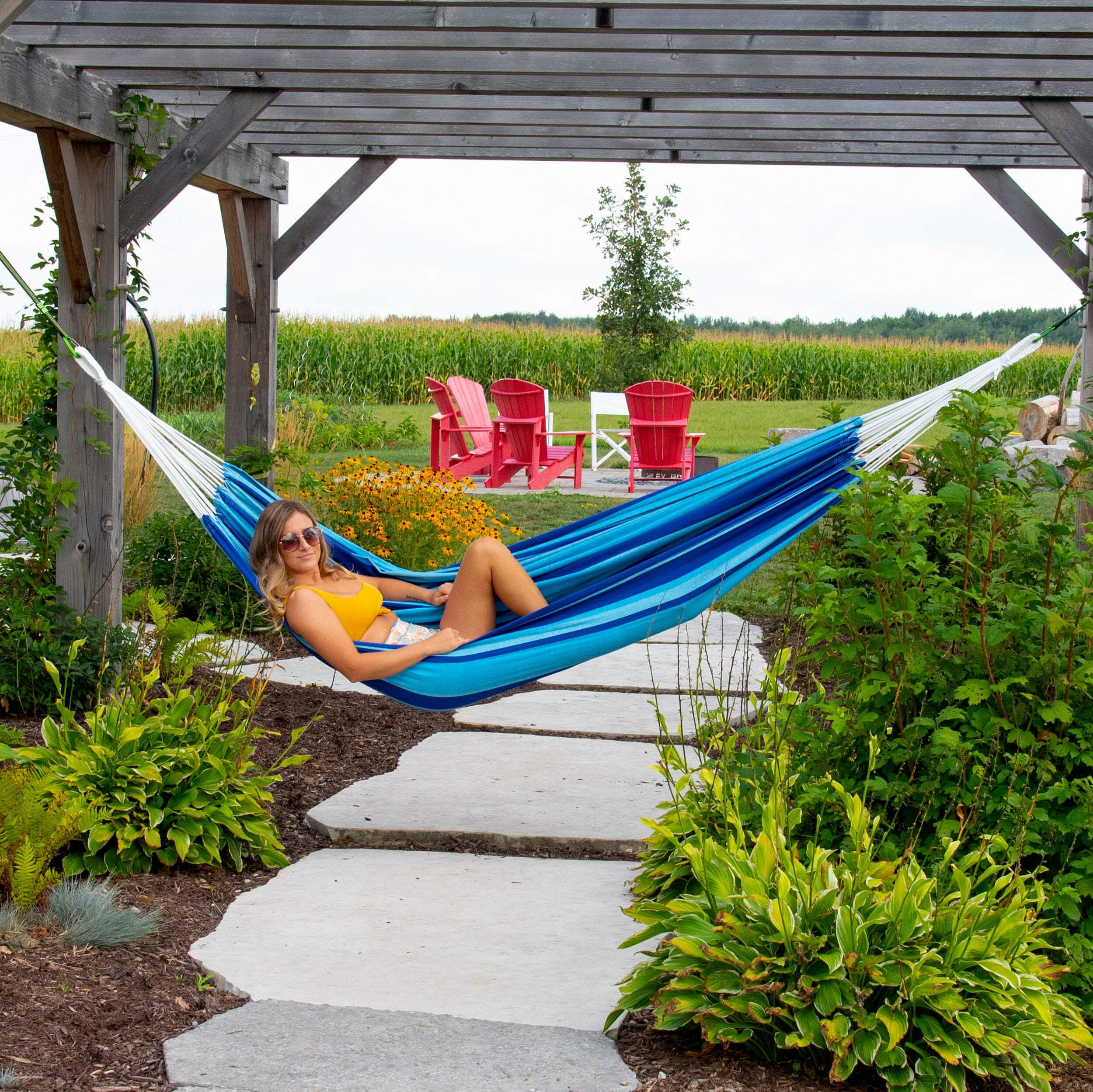 Stunning colours make this hammock the highlight of the yard. Pairs with Eco-Friendly Tree Straps or Ultra-Lite Tree Straps to expand your relaxation zone. 100% cotton to give you the comfort of indoors while appreciating the lively outdoors. Tightly woven and durable fabric; delicate on the skin, strong to the elements.