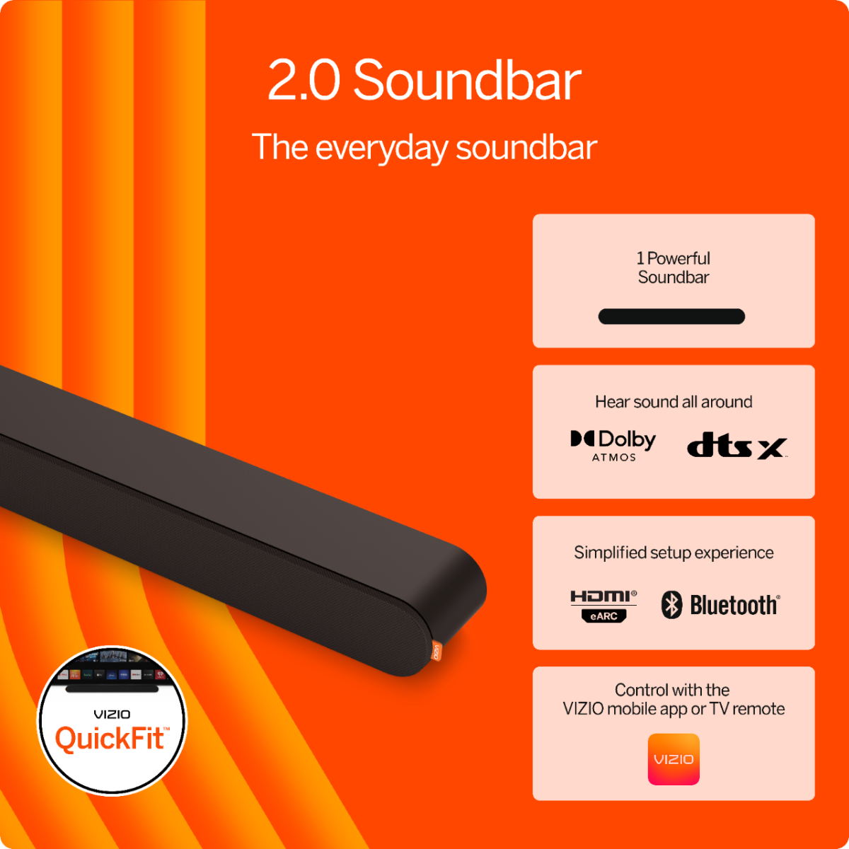 Step into sensational sound with the VIZIO 2.0 Soundbar featuring Dolby Atmos & DTS:X, ClearDialog, and a versatile, low-profile design that fits effortlessly into any space. Connect to your TV with the included HDMI eARC cable, stream music, audiobooks and more with Bluetooth, and download the VIZIO mobile app for soundbar control using your smartphone.