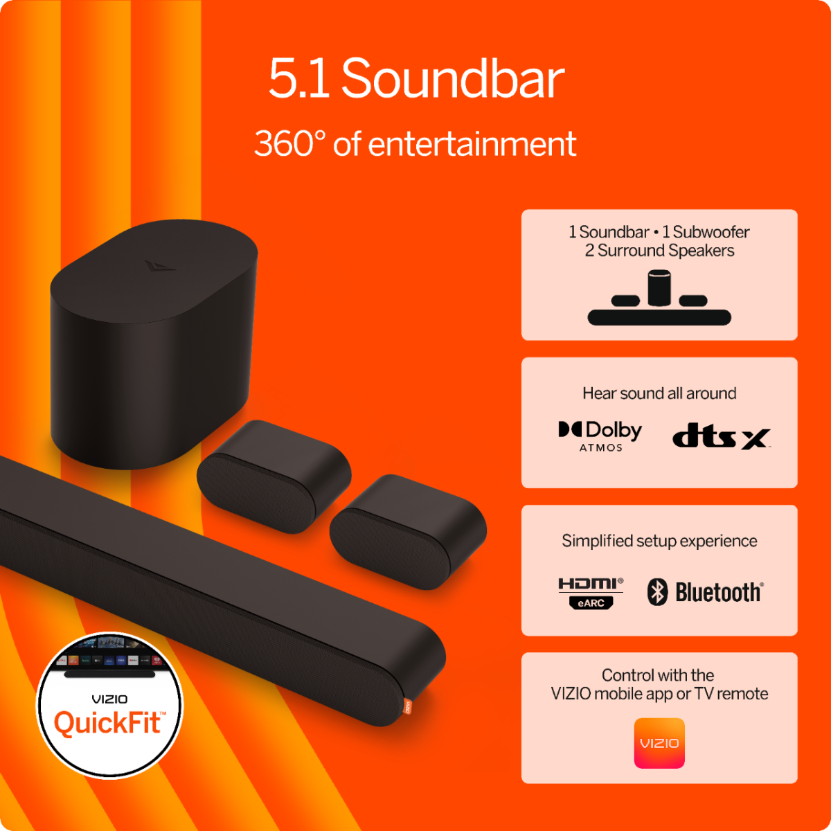 Experience immersive sound all around with Dolby Atmos 3D audio, a wireless subwoofer, and two surround speakers that deliver true 360-degree immersive surround sound. Connect to your TV with the included HDMI eARC cable, stream music, audiobooks and more with Bluetooth, and download the VIZIO mobile app for soundbar control using your smartphone.