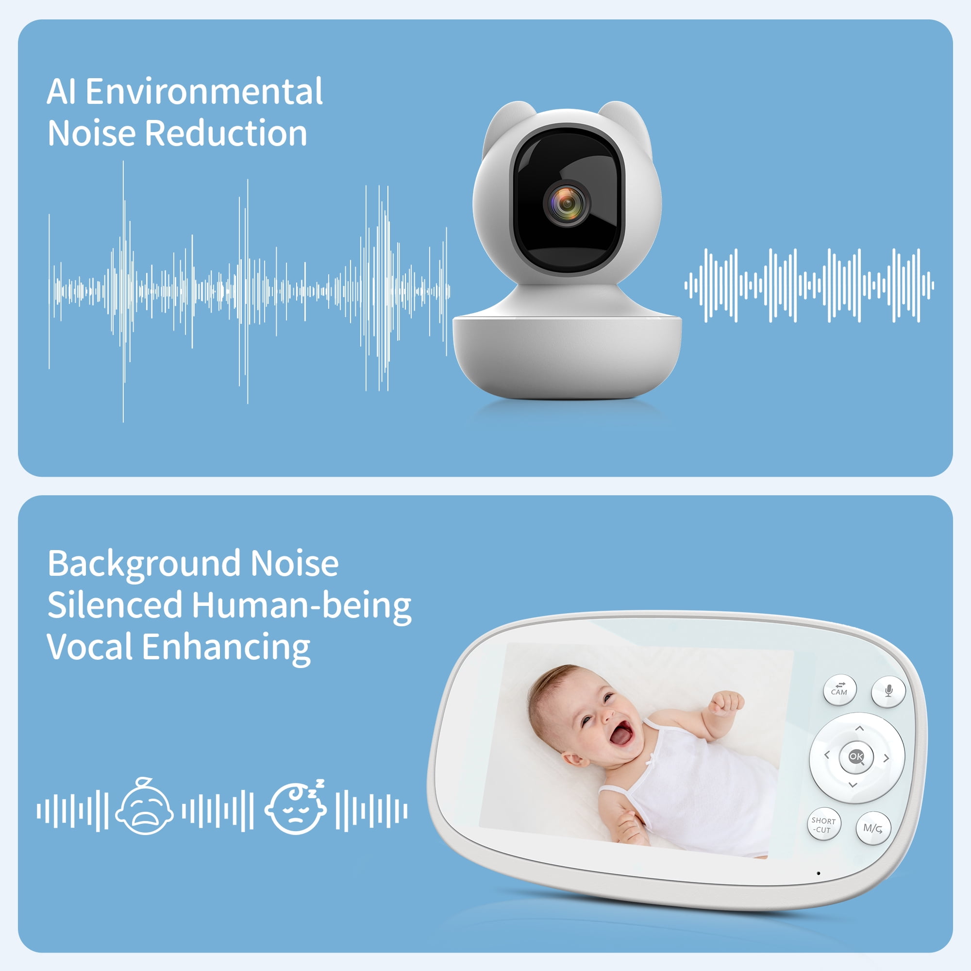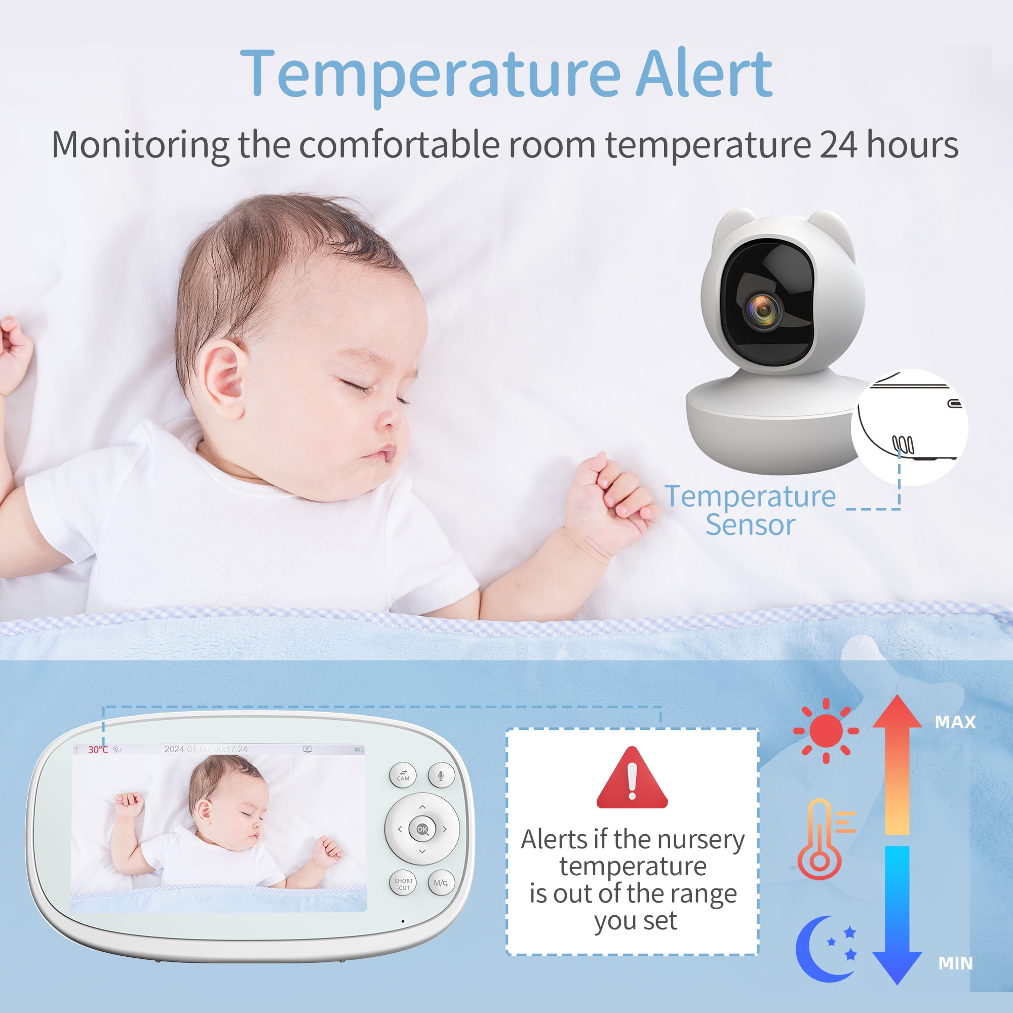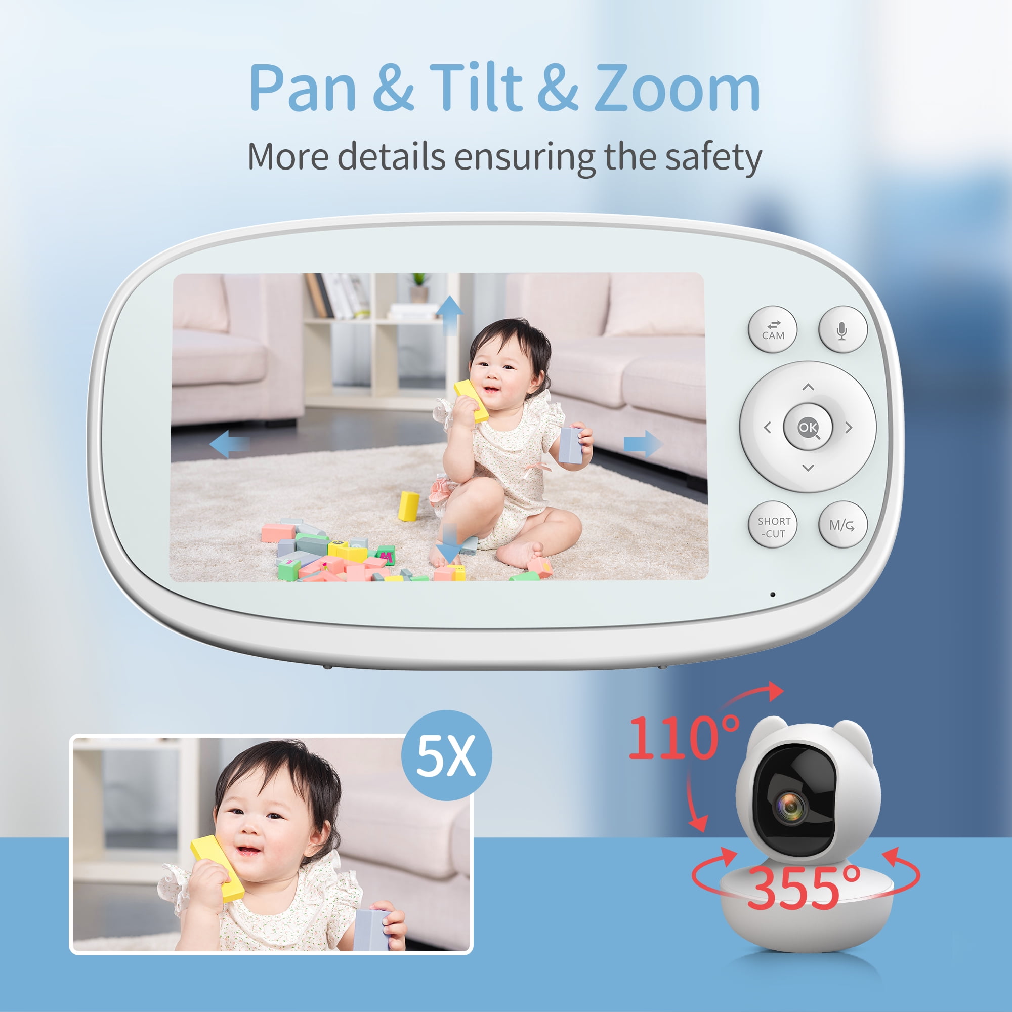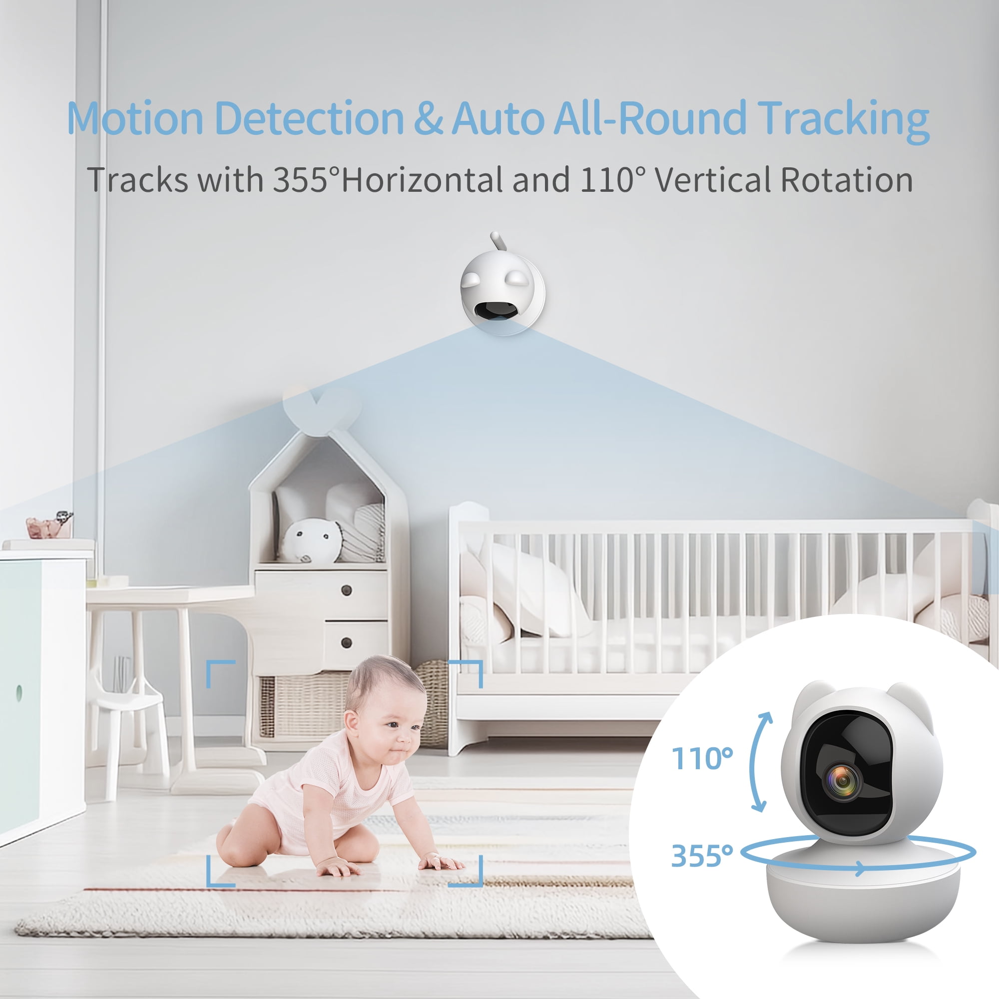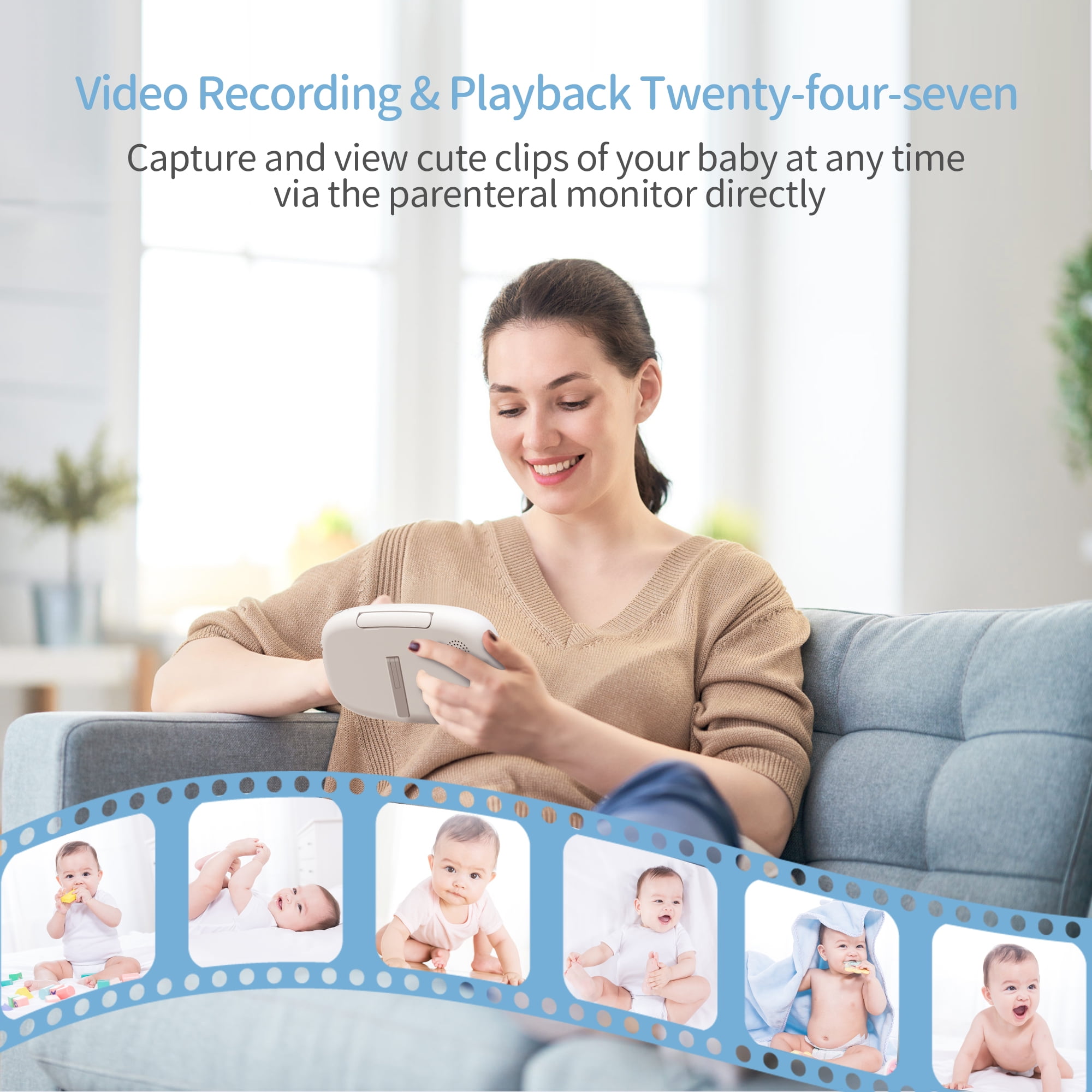 Stay connected with your little one using the 2-way talk audio feature.The built-in microphone lets you hear and soothe your baby, while the AI noise reduction technology ensures clear communication on both ends. Never miss a moment with the motion detection auto-tracking feature. The camera lens pans 355° and tilts 110° to capture all corners of the room, automatically tracking your baby’s movements. You can also set a virtual safety fence to receive alerts if your baby leaves the designated safe area. Maintain a comfortable environment for your baby with the temperature sensor display and alarm. The monitor will alert you if the room temperature goes outside the range you’ve set, allowing you to make adjustments as needed. Capture and revisit precious memories with the local video recording and playback capabilities. The camera can store footage on a Micro SD card (up to 128GB), and you can directly playback or rewind the recordings on the parent monitor. Additionally, enjoy the 10 soothing lullabies to help your baby relax and fall asleep. Stay connected with your baby even when you’re away from the nursery. The monitor’s long-lasting battery life and extended range of up to 1200 feet in open space allow you to move freely while keeping an eye on your little one. You can also set a time reminder to help you stay on top of feeding, diaper changes, and other important tasks. Customize your viewing experience with the 5X zoom-in feature and the split-screen option that allows you to monitor up to 4 cameras simultaneously. Enjoy a clear, detailed view of your baby from any angle in your home. Warm Tips 1. We suggest that the parental video monitor and camera had better keep at least 5m distance (otherwise if too close, it will be easy to hear the buzzing or beep sound or be a cacophony). 2. The parental video monitor and the baby camera are configured for monitoring right out of the package box, no pairing or connection required. NO WiFi and NO APP needed. The baby camera can be set up on a desktop or mounted on a wall. 3. When hearing the alarm sounds and you need to pause the alarm with one click, please press the “OK” button on the parental video monitor. 4. The objective auto track function and the virtual safety fence function can not work at the same time. When one of these two functions is on, the other one will be off by default.