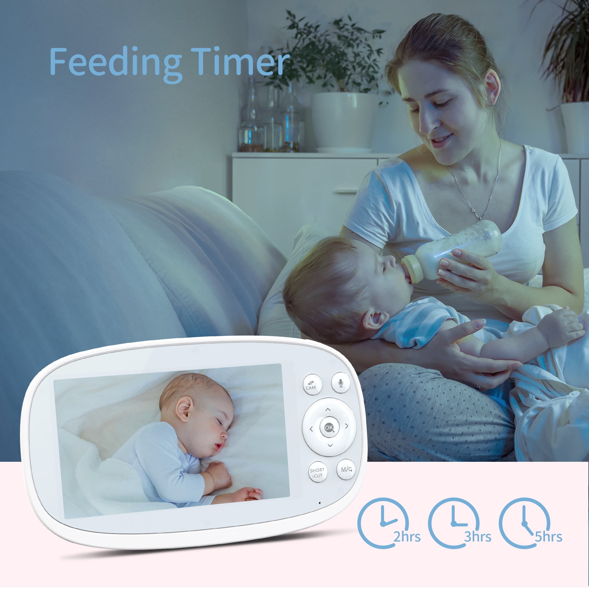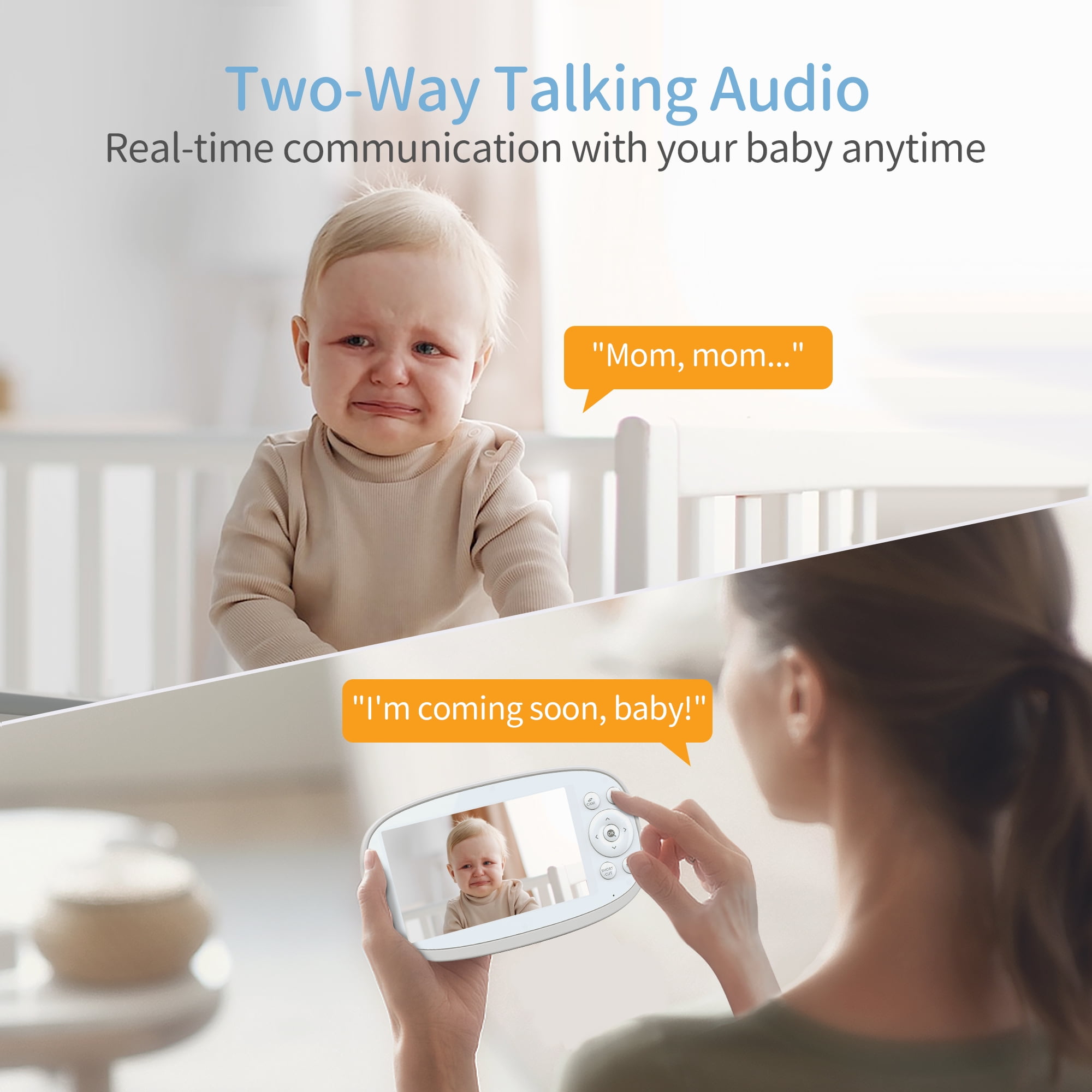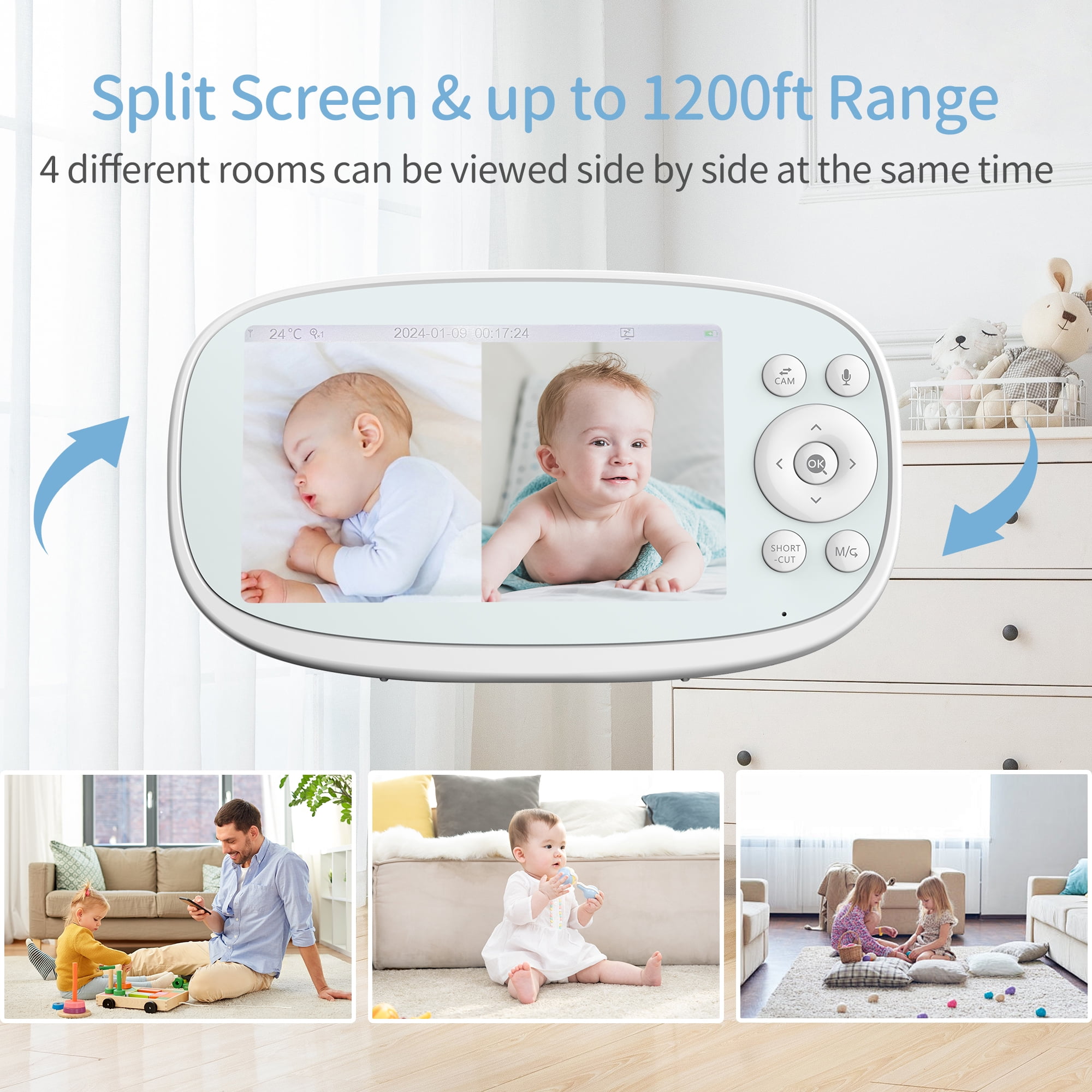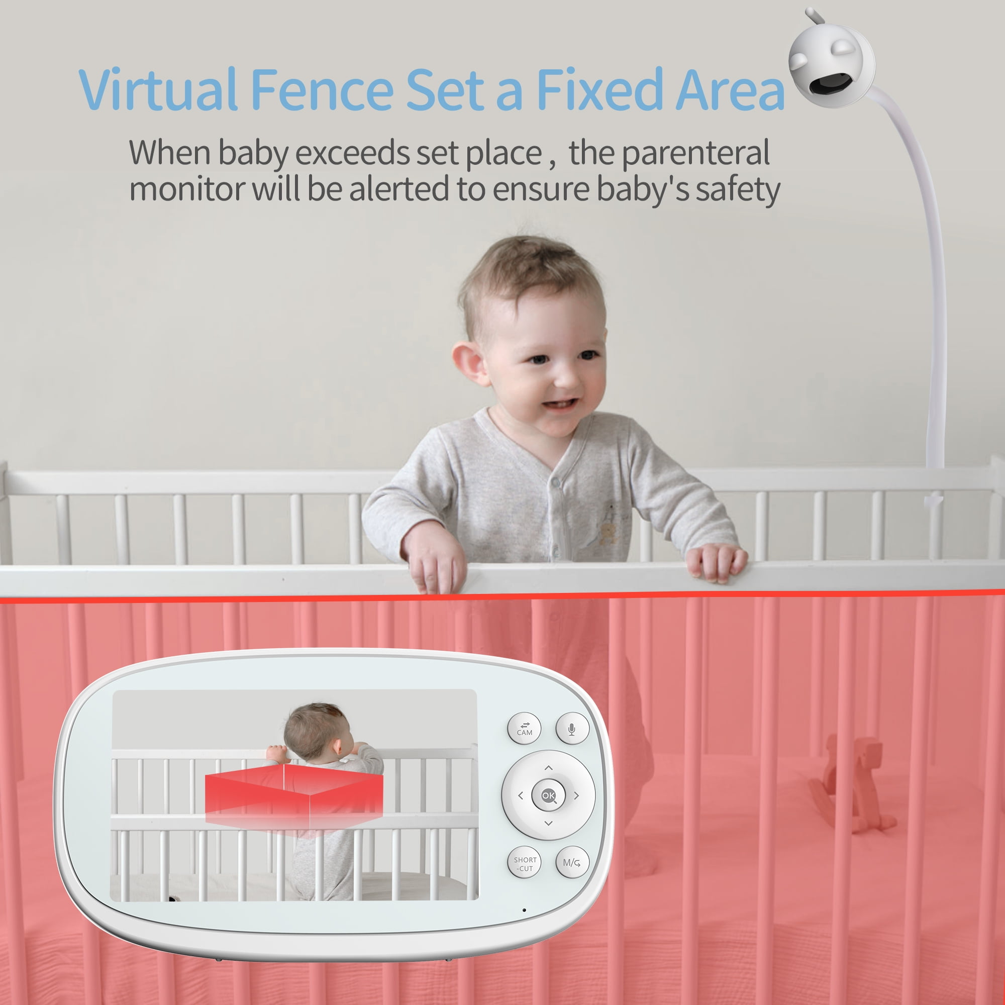 Stay connected with your little one using the 2-way talk audio feature.The built-in microphone lets you hear and soothe your baby, while the AI noise reduction technology ensures clear communication on both ends. Never miss a moment with the motion detection auto-tracking feature. The camera lens pans 355° and tilts 110° to capture all corners of the room, automatically tracking your baby’s movements. You can also set a virtual safety fence to receive alerts if your baby leaves the designated safe area. Maintain a comfortable environment for your baby with the temperature sensor display and alarm. The monitor will alert you if the room temperature goes outside the range you’ve set, allowing you to make adjustments as needed. Capture and revisit precious memories with the local video recording and playback capabilities. The camera can store footage on a Micro SD card (up to 128GB), and you can directly playback or rewind the recordings on the parent monitor. Additionally, enjoy the 10 soothing lullabies to help your baby relax and fall asleep. Stay connected with your baby even when you’re away from the nursery. The monitor’s long-lasting battery life and extended range of up to 1200 feet in open space allow you to move freely while keeping an eye on your little one. You can also set a time reminder to help you stay on top of feeding, diaper changes, and other important tasks. Customize your viewing experience with the 5X zoom-in feature and the split-screen option that allows you to monitor up to 4 cameras simultaneously. Enjoy a clear, detailed view of your baby from any angle in your home. Warm Tips 1. We suggest that the parental video monitor and camera had better keep at least 5m distance (otherwise if too close, it will be easy to hear the buzzing or beep sound or be a cacophony). 2. The parental video monitor and the baby camera are configured for monitoring right out of the package box, no pairing or connection required. NO WiFi and NO APP needed. The baby camera can be set up on a desktop or mounted on a wall. 3. When hearing the alarm sounds and you need to pause the alarm with one click, please press the “OK” button on the parental video monitor. 4. The objective auto track function and the virtual safety fence function can not work at the same time. When one of these two functions is on, the other one will be off by default.