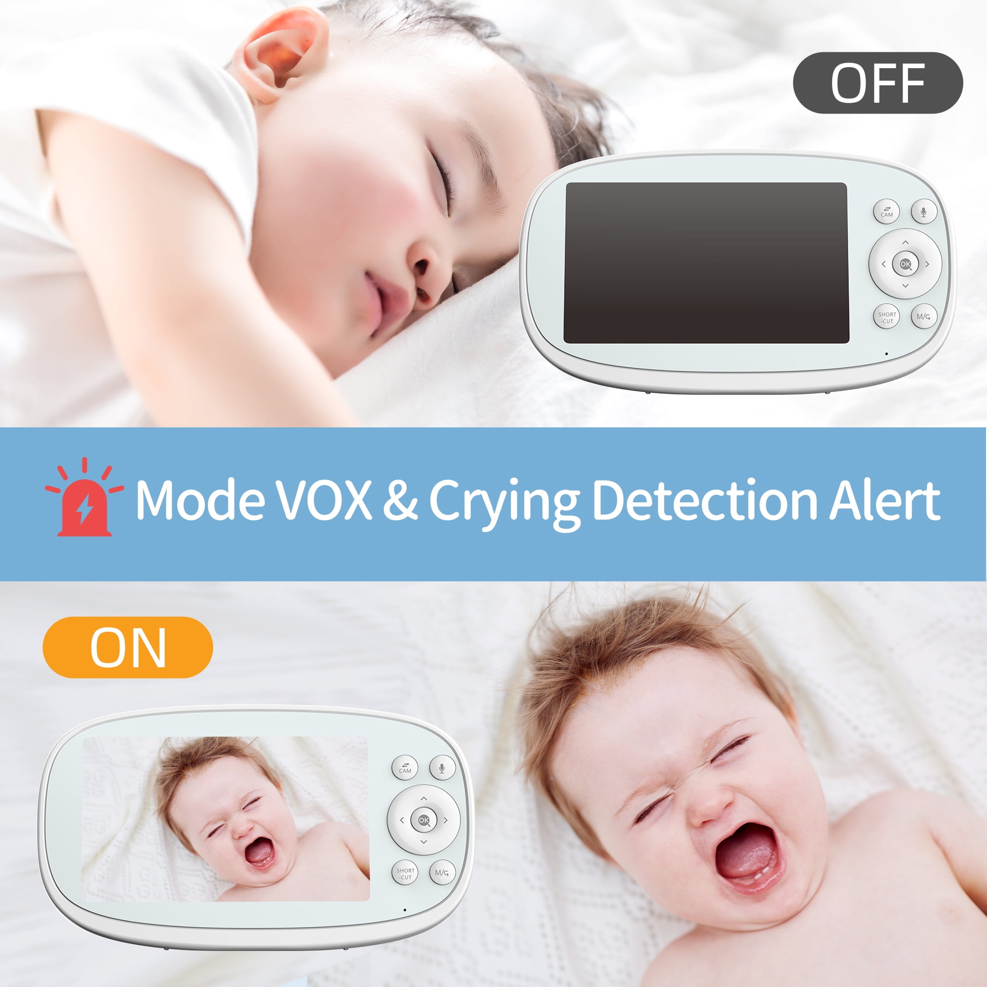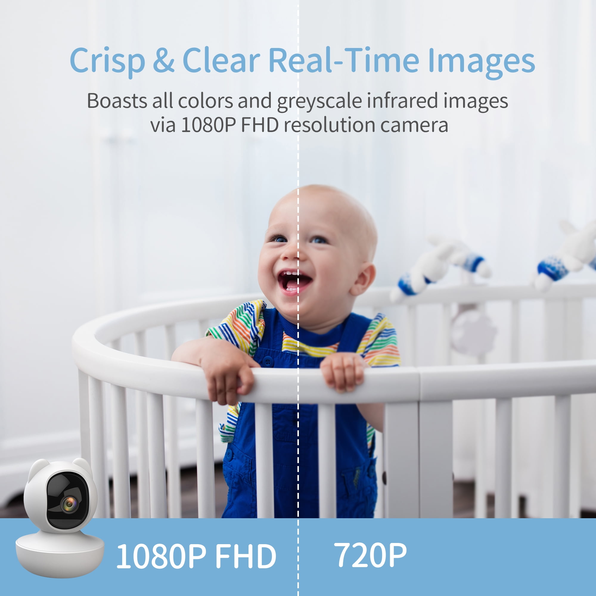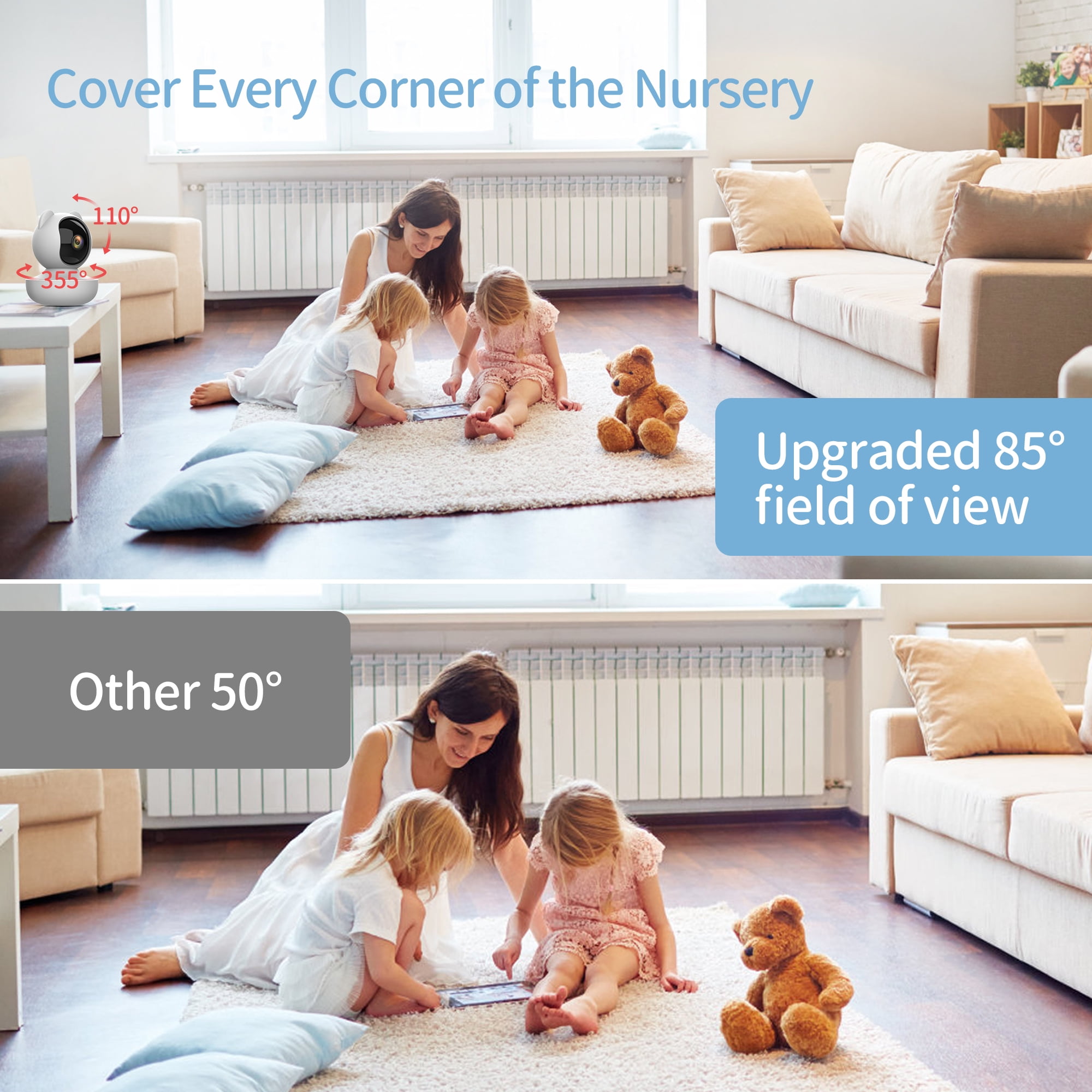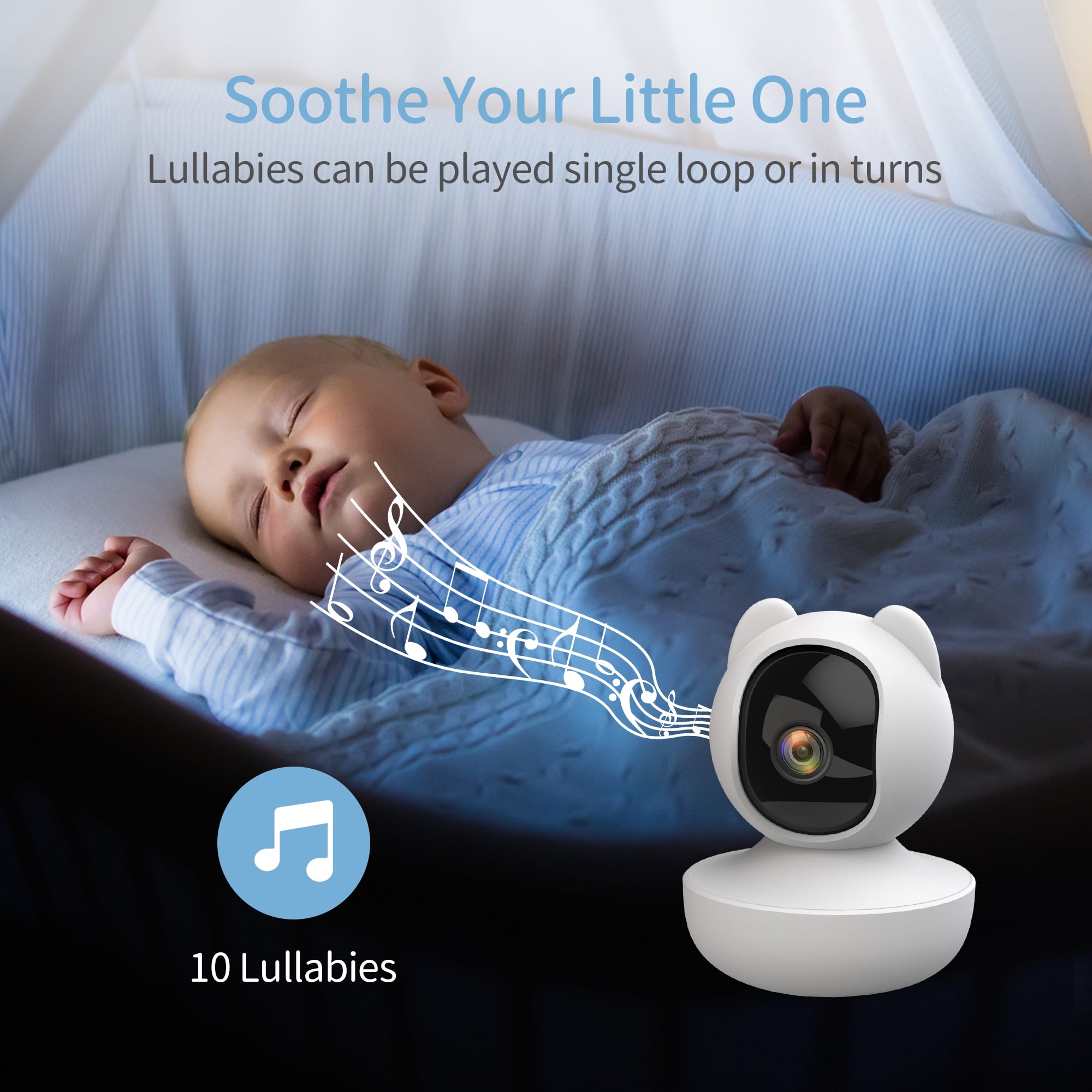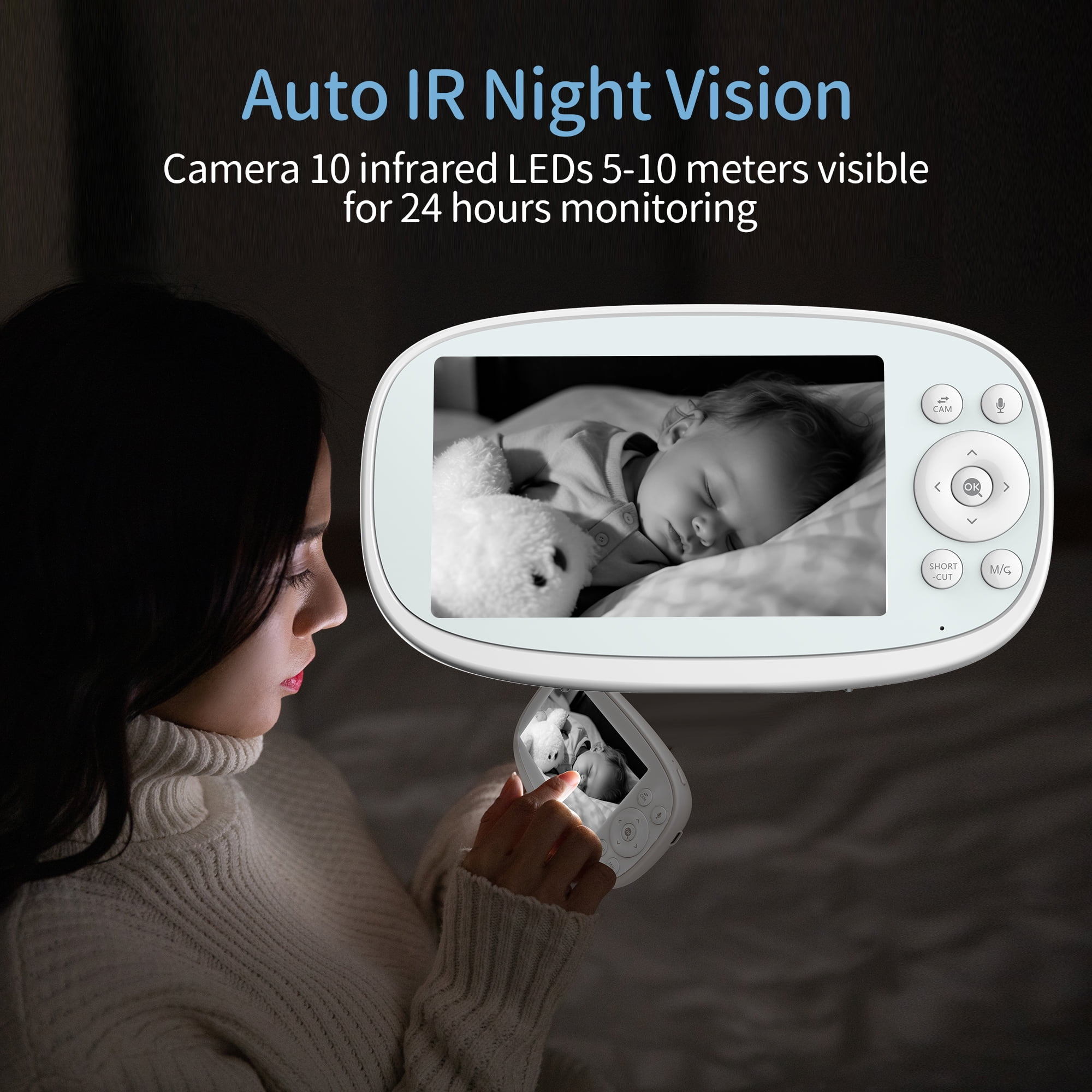 Stay connected with your little one using the 2-way talk audio feature.The built-in microphone lets you hear and soothe your baby, while the AI noise reduction technology ensures clear communication on both ends. Never miss a moment with the motion detection auto-tracking feature. The camera lens pans 355° and tilts 110° to capture all corners of the room, automatically tracking your baby’s movements. You can also set a virtual safety fence to receive alerts if your baby leaves the designated safe area. Maintain a comfortable environment for your baby with the temperature sensor display and alarm. The monitor will alert you if the room temperature goes outside the range you’ve set, allowing you to make adjustments as needed. Capture and revisit precious memories with the local video recording and playback capabilities. The camera can store footage on a Micro SD card (up to 128GB), and you can directly playback or rewind the recordings on the parent monitor. Additionally, enjoy the 10 soothing lullabies to help your baby relax and fall asleep. Stay connected with your baby even when you’re away from the nursery. The monitor’s long-lasting battery life and extended range of up to 1200 feet in open space allow you to move freely while keeping an eye on your little one. You can also set a time reminder to help you stay on top of feeding, diaper changes, and other important tasks. Customize your viewing experience with the 5X zoom-in feature and the split-screen option that allows you to monitor up to 4 cameras simultaneously. Enjoy a clear, detailed view of your baby from any angle in your home. Warm Tips 1. We suggest that the parental video monitor and camera had better keep at least 5m distance (otherwise if too close, it will be easy to hear the buzzing or beep sound or be a cacophony). 2. The parental video monitor and the baby camera are configured for monitoring right out of the package box, no pairing or connection required. NO WiFi and NO APP needed. The baby camera can be set up on a desktop or mounted on a wall. 3. When hearing the alarm sounds and you need to pause the alarm with one click, please press the “OK” button on the parental video monitor. 4. The objective auto track function and the virtual safety fence function can not work at the same time. When one of these two functions is on, the other one will be off by default.