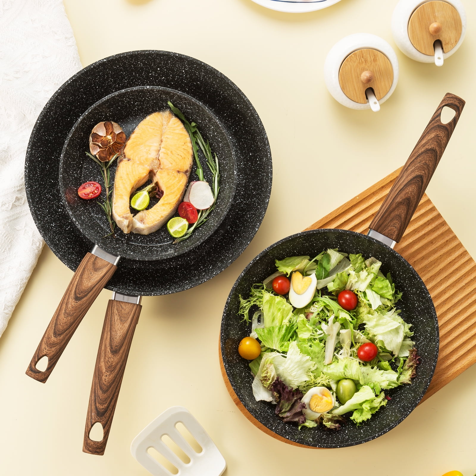 Included with the set: 8″ frying pan, 9.5″frying pan, 11″ frying pan Eco-friendly Ceramic Non-Stick Coating: SGS, TUV, BV certified products, 100% non-toxic, our cookware ensures your daily cooking being always safer and healthier. Suitable For All Stoves: High magnetic conductive stainless steel base allows our non stick kitchen cookware to work on all cooktops, like Electric, Halogen, Ceramic, Gas, Induction and Oven. The Extended and Thicken Bottom Design also makes the cookware durable and heats up quickly and evenly. Easy To Clean : Rivetless interior to prevent snags and food buildup. Just wipe it with a paper towel or rinse it with water, The pot body is also suitable for dishwashers (recommended without handle cleaning).