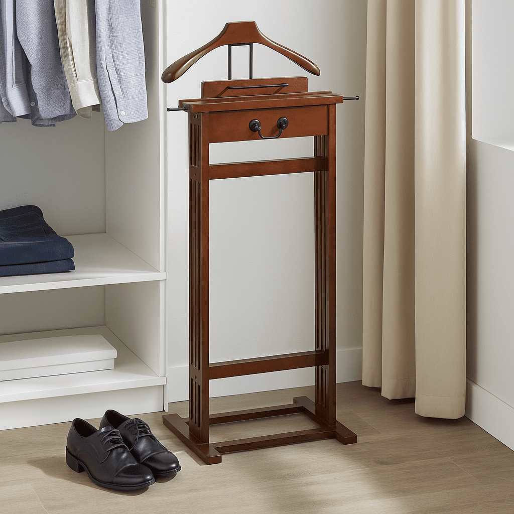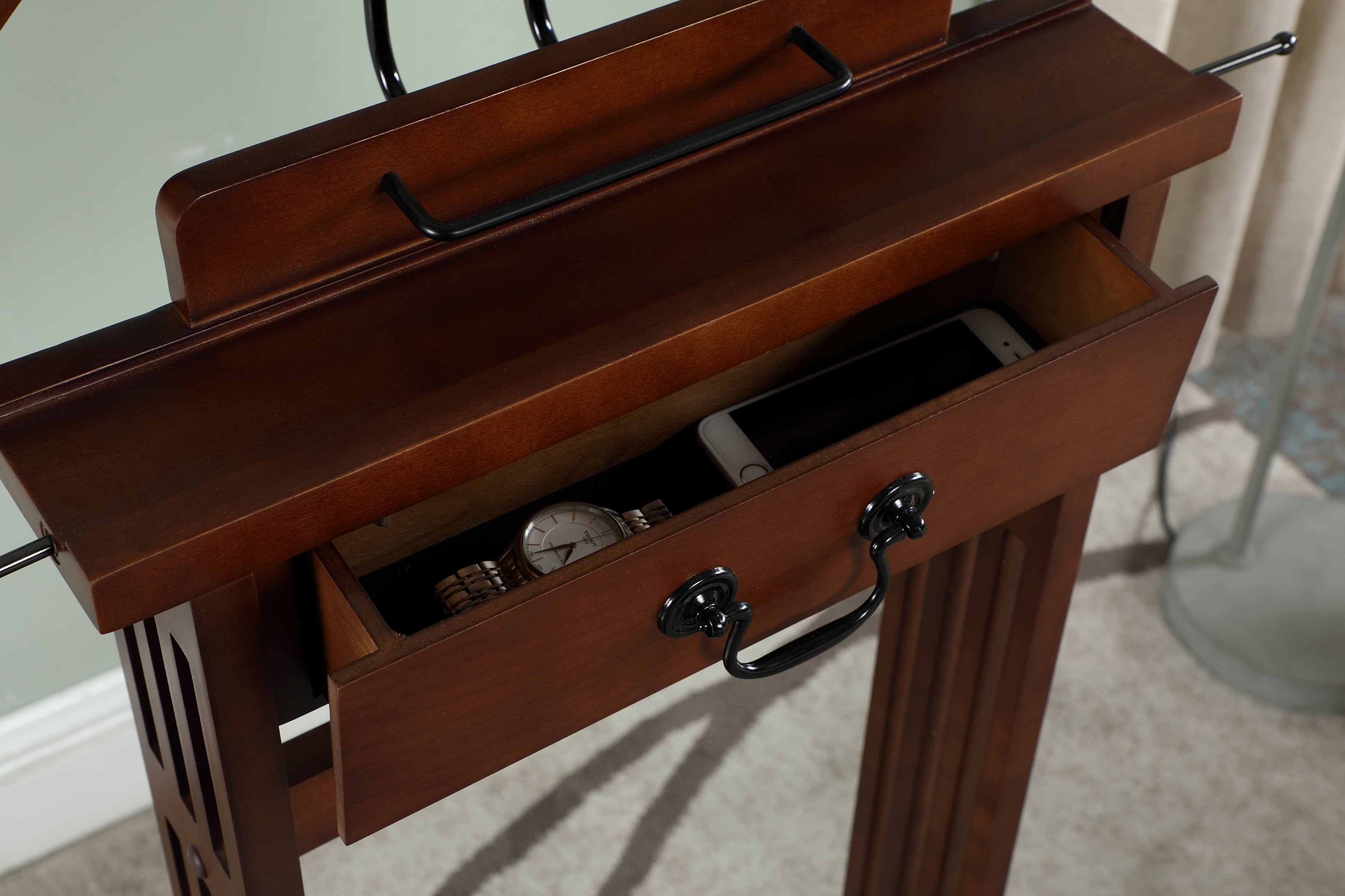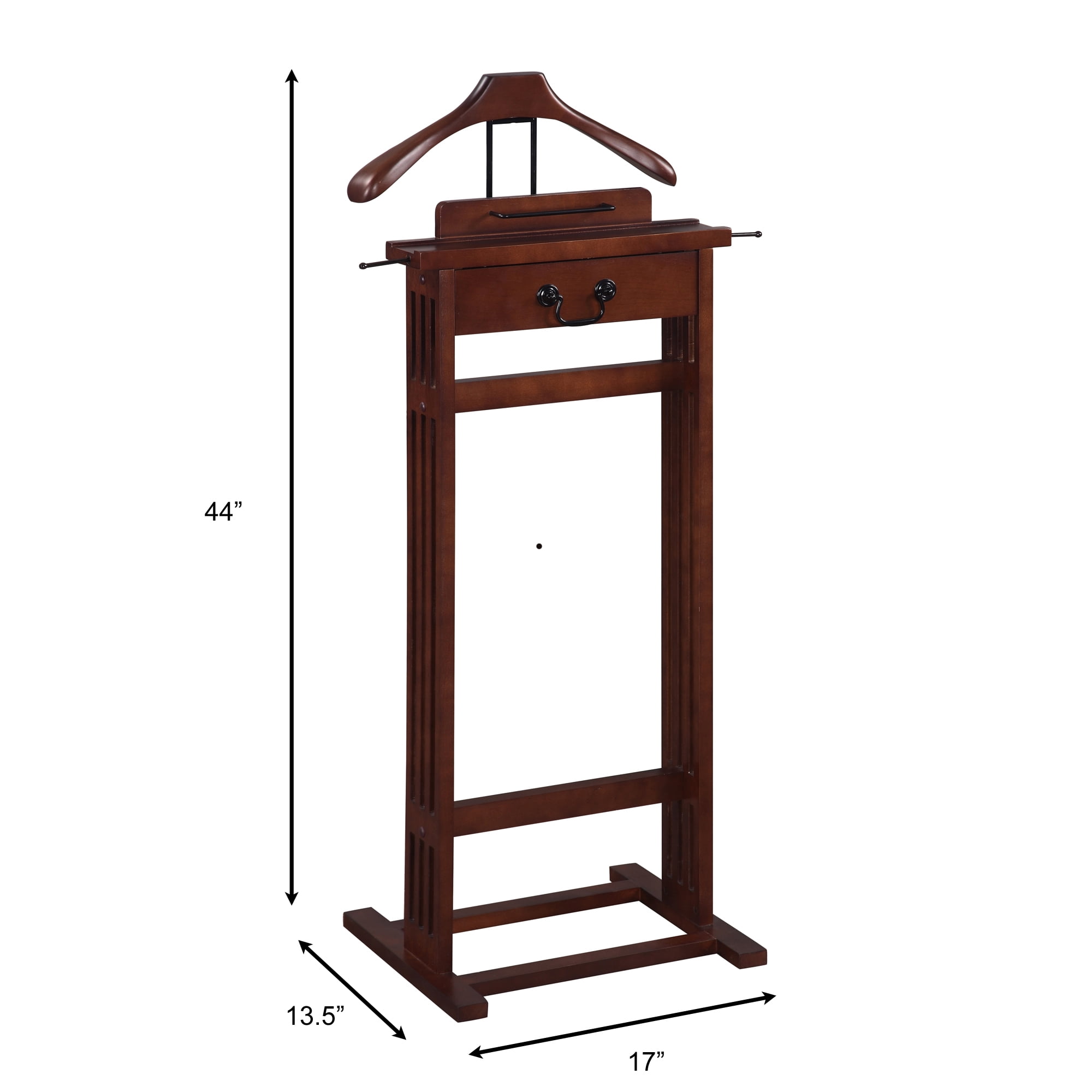 Proman Products Mission Valet in Dark Walnut The Mission Valet in Dark Walnut iis an elegant art piece with a touch of oriental mystery. This unique valet serves as a fine furniture piece and a handy way to keep your clothing wrinkle-free. This valet has a drawer for your small items and it’s antique hardware and finely crafted side supports are what make this valet a functional furniture as well as a collectible art piece. Our solid wood construction ensures years of enjoyment from this piece. This valet is also available in dark cherry. Mission style men’s valet. Solid wood construction. Dark Walnut Finish. Size: 44″ x 17″ 13.5″ Weight: 10 lbs. Brand: Proman Products Model Number: 1414-VL16188Shipping Details: