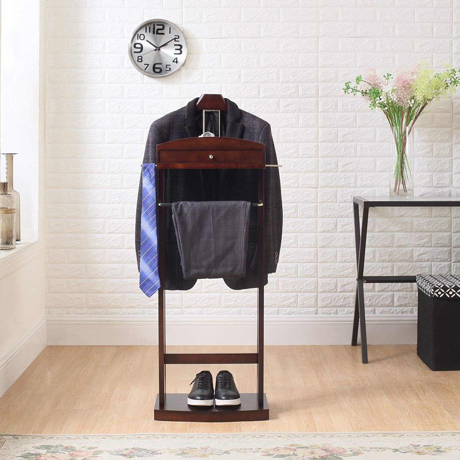 Beautiful contour hanger, hand shaped and hand polish Divided top tray with felt lining. Center drawer for additional storage with bronze hardware Dark Walnut Finish