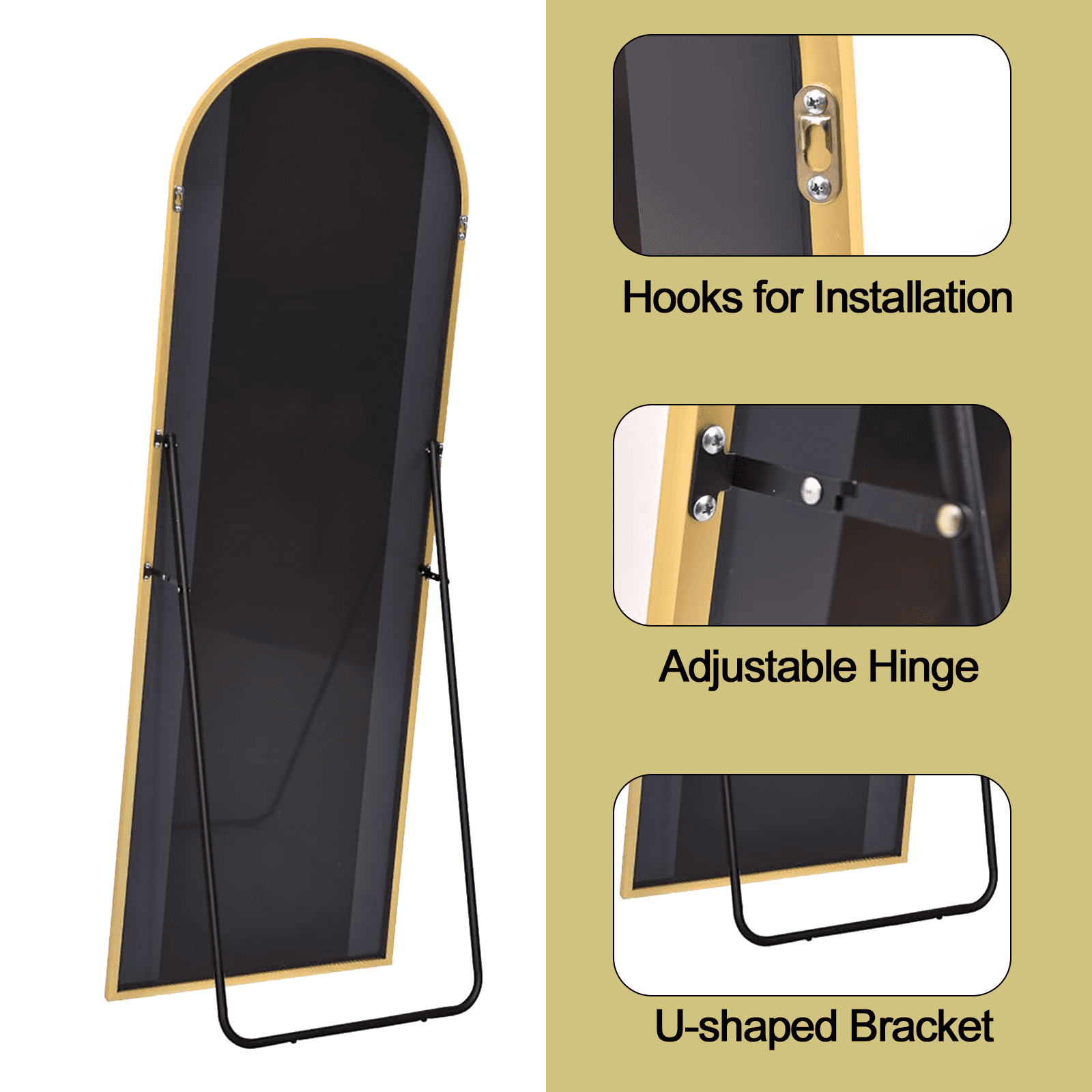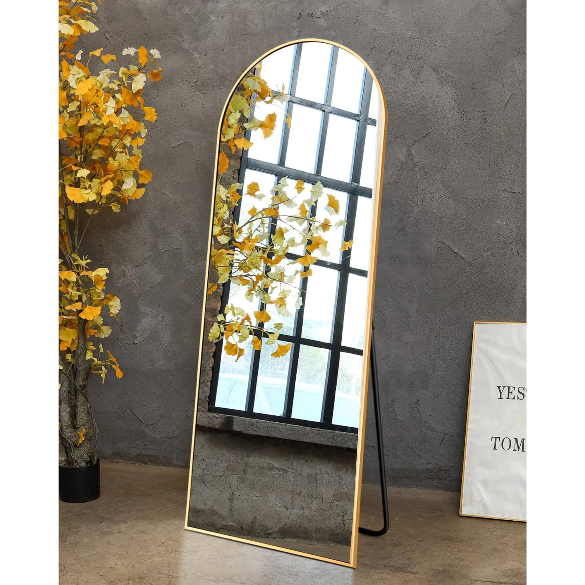【Large Size】65″x22″ large full length mirror enough for you to see your full body, expand the visual space of the room, it can provide sufficient light reflection for the room. 【Unique Design】Arched floor length mirror, the design of the gold arched full length mirror is even more eye catching. From a distance, it seems like a door or a window, in any space, making your room look more artistic. Elegant style will match nicely with your furniture suitable for living room bedroom closet foyer corridor dressing area. 【High Quality Materials】Freestanding mirror made of supper thin brushed aluminum alloy, wall mirror high-definition imaging, using explosion-proof materials (not cheap substitutes), anti-rust and explosion-proof, in case of accidental damage, the mirror glass will not be scattered around, ensuring the safety of you and your family. Safer and more assured. 【Multifunctional】Body Mirror 3 ways to ues – Freestanding, wall mounted or Lean on the wall. This floor length mirror comes with standing holder, there are hanging holes in the back of the mirror, just nail two complimentary screws on the wall and hang the mirror. 【100% Satisfaction】If the mirror arrives broken, we offer a full refund/free replacement, no need to return it, you just need to send us some pictures via Mail. Just show: the damaged mirror and the shipping label. We will reply within 12 hours and resolve your problem.