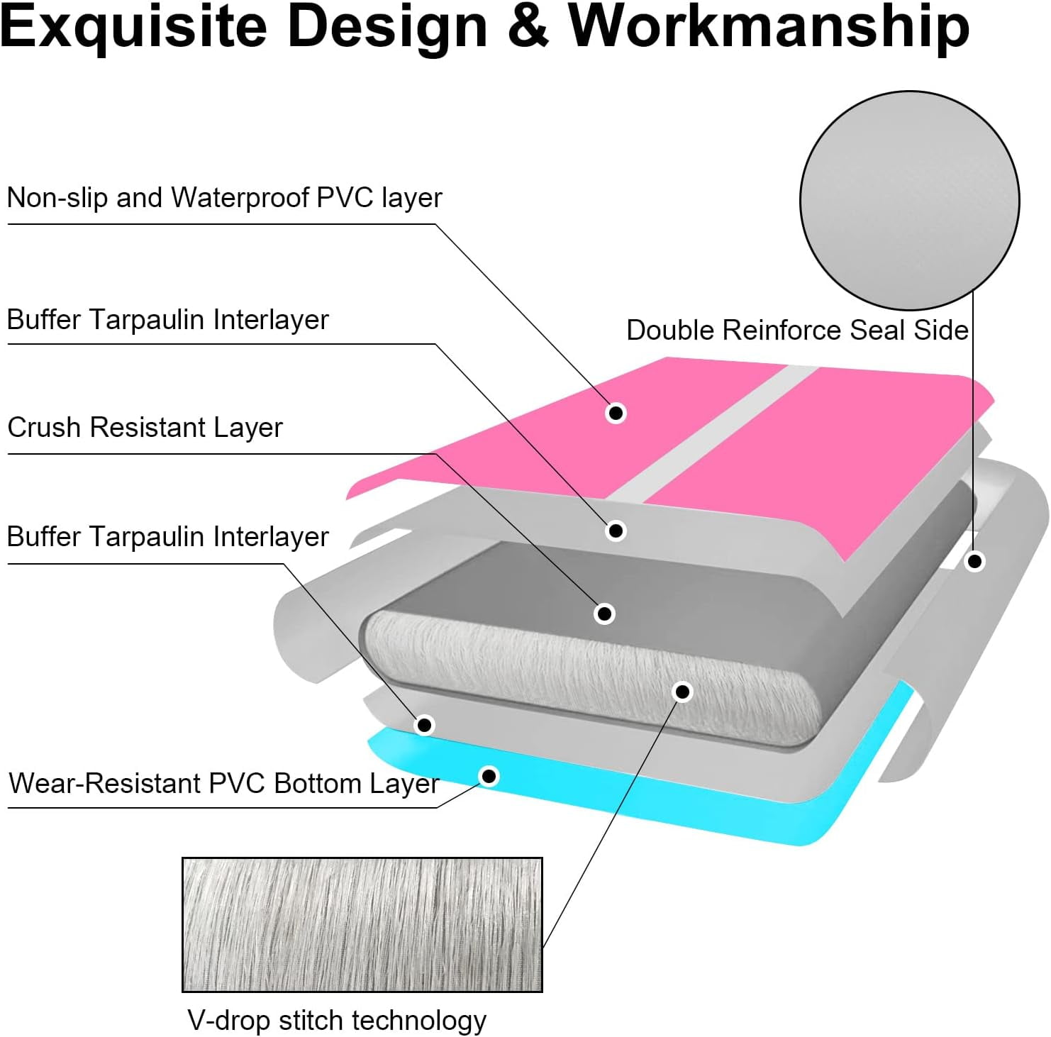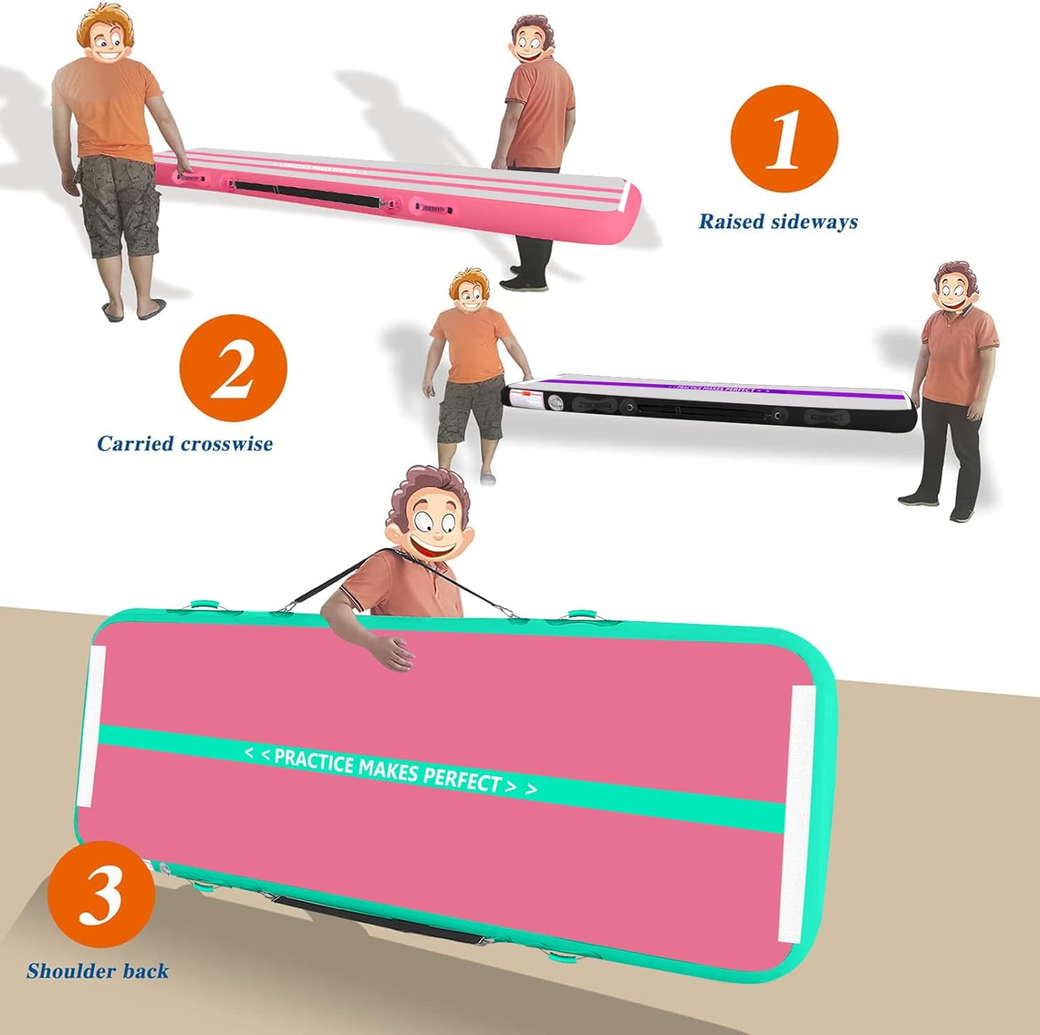 All Purpose: This inflatable track mat can be easily set up in living rooms, backyards, or in a gym, school, studio, club, or pool. It can be used for gymnastics, cheer training, tumbling, flipping, free stunting, ballet, yoga, taekwondo, entertainment, water fun, and more. Deluxe Material: Nonslip material enables the tumble track mat better traction and grip. Drop stitch fabric makes the tumbling mat firm and bouncy, reducing injury vs traditional gymnastics mats. High intensity and superior elasticity enable trainees to challenge high-performance tumbling movements and land at ease. Durable: Two-layer thick vinyl fabric provides high resistance to wear, tear, and abrasion. Reinforced seams and durable valves enable the air mat to hold optimum air pressure for days. Easy to use Easy to carry Easy to store: This gym equipment comes with an electric air pump, fast inflating and deflating. Easy to fold this tumbling track to a small size. It saves space to store convenience to carry in the car, to the park, or over to the neighbor’s.