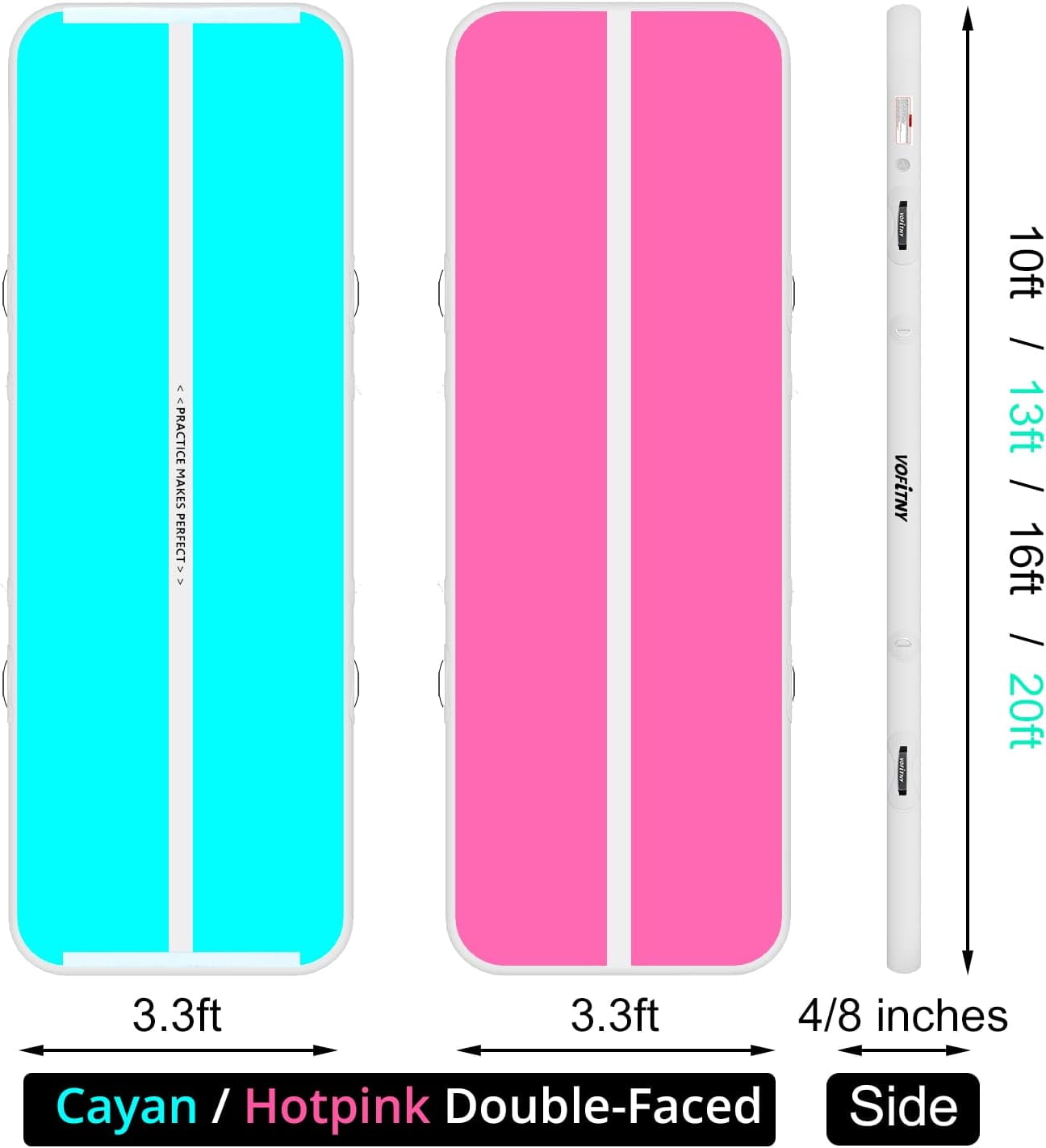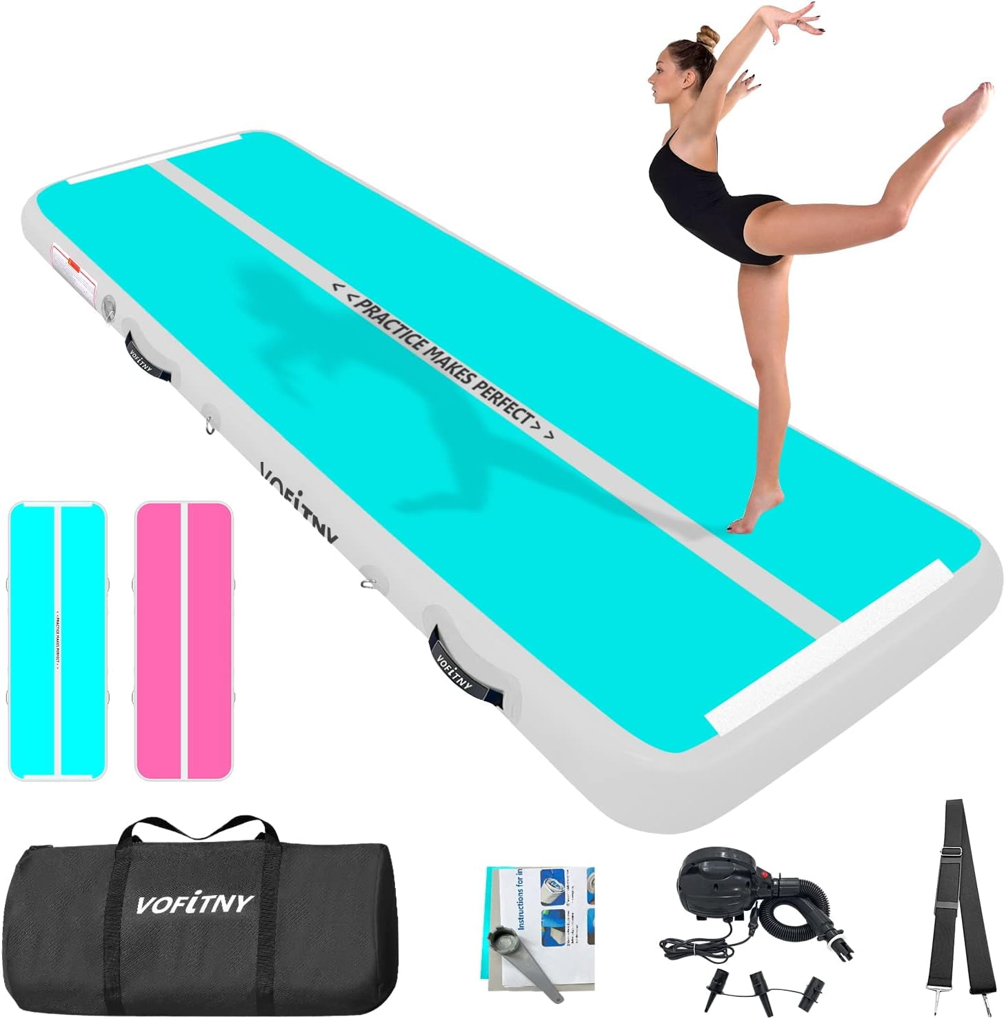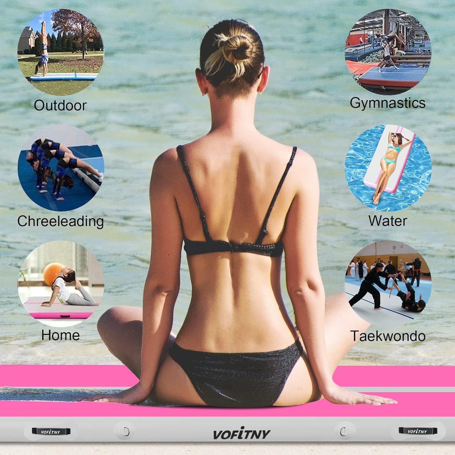 The VOFiTNY Air Mat is a versatile and durable inflatable gymnastics mat perfect for a variety of activities. Crafted with nonslip, drop-stitch fabric, this mat provides superior traction and bounce, allowing users to safely perform high-intensity tumbling, cheer training, yoga, and more. Measuring 10ft x 3.3ft x 4in, the air mat is easy to set up, transport, and store, thanks to the included electric air pump. Designed for home use, this multifunctional mat is an excellent choice for fitness enthusiasts, gymnasts, and families looking to enhance their indoor and outdoor recreational experiences.