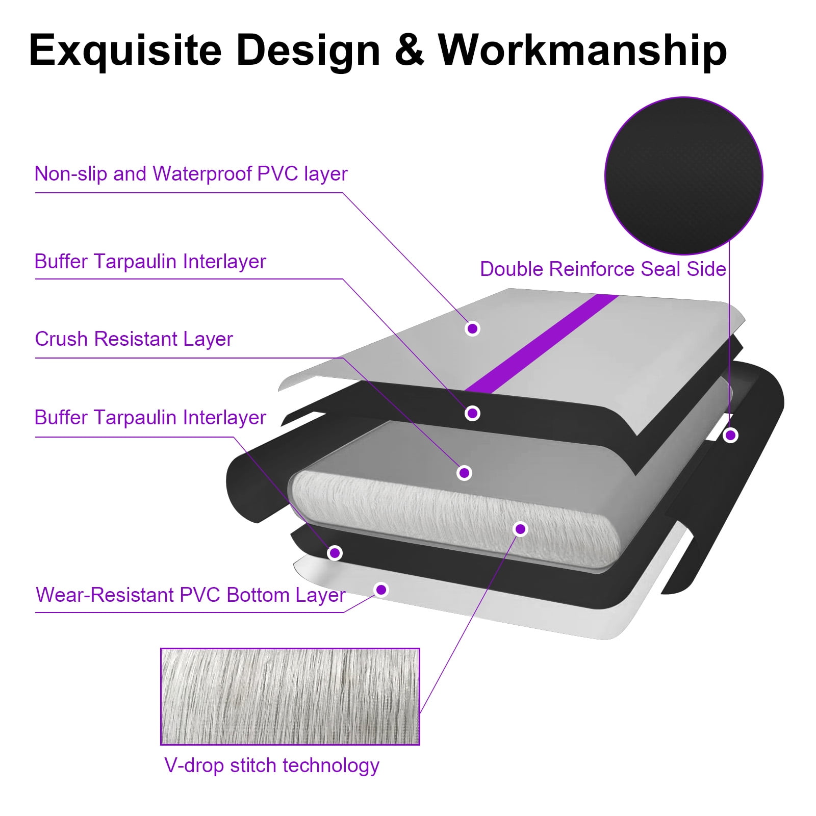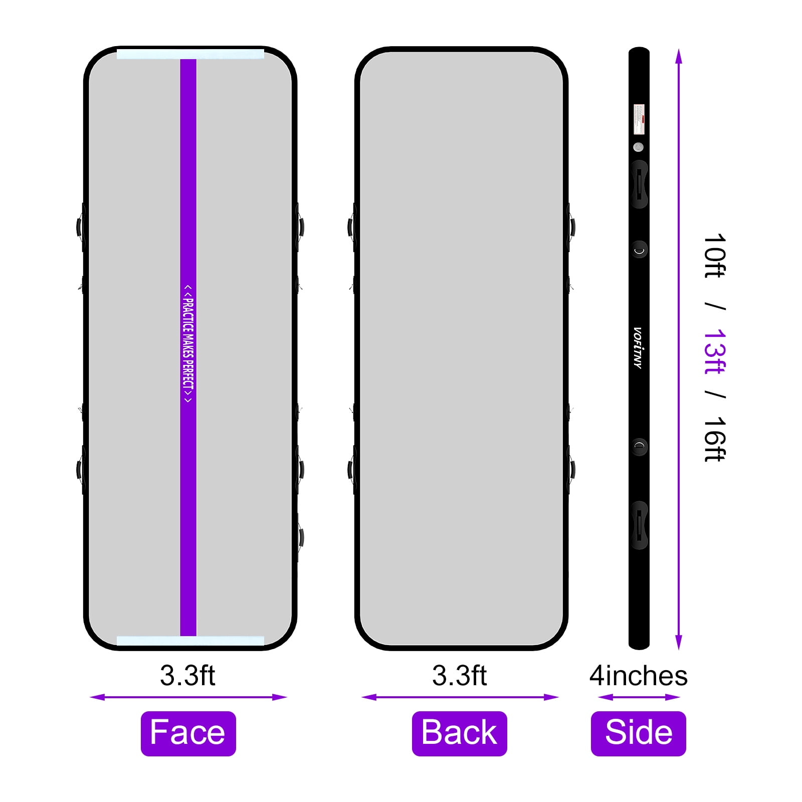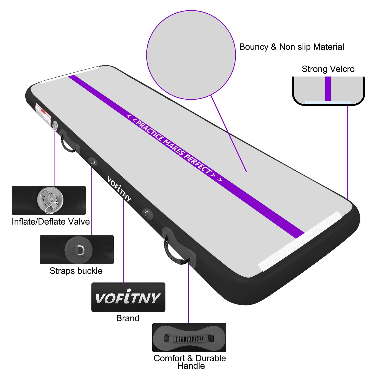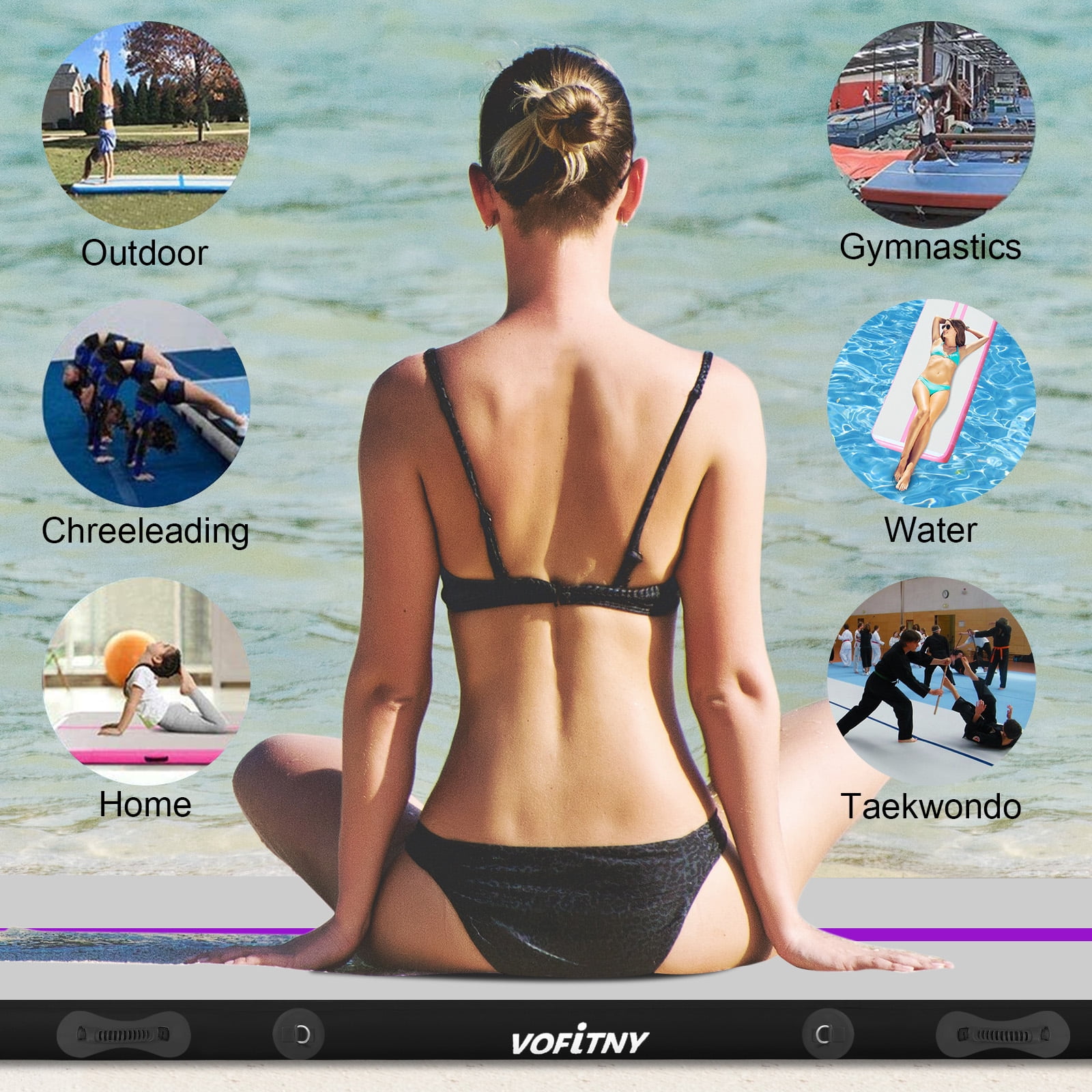 VOFiTNY Inflatable 6’6” x 3’3” Air Mat with Non-Slip Material Exercise Mat with E-Pump Versatile setup for living rooms, backyards, gyms, schools, studios, clubs, and pools Suitable for gymnastics, cheer training, tumbling, flipping, ballet, yoga, tae kwon do, and water fun Non-slip material provides better traction and grip Drop stitch fabric ensures firmness and bounce, reducing injury compared to traditional gym mats High intensity and superior elasticity support high-performance tumbling movements