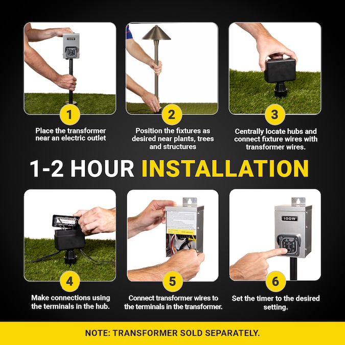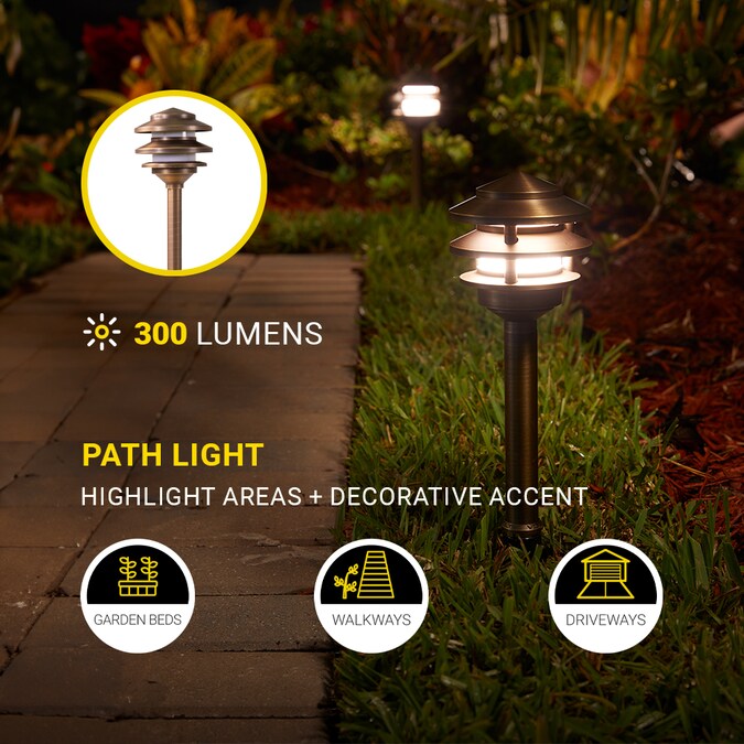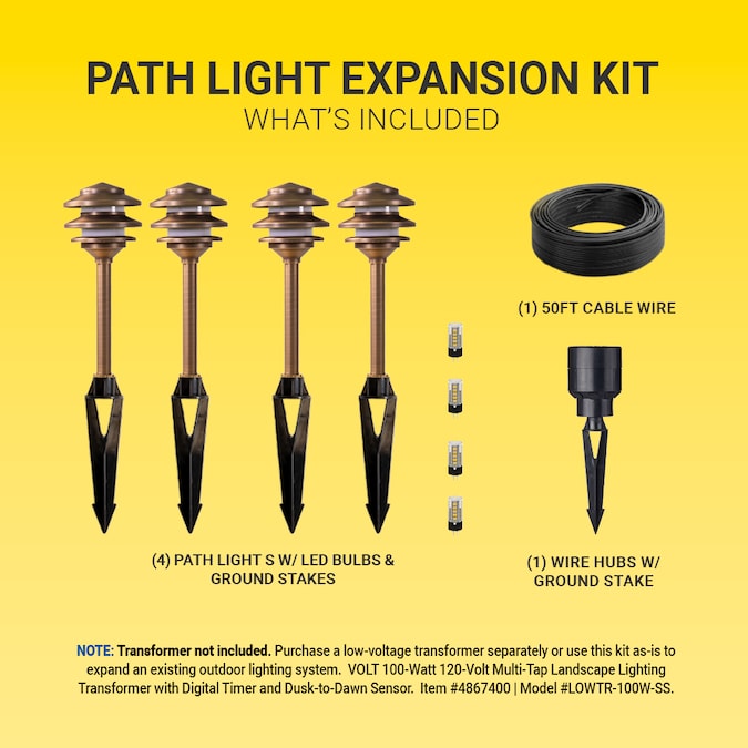 - Expansion kit includes 4 pagoda path lights (300 lumens each) with LED bulbs, hub, cable, connector and mounting stakes— Purchase a low voltage transformer separately or use this kit as-is to expand an existing outdoor lighting system.