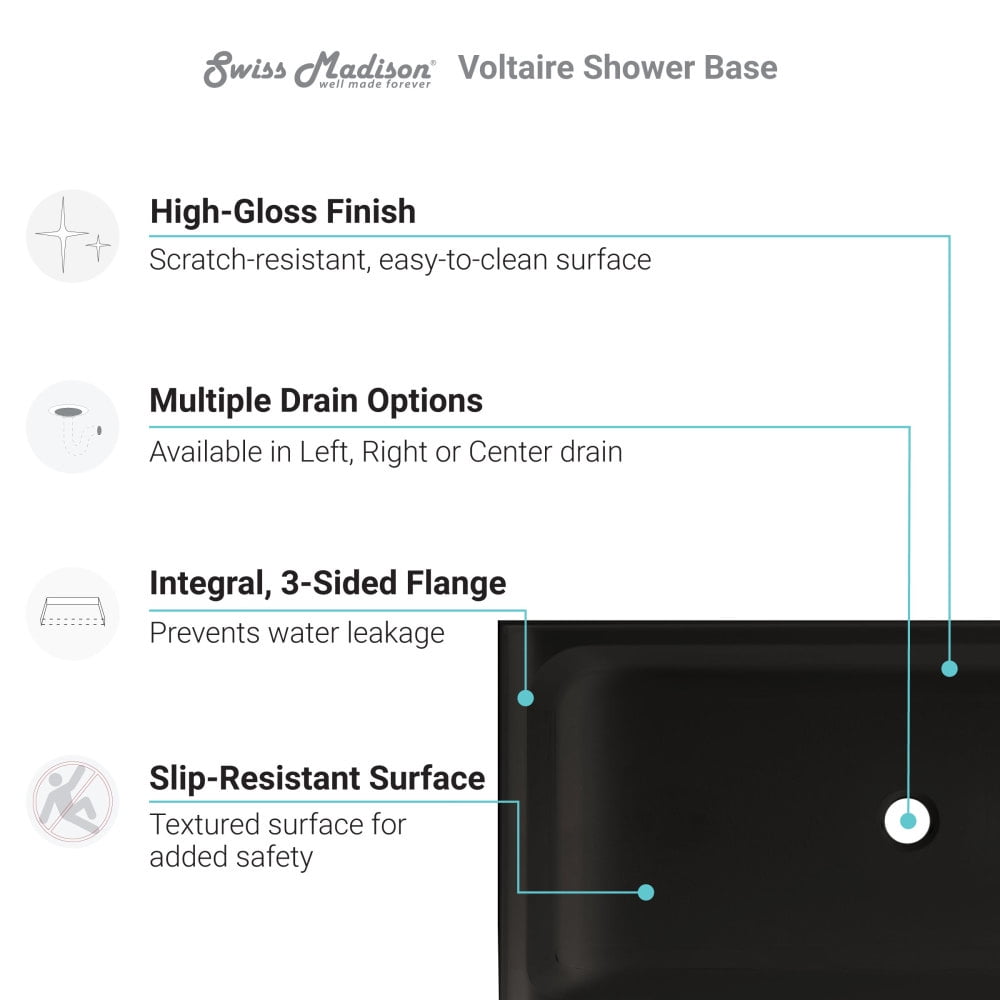Embrace timeless elegance with the Voltaire collection, fusing classic charm with contemporary comfort. Elevate your shower experience with our sleek and sturdy shower bases designed for durability and functionality. Offered in black with a glossy finish.