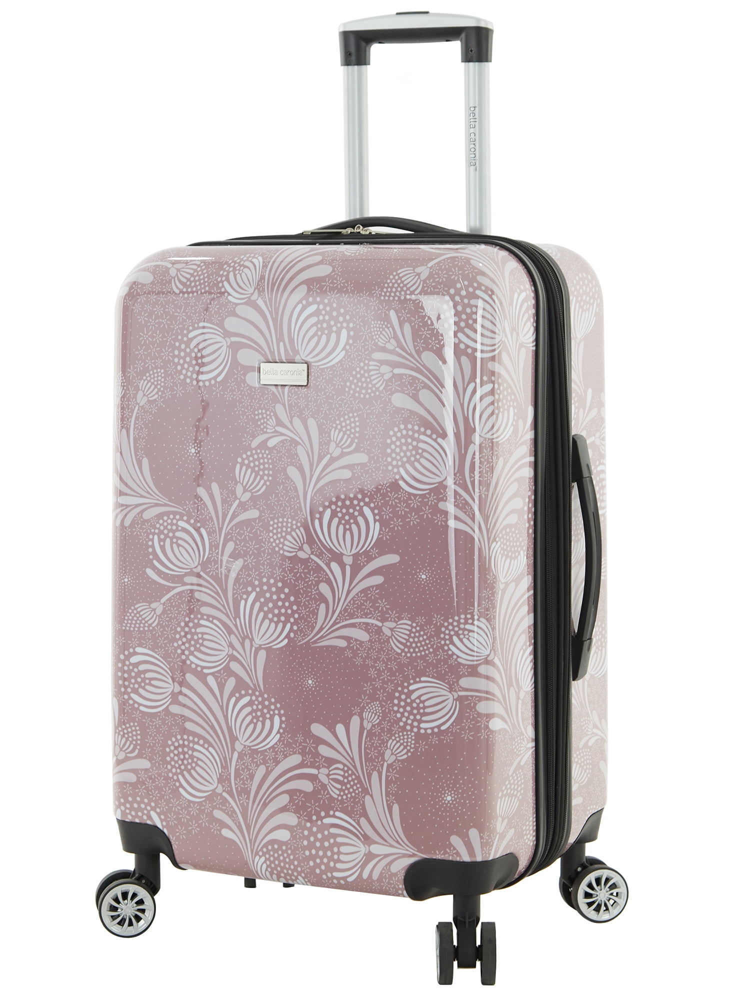 Travelers Club 3 pc. travel luggage set created by Bella Caronia. This high fashioned luggage set consists of a 28″ expandable 8-wheel spinner upright, a 24″ expandable 8-wheel spinner upright along with a 20″ expandable 8-wheel spinner rolling carry-on. All feature 2″ expansion sections, 8 spinner wheels, locking telescopic handles, top and side carry handles and are fully lines. Made of hardside ABS material with added polycarbonate coating to give it scratch and dirt resistancy. The 28″ measures with the wheels, 30″ x 19″ x 12 ” and weighs 9.6 lbs. An ideal bag to pack for a week trip. It meets airline check-in requirements. The 24″ measures with the wheels, 26″ x 18″ x 11″ and weighs 8 lbs. Perfect for a 4 to 6 day trip. The 20″ with the wheels measures 22″ x 15″ x 9.5″ and weighs only 6.9 lbs. Easily accomodates your travel needs up to 3 days. The 20″ carry-on meets most airline carry-on requirements.