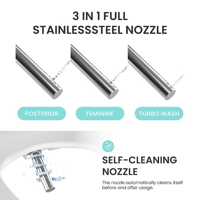 - Full stainless nozzle: performs feminine, posterior, and turbo wash functions, rhythmic movement and 5 different nozzle positions, one touch self-cleaning and semi-permanent use of nozzle