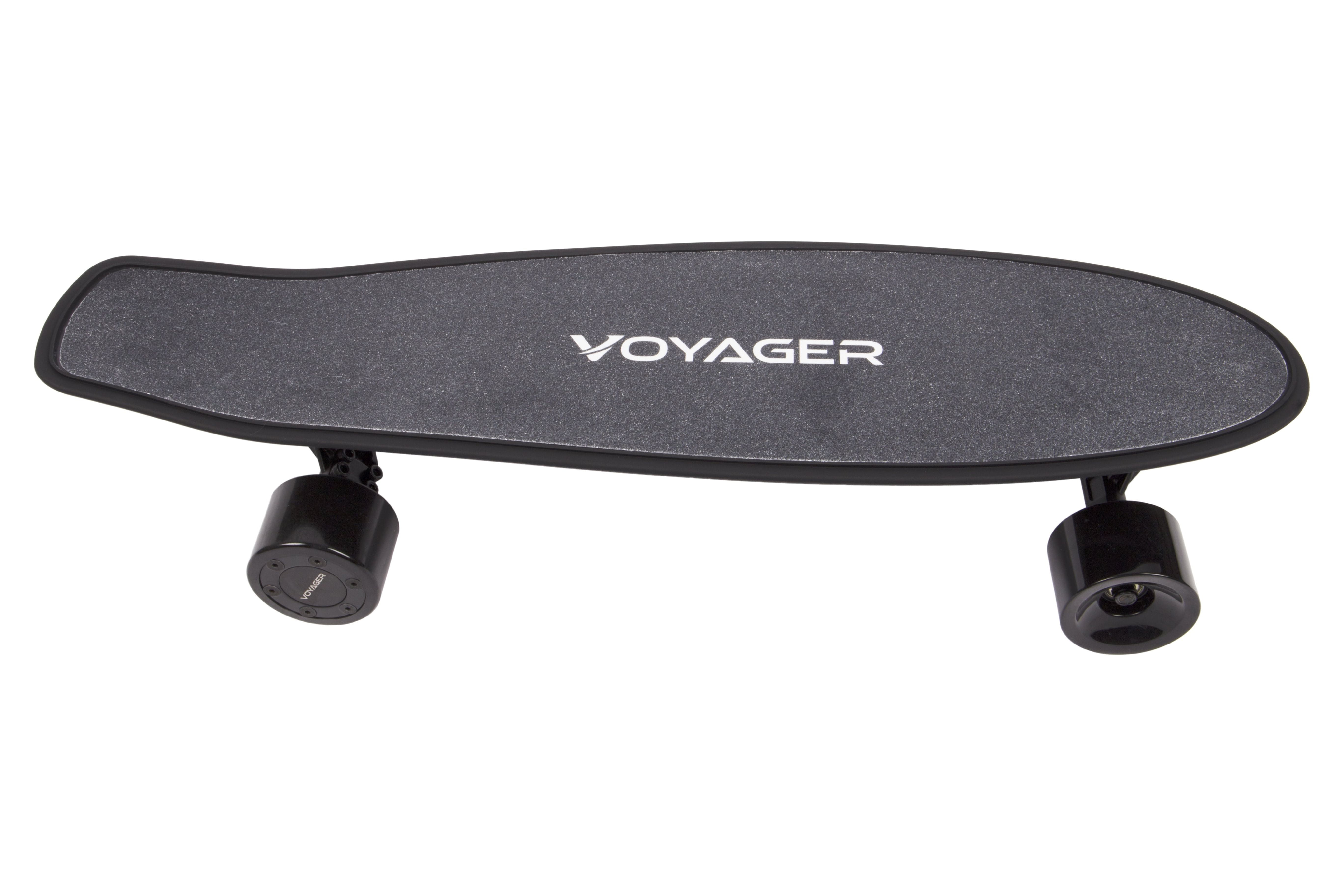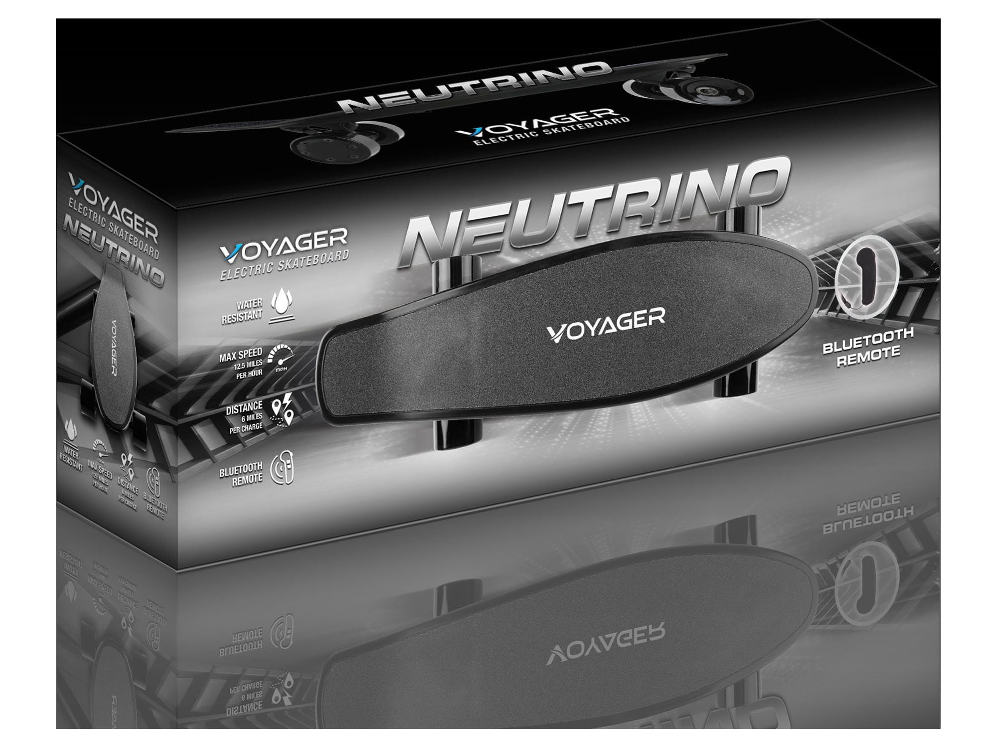 Voyager Neutrino Compact Cruiser Electric Skateboard 350 Watt Brushless Motors Reaches speeds of 12.5 MPH 7 Miles max travel distance Range Per charge Portable and compact e-boards 72 MM Wheels 15° Max Incline 200 LB Max Load