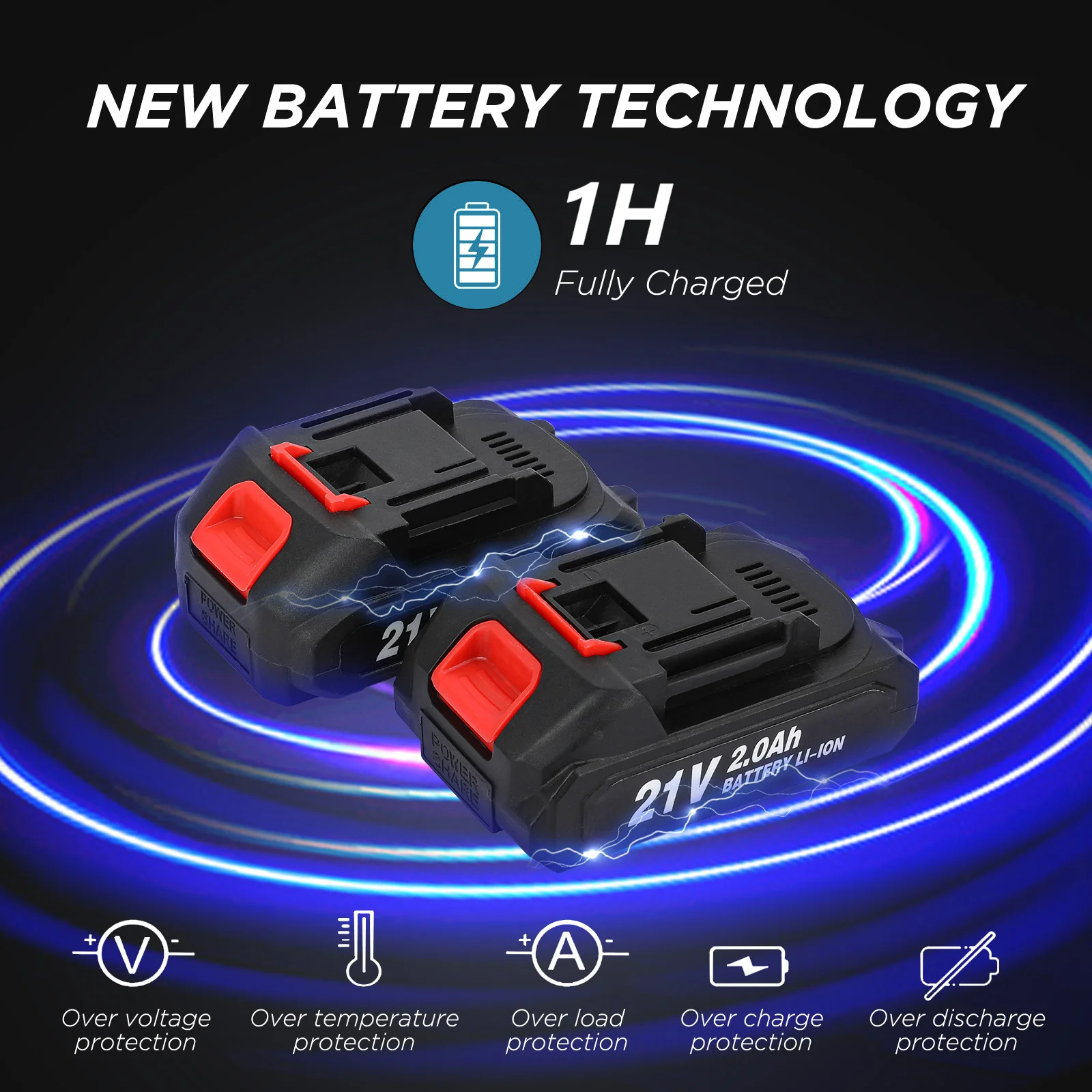 With High-quality brushless motors, our cordless chainsaw minimizes internal friction and vibration for long life. Quick start and stop, less backlash and no jamming even for hardwoods.Our mini chainsaw cuts limbs up to 32 ft/s like a hot knife through butter! The fastest cutting tool out there! It can easily handle 6-inch branches in just 5-15 seconds! With High-quality brushless motors, our cordless chainsaw minimizes internal friction and vibration for long life. Quick start and stop, less backlash and no jamming even for hardwoods.Our mini chainsaw cuts limbs up to 32 ft/s like a hot knife through butter! The fastest cutting tool out there! It can easily handle 6-inch branches in just 5-15 seconds! Say goodbye to the hassle of dismantling the machine for chain tension adjustments. Our electric chainsaw features an automatic chain tensioner that can be quickly and easily adjusted without any tools Say goodbye to the hassle of dismantling the machine for chain tension adjustments. Our electric chainsaw features an automatic chain tensioner that can be quickly and easily adjusted without any tools Equipped with an Automatic Oiler to prevent chain rust and jamming issues, increased productivity. Translucent oil reservoir for clear visibility to oil levels Equipped with an Automatic Oiler to prevent chain rust and jamming issues, increased productivity. Translucent oil reservoir for clear visibility to oil levels Comes with 2pcs FCC & CE certified 2000mAh batteries and a quick charger. Compacts with Makita Batteries. With its advanced ergonomic design, the small chainsaw is easy to handle and maneuver, particularly user-friendly for seniors, women, and left-handed users Comes with 2pcs FCC & CE certified 2000mAh batteries and a quick charger. Compacts with Makita Batteries. With its advanced ergonomic design, the small chainsaw is easy to handle and maneuver, particularly user-friendly for seniors, women, and left-handed users Mini Chainsaw ×1; Rechargeable Li-on Battery ×2; Chain ×2 (1 has been mounted on the chainsaw); Guide Plate ×2 (1 has been mounted on the chainsaw); Quick Charger ×1; goggles ×1; Safety Gloves ×1; Screwdriver ×1, small empty oil bottle x1. All these are neatly packed in a durable, portable ABS box, which ideal for the great outdoors or your backyard. Mini Chainsaw ×1; Rechargeable Li-on Battery ×2; Chain ×2 (1 has been mounted on the chainsaw); Guide Plate ×2 (1 has been mounted on the chainsaw); Quick Charger ×1; goggles ×1; Safety Gloves ×1; Screwdriver ×1, small empty oil bottle x1. All these are neatly packed in a durable, portable ABS box, which ideal for the great outdoors or your backyard.