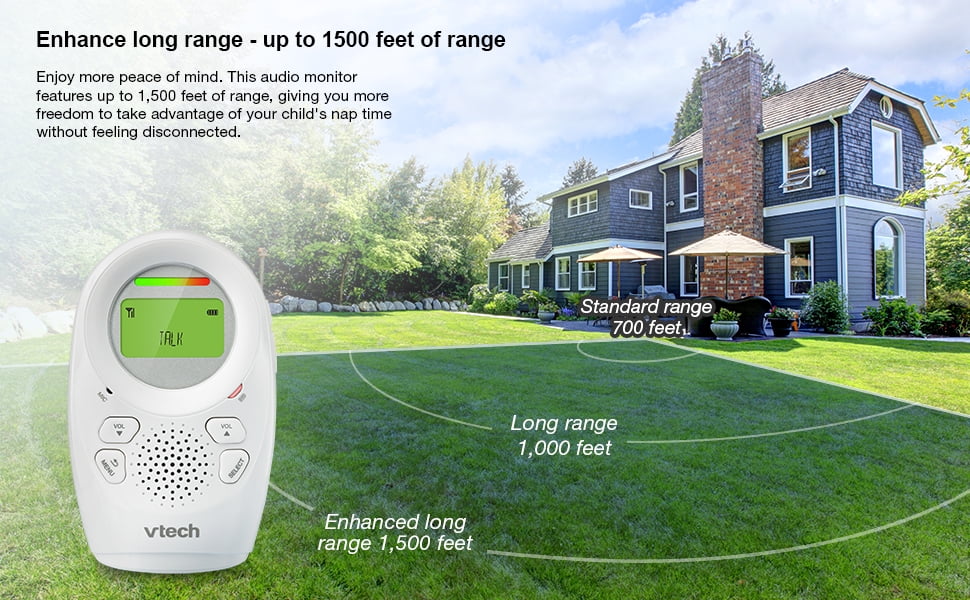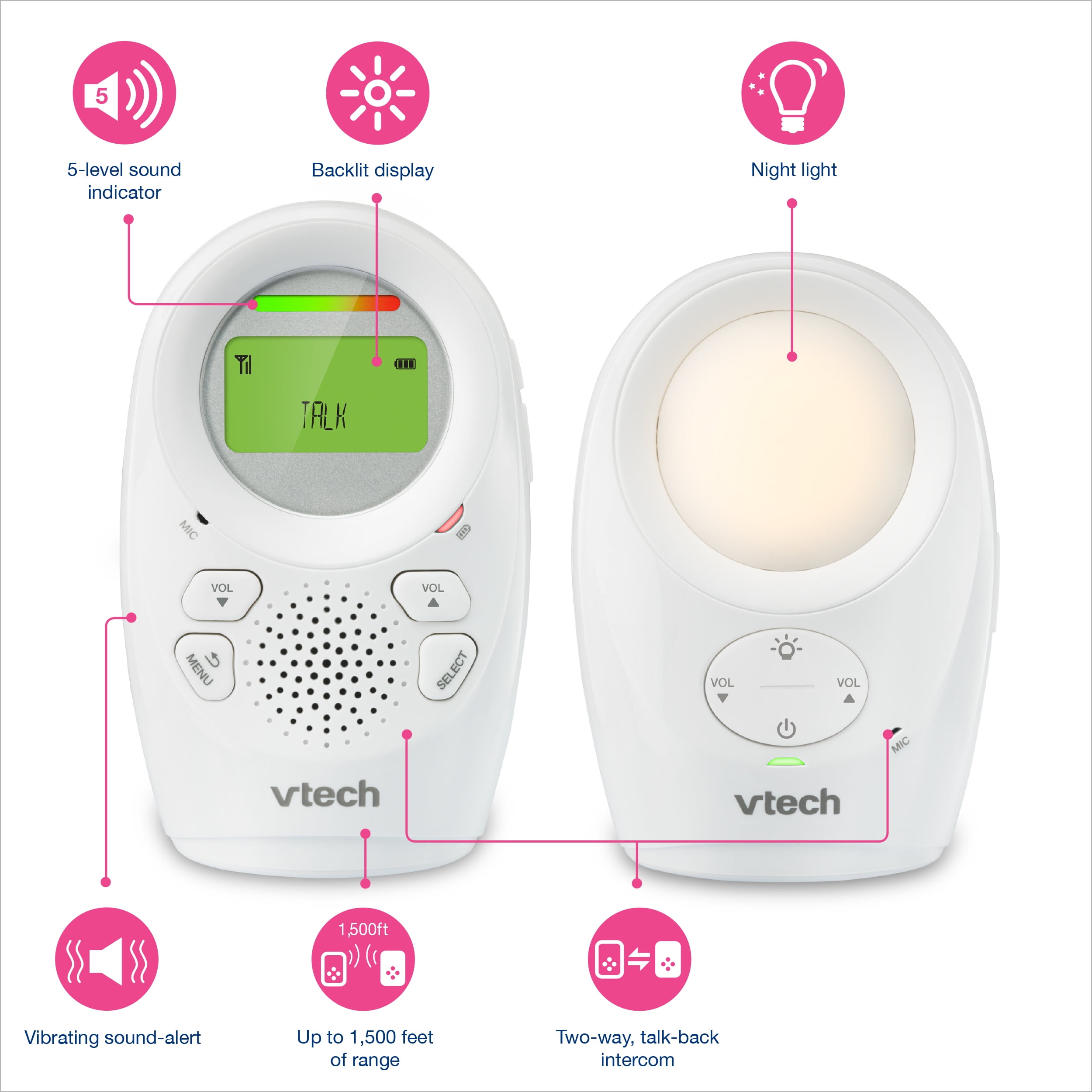 Baby monitor lets parent hear baby clearly for up to 1,500 ft. of enhanced range DECT 6.0 digital technology provides secure audio transmission while eliminating annoying background noise Built-in 2-way talk-back intercom makes it easy to soothe baby before parent gets to the nursery Night-light on baby unit creates a soothing glow for baby to fall asleep to Vibrating sound-alert on the parent unit silently alerts parent when there is sound in the baby’s room 5-level sound indicator Backlit display on the parent unit Belt clip on parent unit for convenient wear Volume control Rechargeable battery Low-battery alert on the parent unit Includes parent unit, baby unit, and AC charger