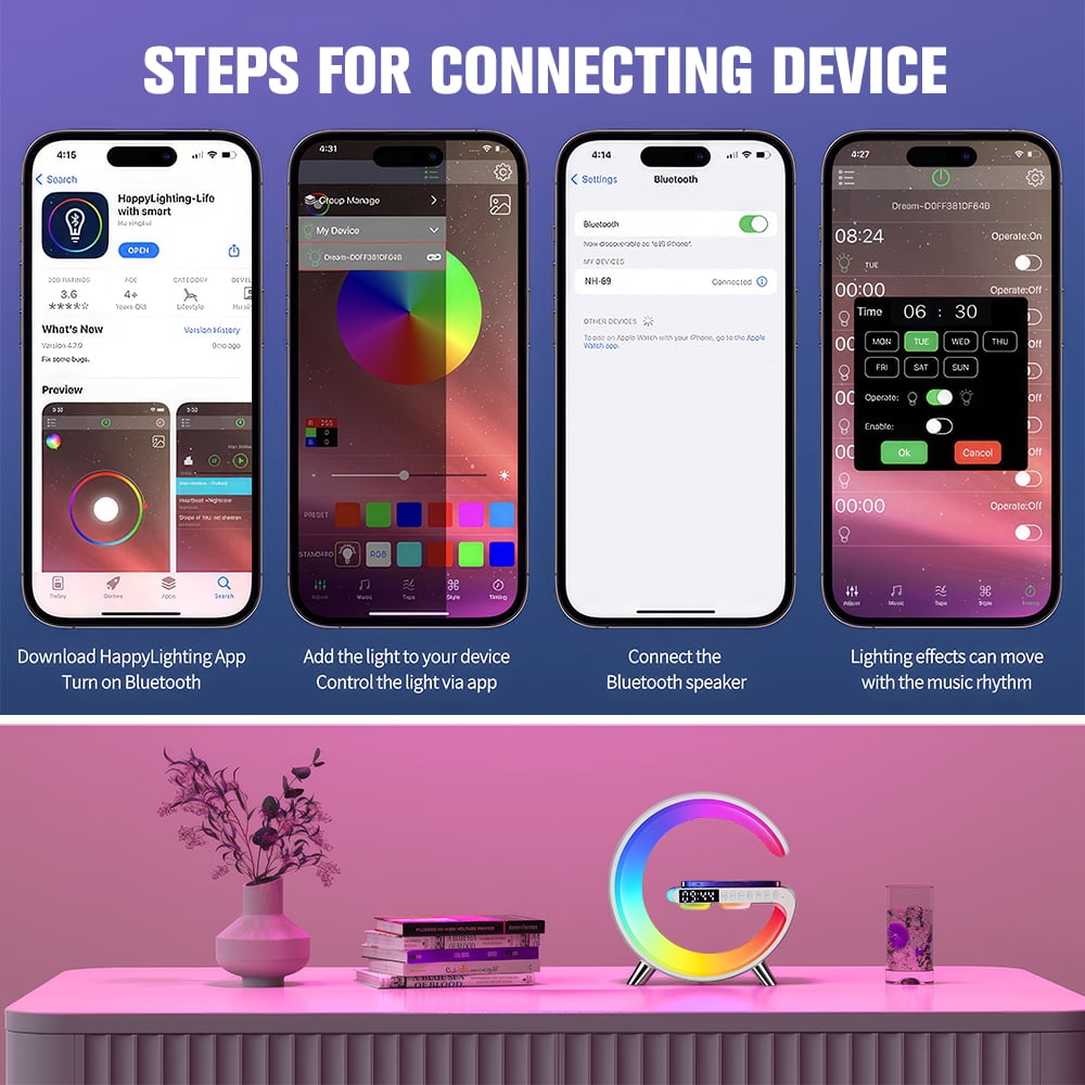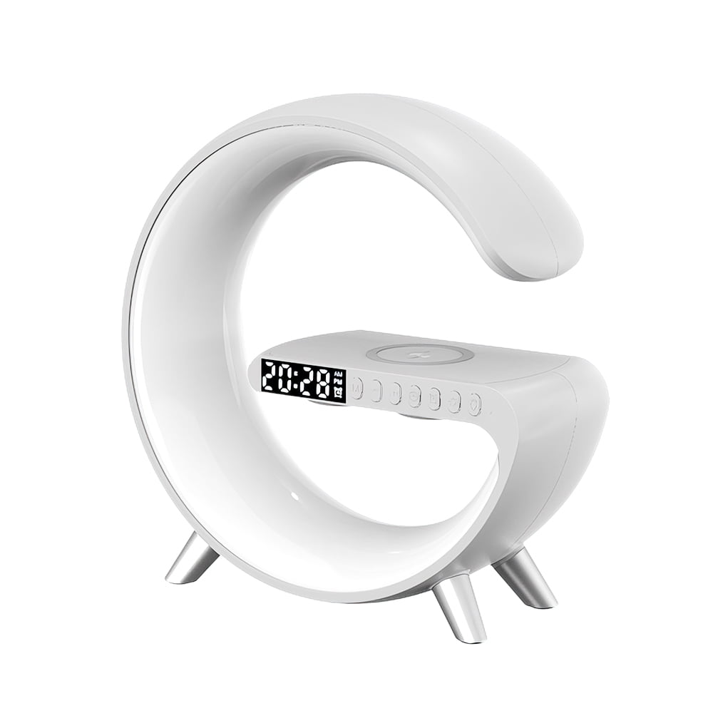 Features: 1.Multifunctional Wireless Charging Atmosphere Light: The lamp is not only an atmosphere light, but also has 15W fast wireless charging, Bluetooth speaker, music, sleep light, atmosphere light, bedside light, glare effect, Bluetooth audio, clock, alarm clock and other functions . You can use this great light while working, studying, reading and sleeping. 2.Comfortable Wake-up Mode: You can customize sound, volume, light color and brightness through APP, personalize healthy sleep and wake-up routine. The snooze alarm clock sounds gentle and peaceful, helping your body wake up gradually. 3.Smart Light Control: The smart table lamp supports APP control, voice control, remote control and button control. Dimmable (1-100% brightness), easily adjust the light color to suit different moods. It can also be used to turn on/off the light bar and set timing functions. 4.Dimmable Mood Light: Click the bulb button to switch between 10 light color modes. Other 256 modes and 16 million light colors can be adjusted through APP. The brightness of the light can be adjusted continuously, and the light will gradually brighten or dim. Meet your lighting needs in any scene. 5.Clock With Fast Charging Station: This wireless charging alarm clock is also a 15W wireless fast charger. It can charge any electronic device that supports wireless charging. It has multiple protections such as overcurrent, overvoltage, overtemperature, and short circuit, making charging safe. 6.Perfect Decoration and Gift: The mood light can help you create any mood you want, perfect for bed, bedroom, living room, home, office decoration, it is an ideal gift for birthday, Christmas, New Year, Thanksgiving and more. Specification: Material: ABS+PC Input Voltage: 12V/2.5A Wireless Power: 5W-7.5W-10W-15W LED output: 10W Bluetooth Audio Power: 3W Lighting modes: 256 kinds Transmission Distance: 2-6mm Charging efficiency: 75% Button battery capacity: 40mAh Net weight: 466g Product size: 228*82*230mm NOTE: 1.Please use QC3.0 power adapter (charger),Otherwise the LED light will not ON. 2.It works for ALL Phones that support wireless charging !!! 3.For fast charging experience and Use all function at the same time, please use QC 3.0 power adapter Package Included: 1*wireless charging 1*Charging cable 1*User Manual