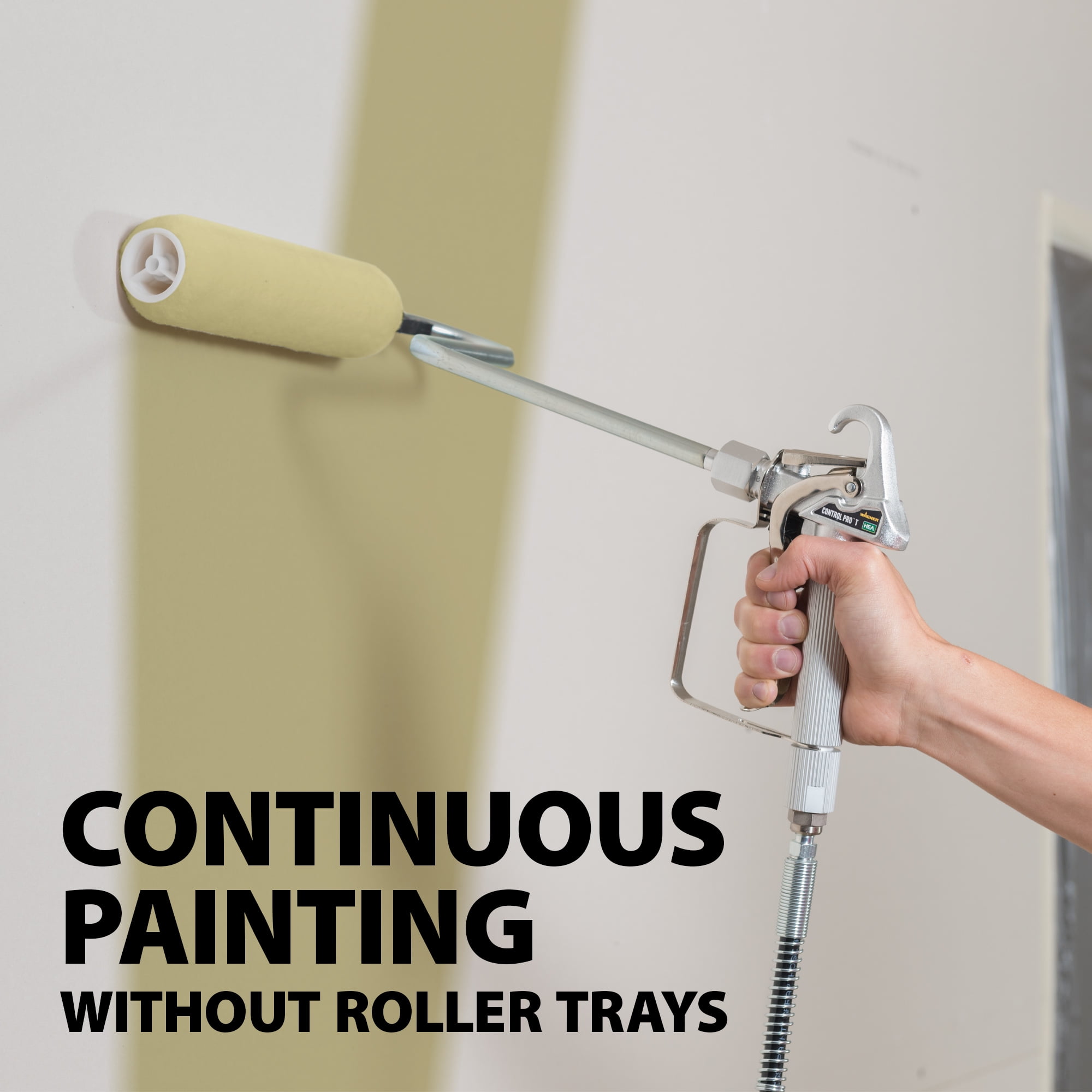 Connects directly to Wagner Control Pro, Titan ControlMax & similar airless sprayers with a G-thread attachment (sprayer sold separately) Applies paint 4X faster compared to standard rollers Great for nonstop painting on interior walls, multi-room homes, ceilings, deck floors, and other large areas Trigger activated handle provides continuous paint flow Eliminates messy, back breaking trips to a roller tray Uses a Wagner 9″ roller cover