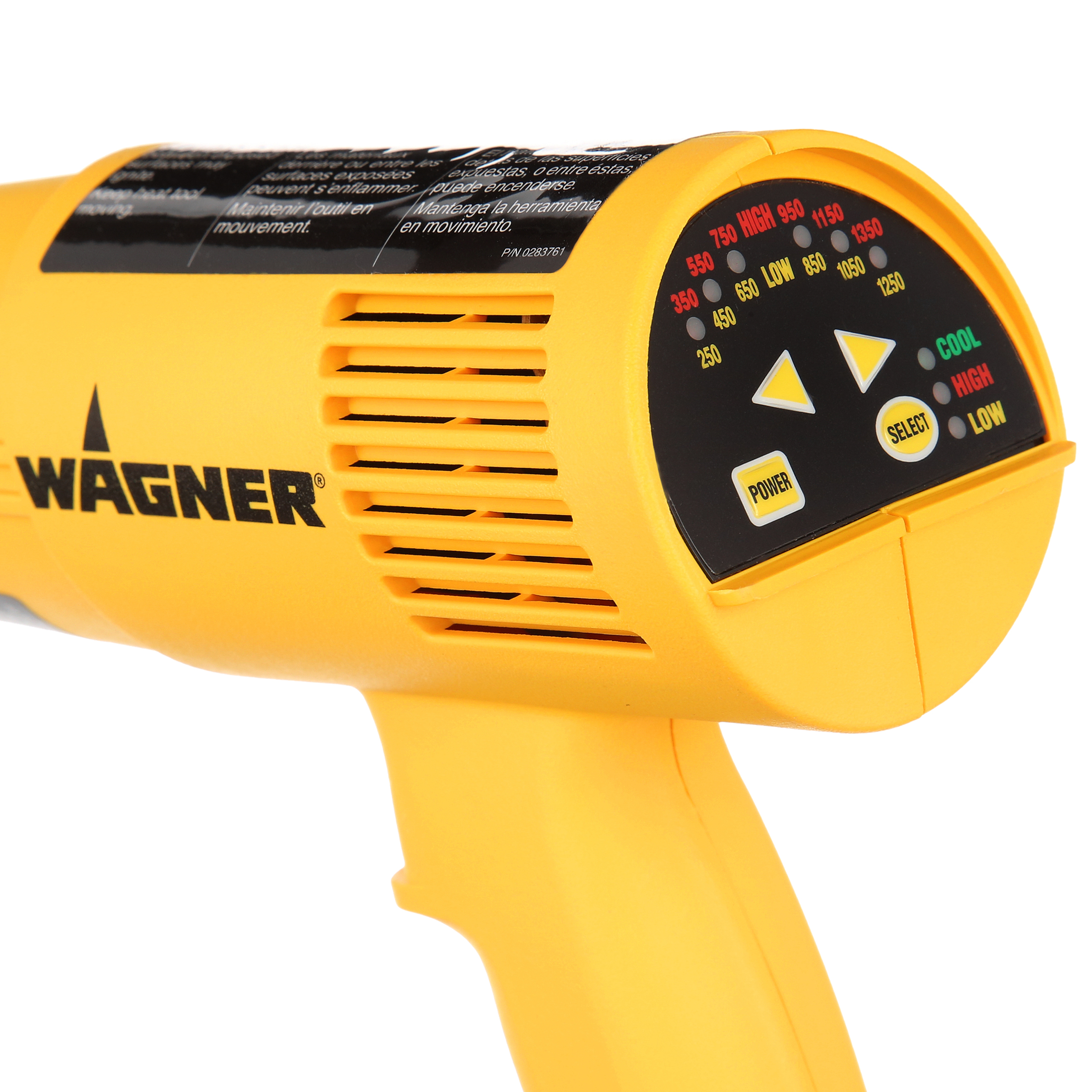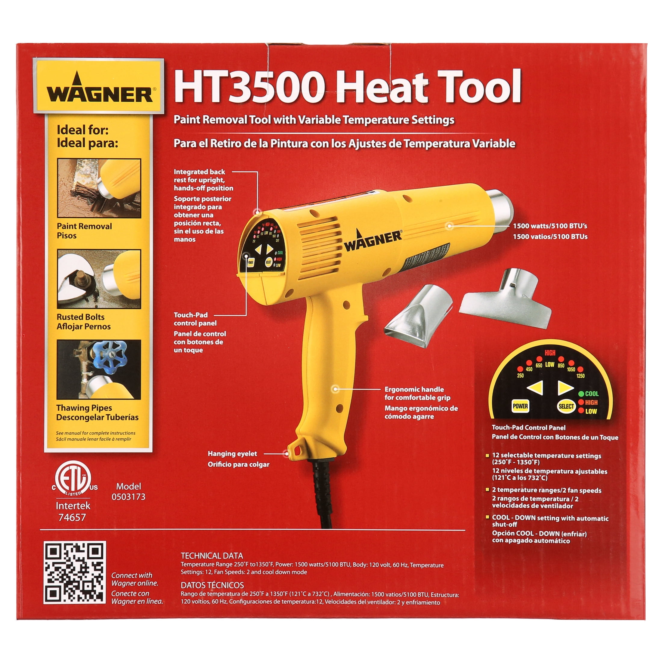The heat gun can be used for removing multiple types of paint, flooring, rusted bolts, thawing frozen pipes, softening plastic and much more. Wagner Digital Heat Gun, HT3500: 12 temperature settings from 250 degrees to 1350 degrees F for consistent results and performance Ergonomic handle for a comfortable grip and reduced fatigue 2 fan speeds for optimum air flow control Cool-down and automatic shut-off setting to improve tool life Power: 1500W/5100 BTUs 1-year warranty on 1500 watt heat gun