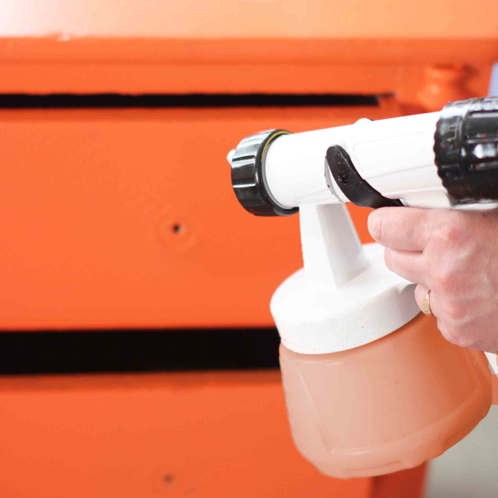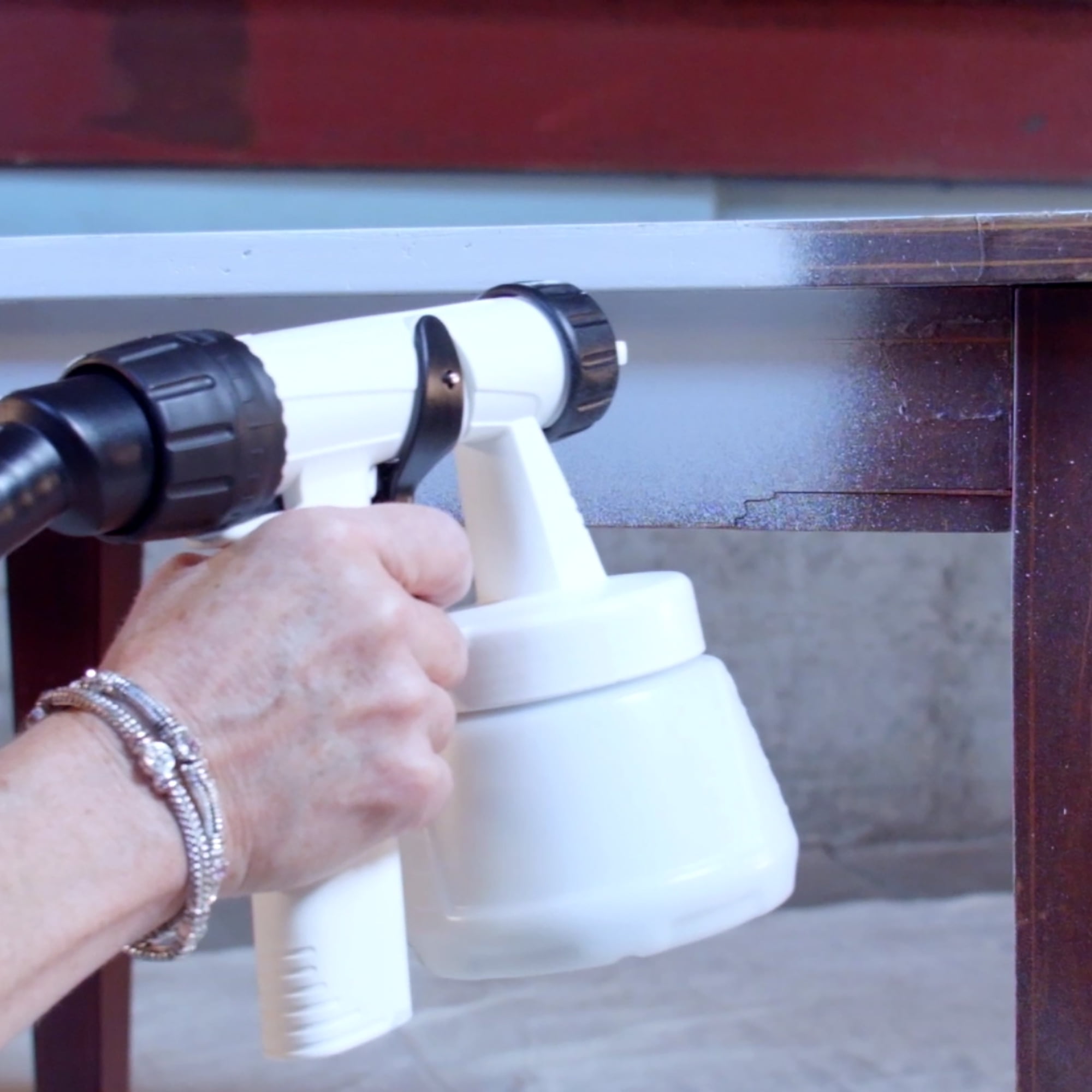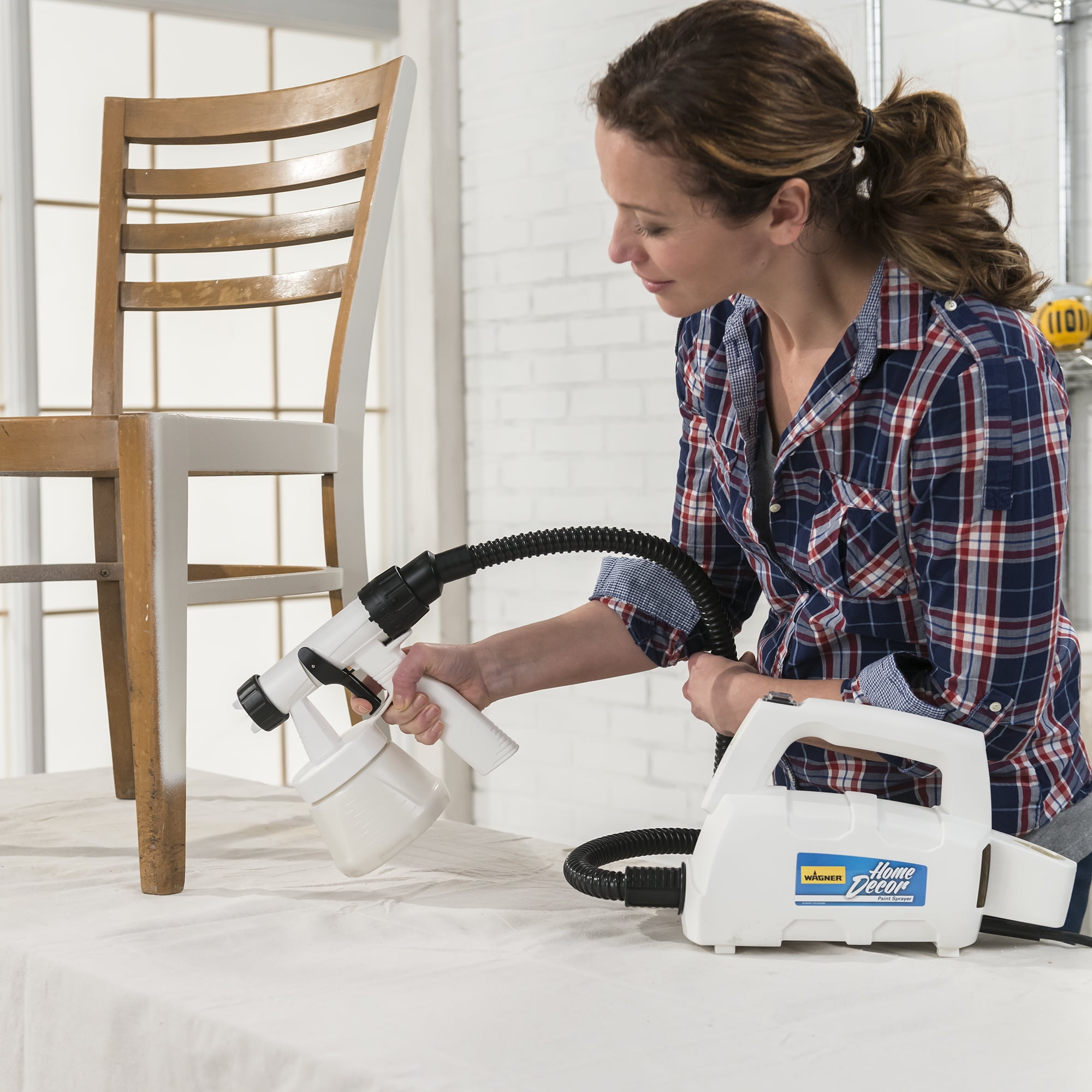 Applies a smooth finish with no brush marks and saves time versus painting by hand Perfect for refinishing furniture, crafts, home décor and more Sprays decorative paints such as chalk type and milk (thinning may be necessary) Also sprays specialty furniture/cabinet paints plus stains, sealers, and lacquers Stationary base is connected to the spray gun with a 6 ft. air hose, providing extended spraying comfort Compact design makes the spray gun lightweight and easy to maneuver for small pieces and tight spaces