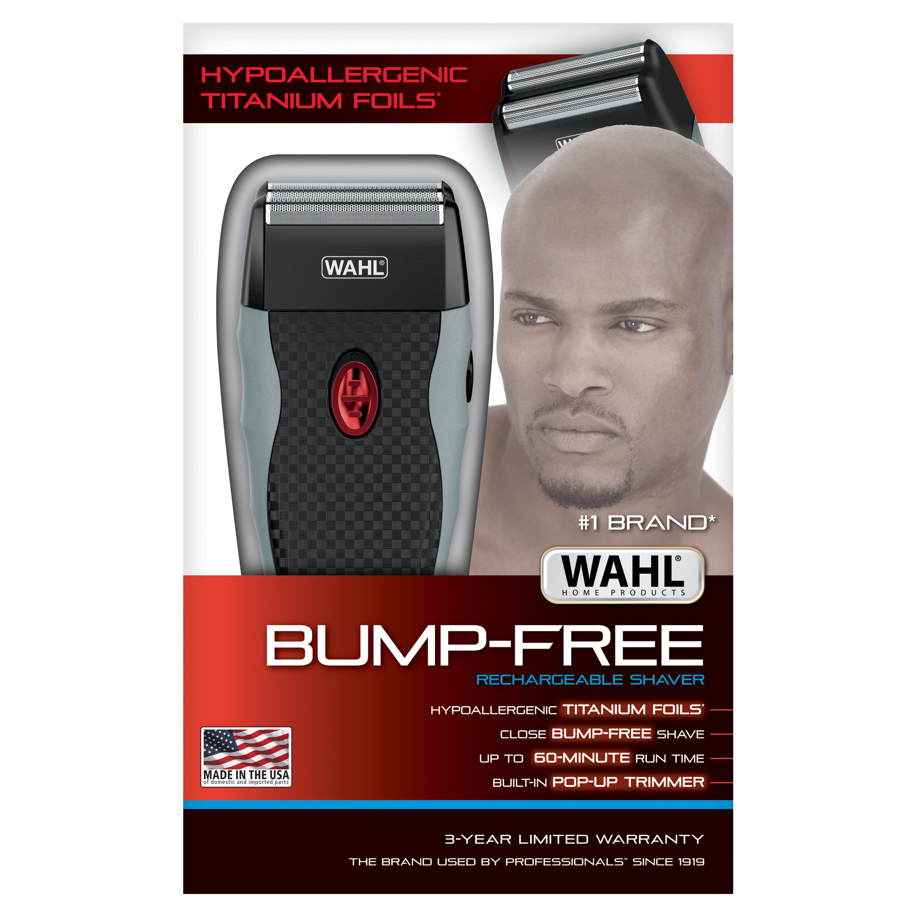 Wahl Men’s Bump-Free Rechargeable Foil Shaver, Black/Gray, 7339-300. Wahl Bump Free Shaver includes a pop-up trimmer, foil guard, beard brush and hypoallergenic titanium foil. Travel-friendly rechargeable electric shaver features titanium foil cutters, a no-slip rubber grip, travel lock, and a pop up trimmer. Durable electric shaver features a battery with up to a 60-minute run time from a single charge. Hypoallergenic titanium foils allow for a close, smooth, bump-free shave that won’t irritate your skin; our titanium foils allow for a more comfortable shave and can help reduce the pain from shaving.