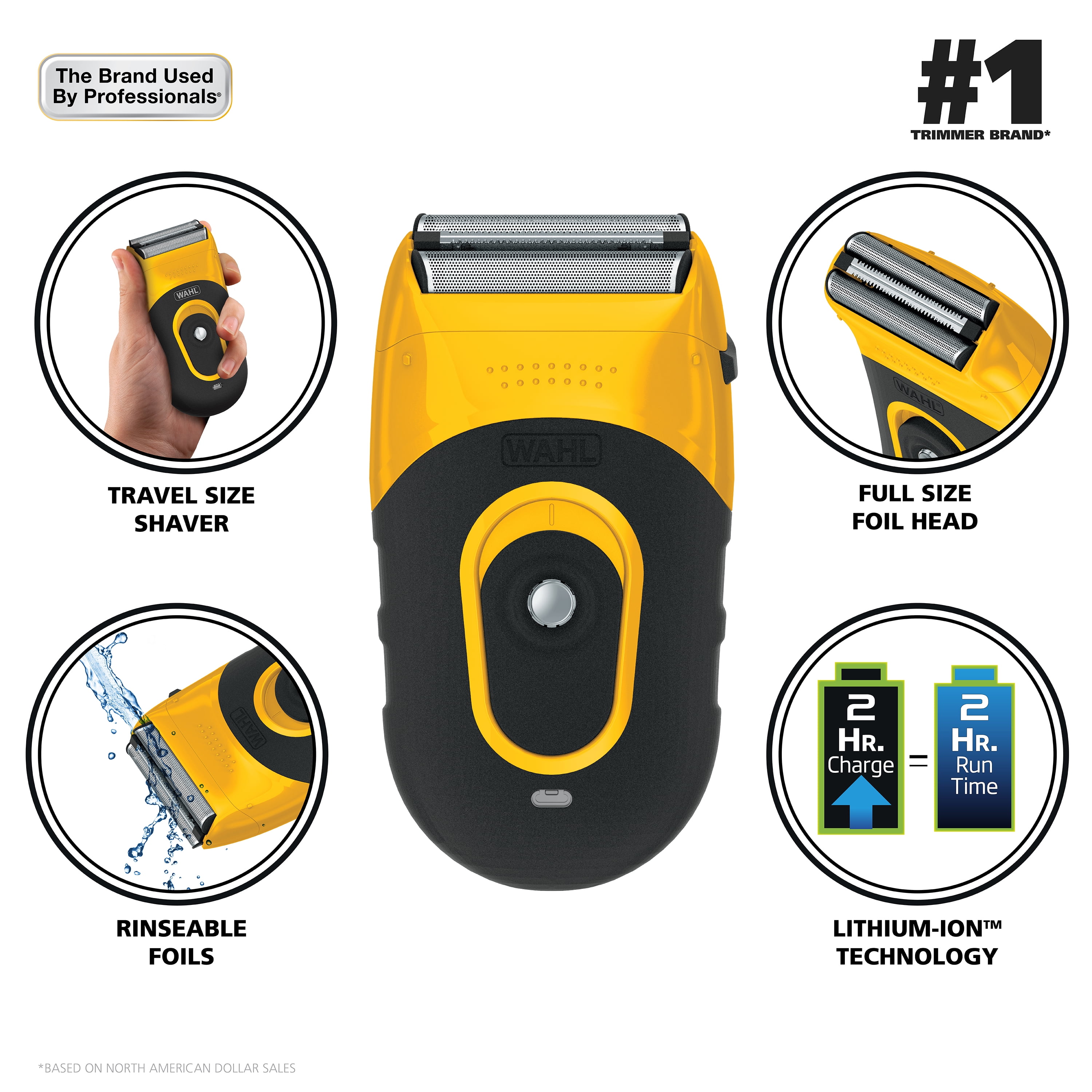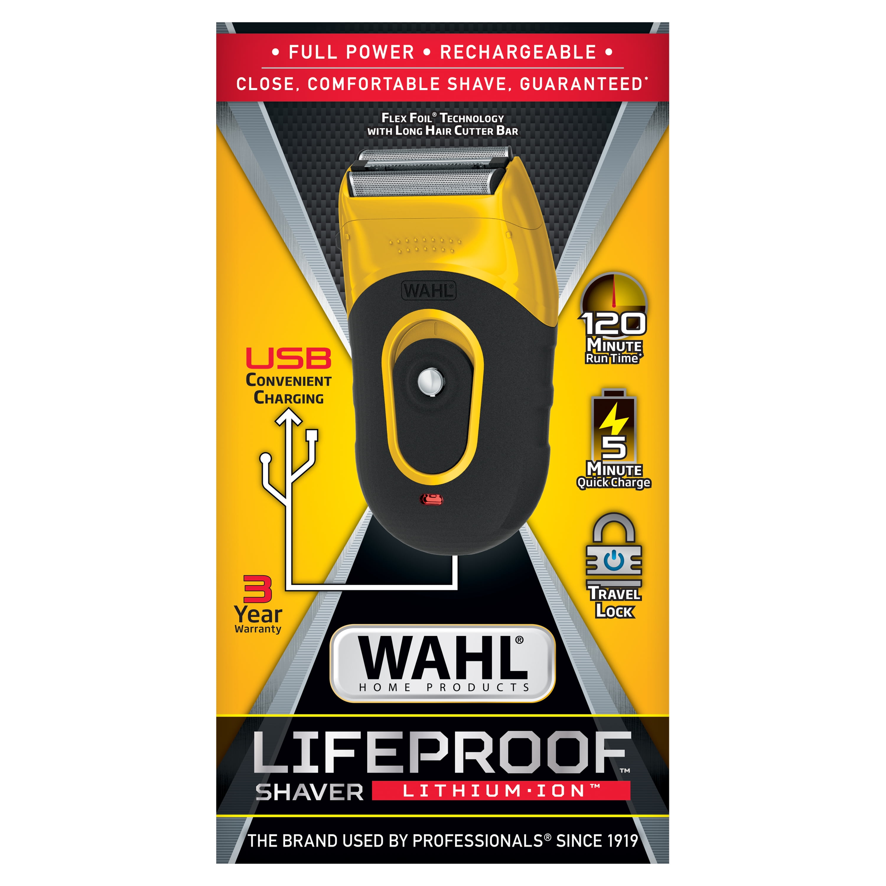 Wahl Compact Life Proof Rechargeable Lithium Ion Flex Foil Shaver For Men, Yellow/Black, 3023681. With rechargeable Lithium Ion power, this shaver allows you to conveniently use it anywhere. The rinseable foils are great for easy hygienic cleaning and the flex foil technology provides a smooth shave that contours the grooves of your face. Never worry about power, on a full charge, this shaver has up to a 60 minute runtime. The compact size and ergonomics of this electric men’s shaver make it the ideal option for looking your best while traveling and at home. It also fits nicely into any travel bag and comes with a built-in travel lock that prevents the shaver from turning on during travel.