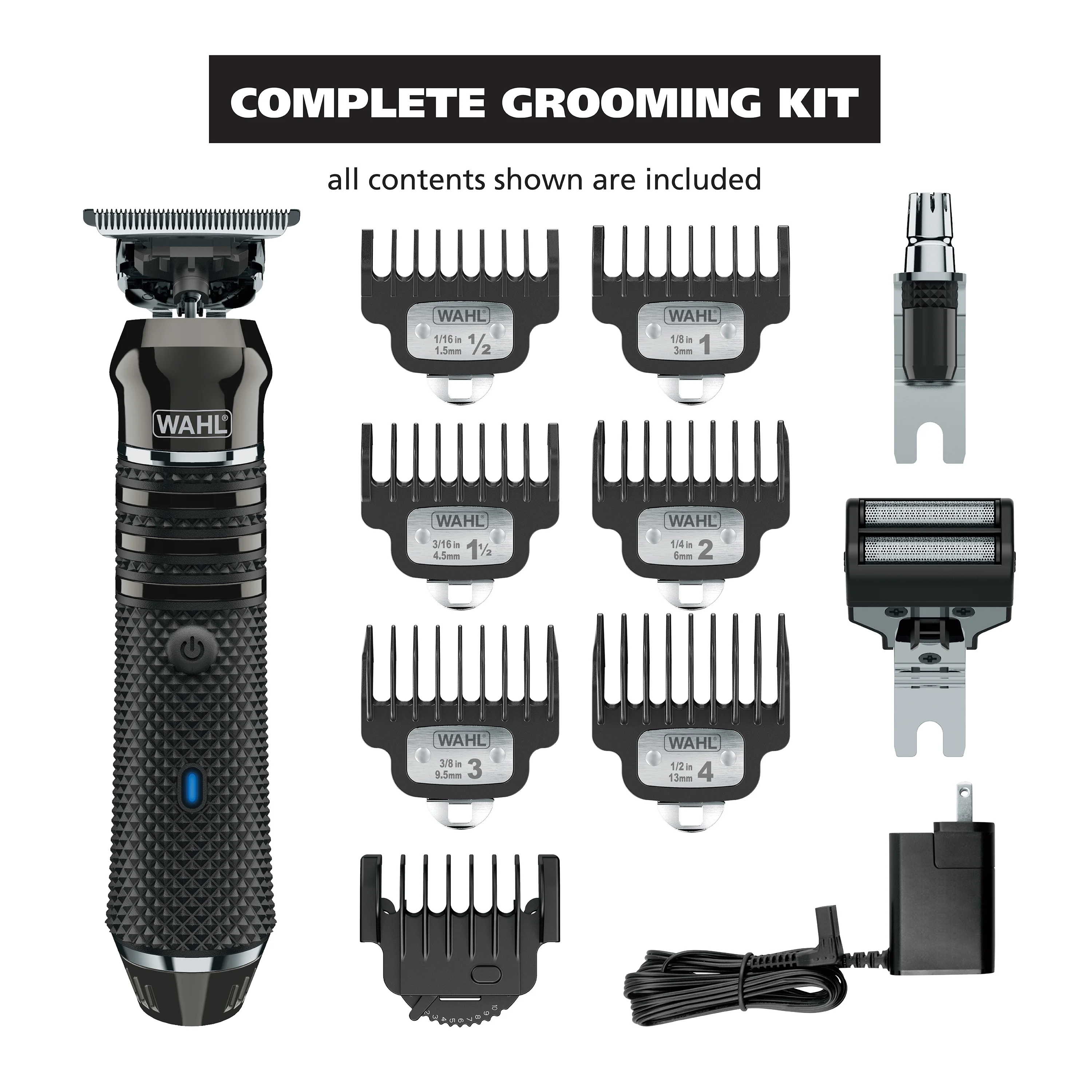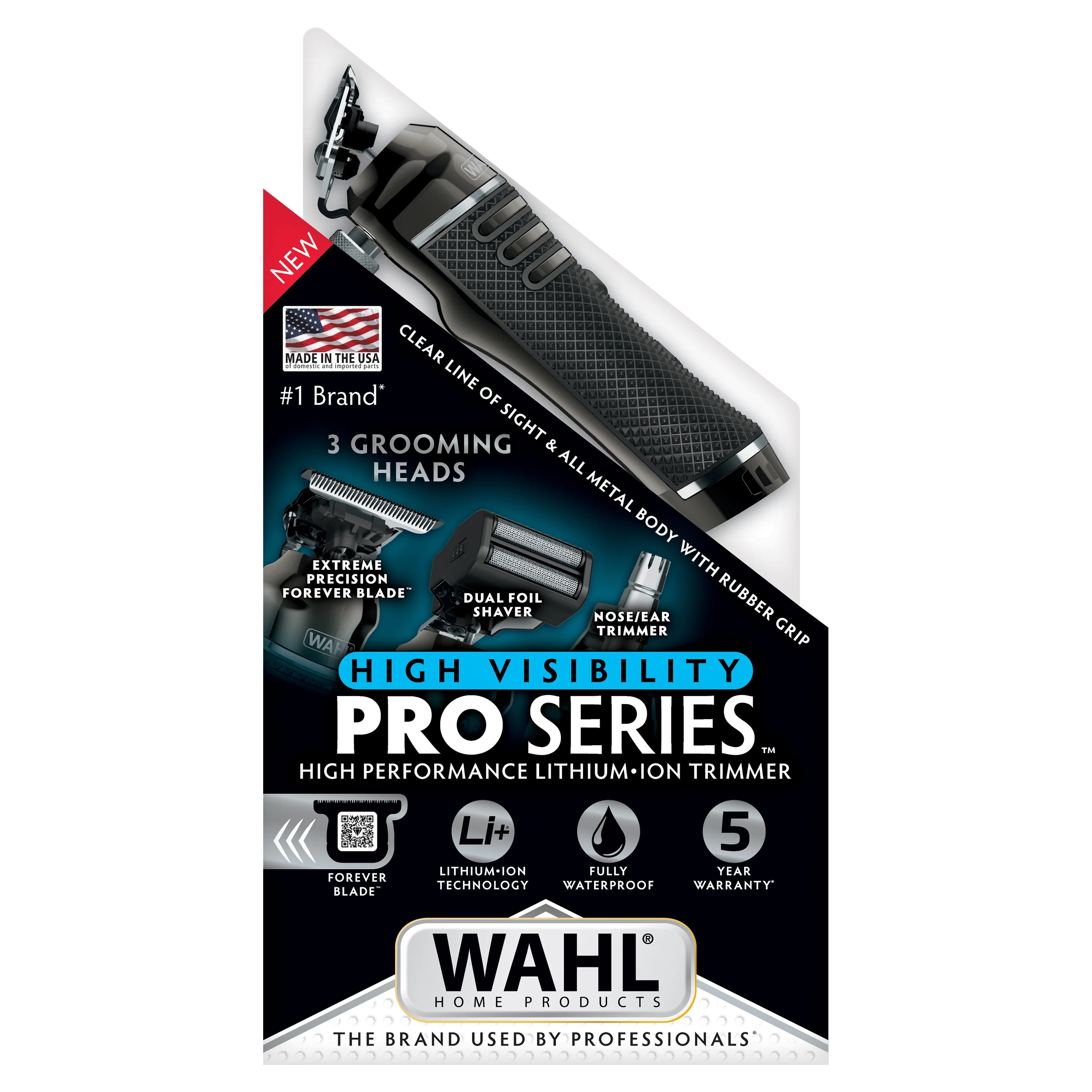 Wahl Pro Series High Visibility Skeleton Extreme Visibility Beard Trimmer for men is a multi-purpose grooming solution. This kit’s 360 degree blade design provides extreme visibility of the trimming area. This Wahl beard trimmer has our innovative Forever Blade, with a black diamond-hard carbon coating that provides a smoother cutting experience. The near zero gap blade design (.2mm) cuts 4x closer compared to Wahl’s 1st generation standard trimmer blades and some competition. This kit also includes a rinse-able rotary ear & nose hair trimmer for hygienic trimming of ear and nose hairs, as well as a close shaving dual foil shaver head.