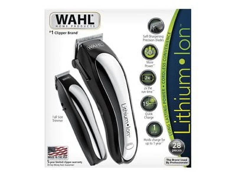 Powered by lithium ion technology, the clipper outperforms standard Wahl rechargeable clippers by providing up to two times the run time, clocking in at one hour and forty minutes on a full charge. This eliminates the need for frequent recharging, and provides a versatile solution for people that prefer to cut hair outside in locations such as the garage or patio. It also provides: ? 50 percent more power than standard Wahl magnetic motor clippers to avoid snagging, pulling and uneven cutting ? 15 minute quick charge for over 12 minutes of e, enough for a complete haircut ? Only three hours for a full charge ? Kit includes full-size detail trimmer