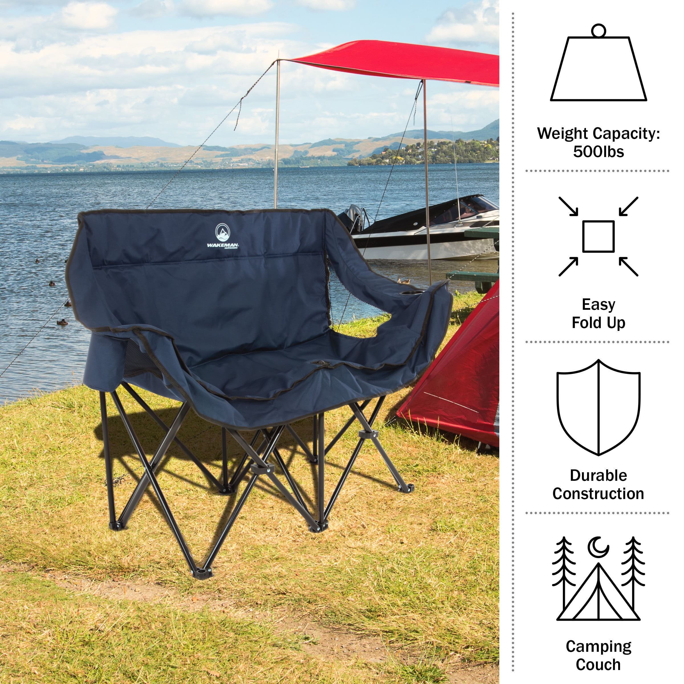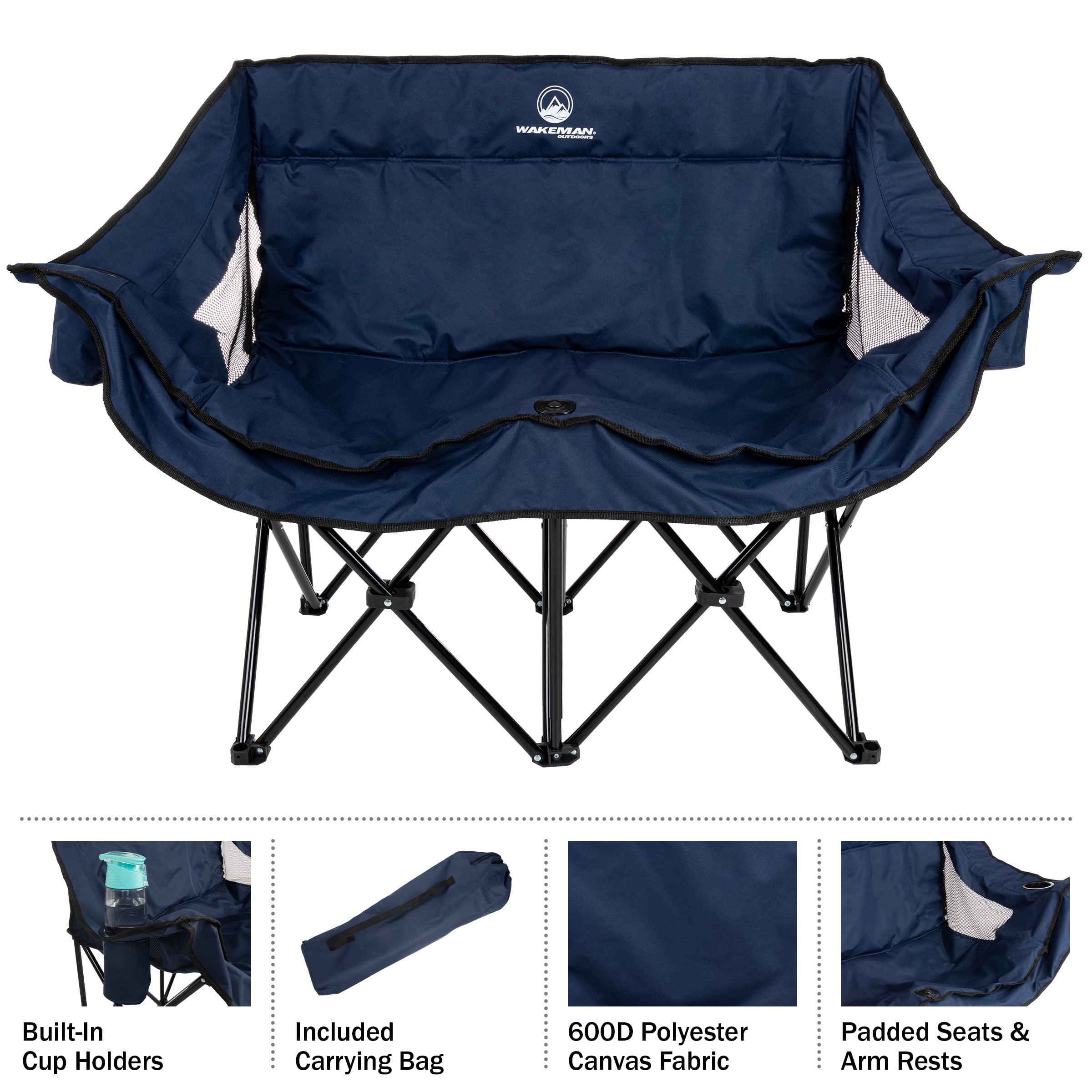 LOVESEAT CAMPING CHAIR – Enjoy comfortable seating wherever adventure takes you with this extra-large fold up chair, with padded seats and arm rests that make it easy to relax. LIGHTWEIGHT AND PORTABLE – The included carrying bag makes the folding camp chair easy to bring to outdoor sporting events, concerts, camping, or beach days. DURABLE COMFORT – This love seat camping chair is constructed from 600D polyester and built-to-last, with a weight capacity of up to 500-pounds.