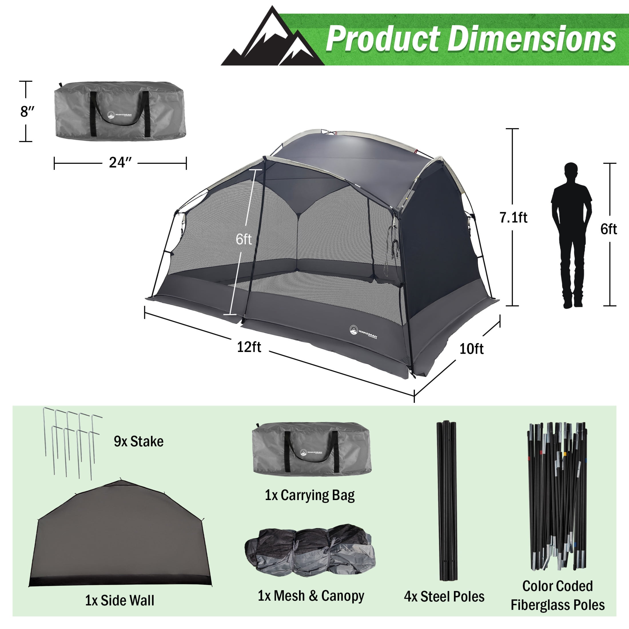 SHADE CANOPY – This 4-sided patio gazebo tent is made of the water-resistant 800MM polyester taffeta material, perfect for a picnic in the park, a beach day, as a tailgate tent, for barbeques, or as a camping canopy. SPACIOUS SIZE – This 12×10-foot enclosed tent canopy has ample space for 6 people to comfortably enjoy any outdoor adventure. AMPLE VENTILATION – The walls of this beach shade canopy are made of fine mesh that delivers excellent ventilation while keeping pests away, with front and rear doors for easy access. EASY SET UP – The included fiberglass poles, 4 guy lines, and steel stakes make setting up this backyard gazebo or beach cabana fast and easy, with a carrying bag for easy transport and storage. MATERIALS – 800MM Polyester Taffeta, 68D Poly Mesh, 235GR PE Sheet, Steel, and Fiberglass. DIMENSIONS – (L) 144” x (W) 120” x (H) 86”; Center: (H) 88″; Fiberglass Poles: 9.5mm Diameter. Stakes: 19mm Diameter. Gazebos Weight: 18.5lbs. COLOR – Gray.