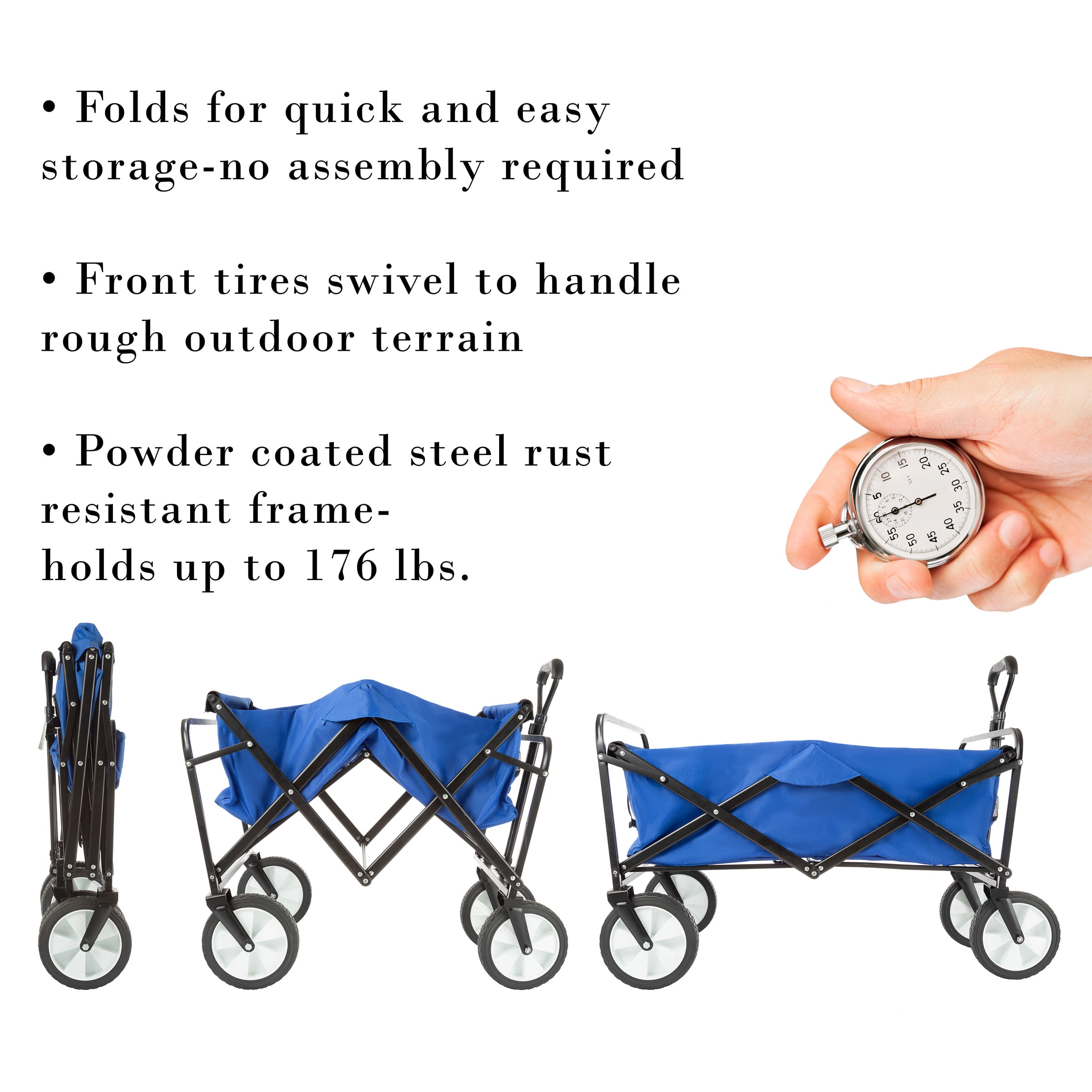 FOLDING WAGON – Easily transport shopping bags, camping gear, or landscaping supplies with this foldable wagon, which collapses in seconds with the simple pull of a tab and features 2 mesh cupholders to keep drinks handy. ALL-TERRAIN – The grocery cart has 8-inch tires for high clearance, a telescoping handle for comfort, and 360-degree swiveling front tires for superior maneuverability, great for camping, yard work, or using as a beach cart. 176LB CAPACITY – This folding wagon cart with wheels has a 176lb capacity but measures a compact 8-inches-wide by 20-inches-long when collapsed for easy storage. DURABLE CONSTRUCTION – The 100-percent 600D polyester body of this wagon cart resists snagging while the metal frame is powder-coated to protect it from rust and corrosion. MATERIALS – Metal and 600D Polyester. DIMENSIONS – (L) 34.5” x (W) 20” x (H) 22.5”; Folded: (L) 20” x (W) 8” x (H) 29”; Max Handle Length: 33”; 8” Diameter Wheels; 176lb Capacity; Foldable Cart Not Intended to Carry Children.