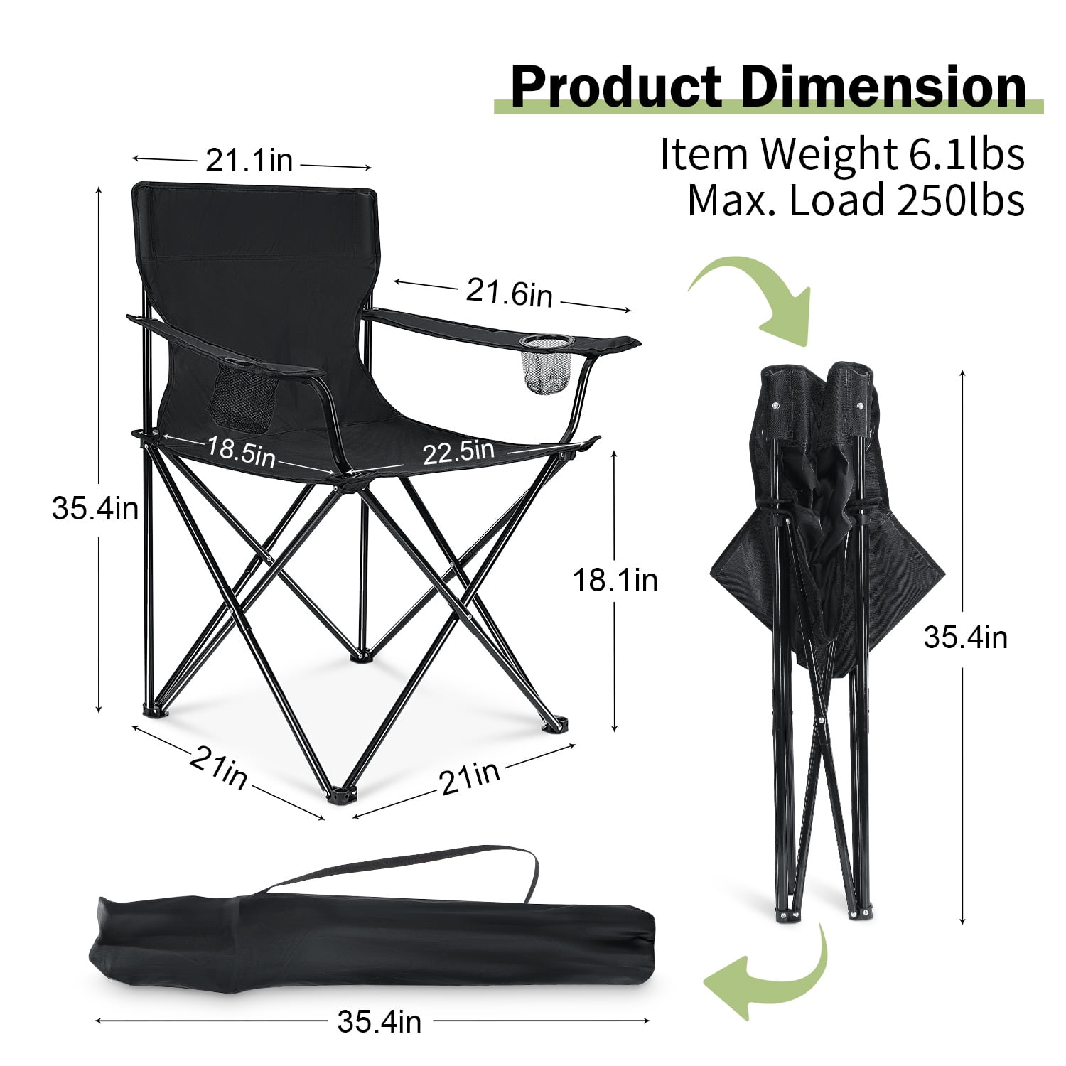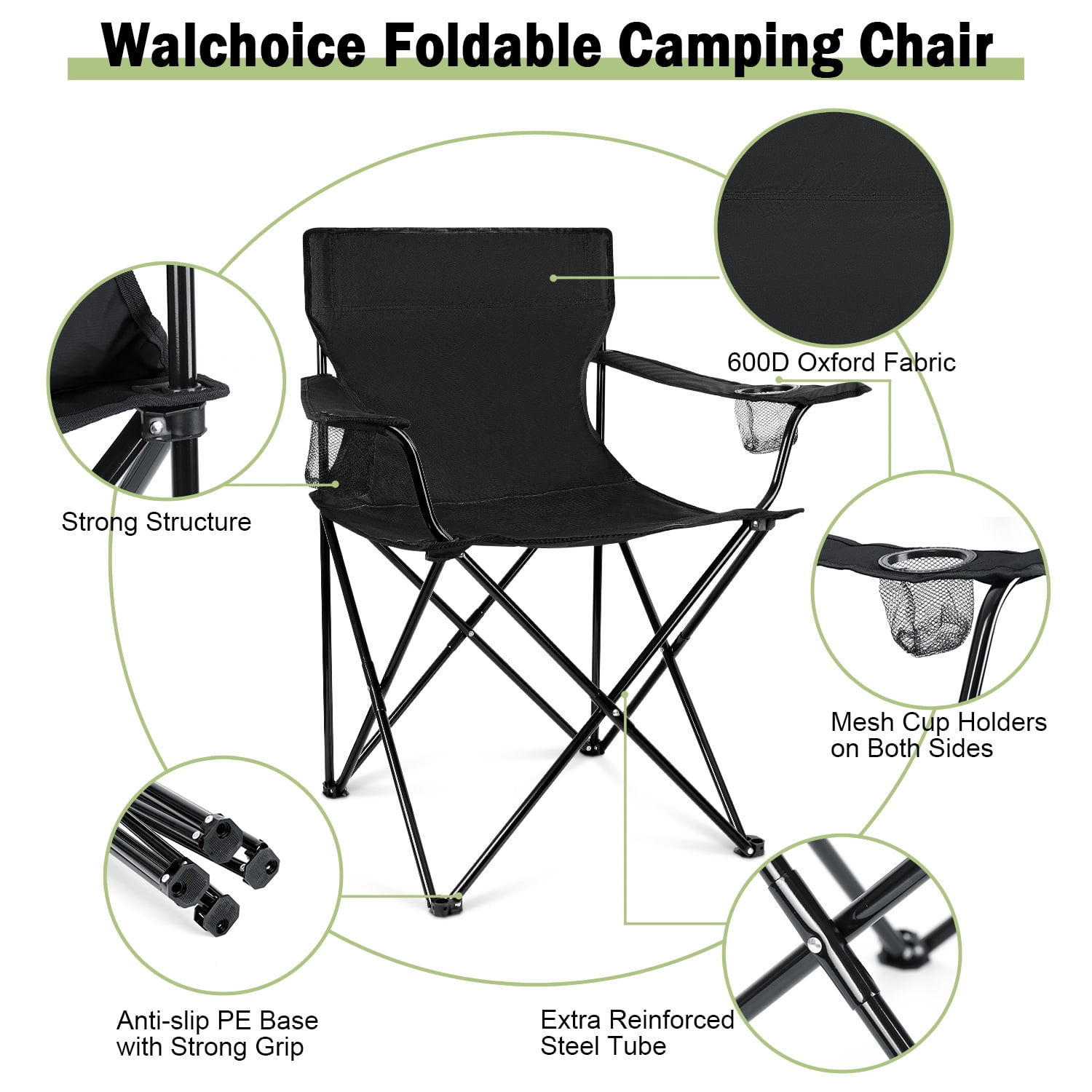 PREMIUM MATERIAL- Walchoice camping chair is made of 600D oxford fabric and steel pipe, Not easy to bend, deform or rust, Good wear resistance and corrosion resistance for long-term use, Also features the advantages of waterproof, soft, breathable, durable and easy-to-clean COMFORTABLE – Size of seat cushion is 18.5 in x 22.5 in for enough width, Full backrest design and armrests provide support for you, Ensures overall comfort even sitting for long time, Mesh cup holders on both sides for holding your belongs, Anti-slip PE base for keeping the chair steady SOLID STRUCTURE – Maximum load capacity up to 250lbs without breaking, Double-layer fabric and double stitching for ensuring seat cushion will not sag, 16mm diameter steel pipes and X-shaped support for more durable and stable, Extra reinforced tube for improving stability and reducing friction FOLDABLE & PORTABLE – Oversized camping chair can be opened and folded effortlessly without wasting much time, Folded size of camping chair is 6 in x 35.4 in, Weight of it is 6.1lbs, Compact enough to fit in a carrying bag or easy to store, Allows you to take it anywhere conveniently MULTIFUNCTIONAL – Foldable lawn chair can be applied for a variety of outdoor activities, Perfect for hiking, fishing, beach, camping, travel, barbecue, picnics, excursion, park, sporting or any other activities you like, It is also a good choice as a gift for campers, hikers and other outdoor enthusiasts
