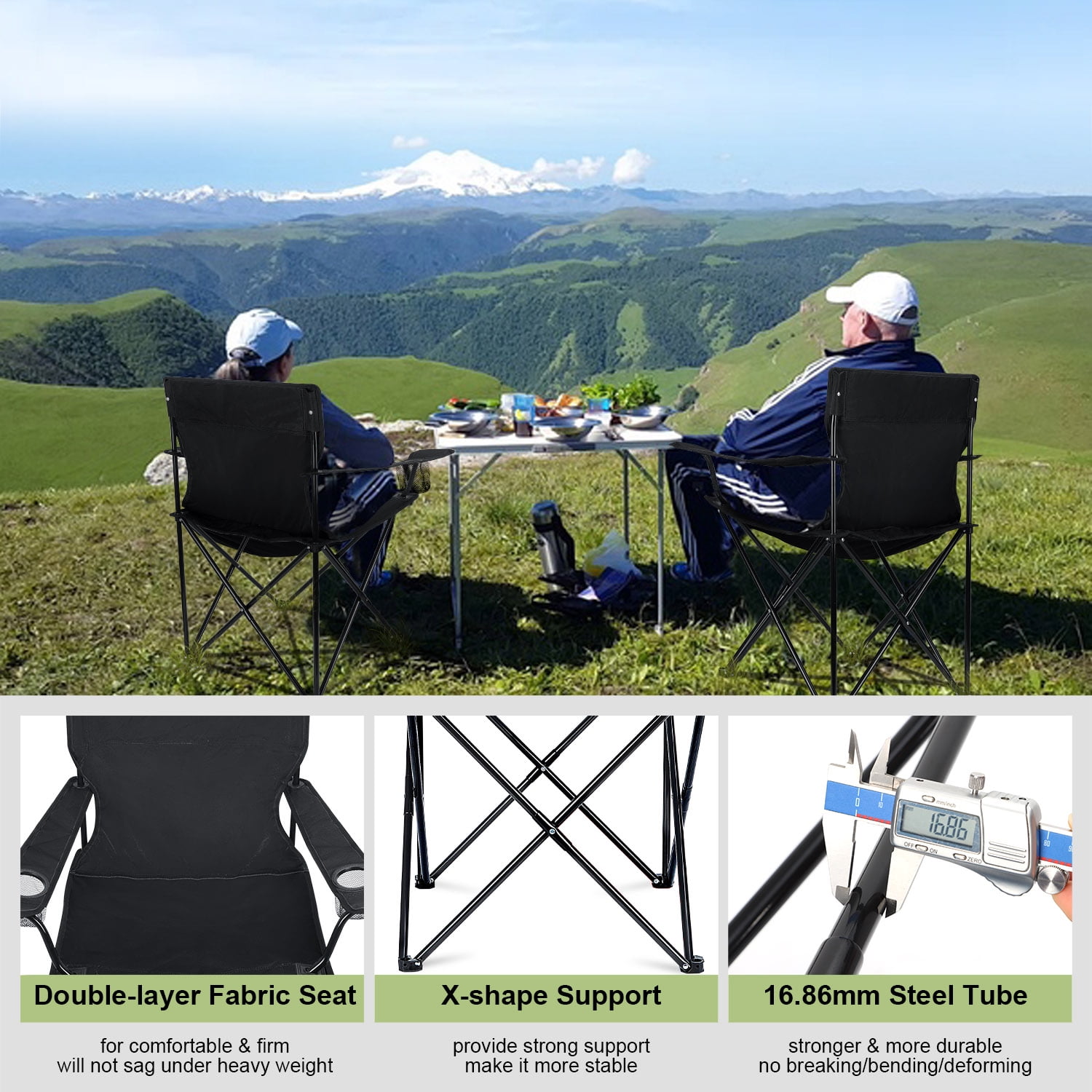 PREMIUM MATERIAL- Walchoice camping chairs are made of 600D oxford fabric and steel pipe, Not easy to bend, deform or rust, Good wear resistance and corrosion resistance for long-term use, Also features the advantages of waterproof, soft, breathable, durable and easy-to-clean COMFORTABLE – Size of the seat cushion is 18.5 in x 22.5 in for enough width, Full backrest design and armrests provide support for you, Ensures overall comfort even sitting for a long time, Mesh cup holders on both sides for holding your belongs, Anti-slip PE base for keeping the chair steady SOLID STRUCTURE – Maximum load capacity up to 250lbs without breaking, Double-layer fabric and double stitching for ensuring seat cushion will not sag, 16mm diameter steel pipes and X-shaped support for more durable and stable, Extra reinforced tube for improving stability and reducing friction FOLDABLE & PORTABLE – Oversized camping chair can be opened and folded effortlessly without wasting much time, Folded size of camping chair is 6 in x 35.4 in, Weight of it is 6.1lbs, Compact enough to fit in a carrying bag or easy to store, Allows you to take it anywhere conveniently MULTIFUNCTIONAL – Foldable lawn chair can be applied for a variety of outdoor activities, Perfect for hiking, fishing, beach, camping, travel, barbecue, picnics, excursion, park, sporting or any other activities you like, It is also a good choice as a gift for campers, hikers and other outdoor enthusiasts