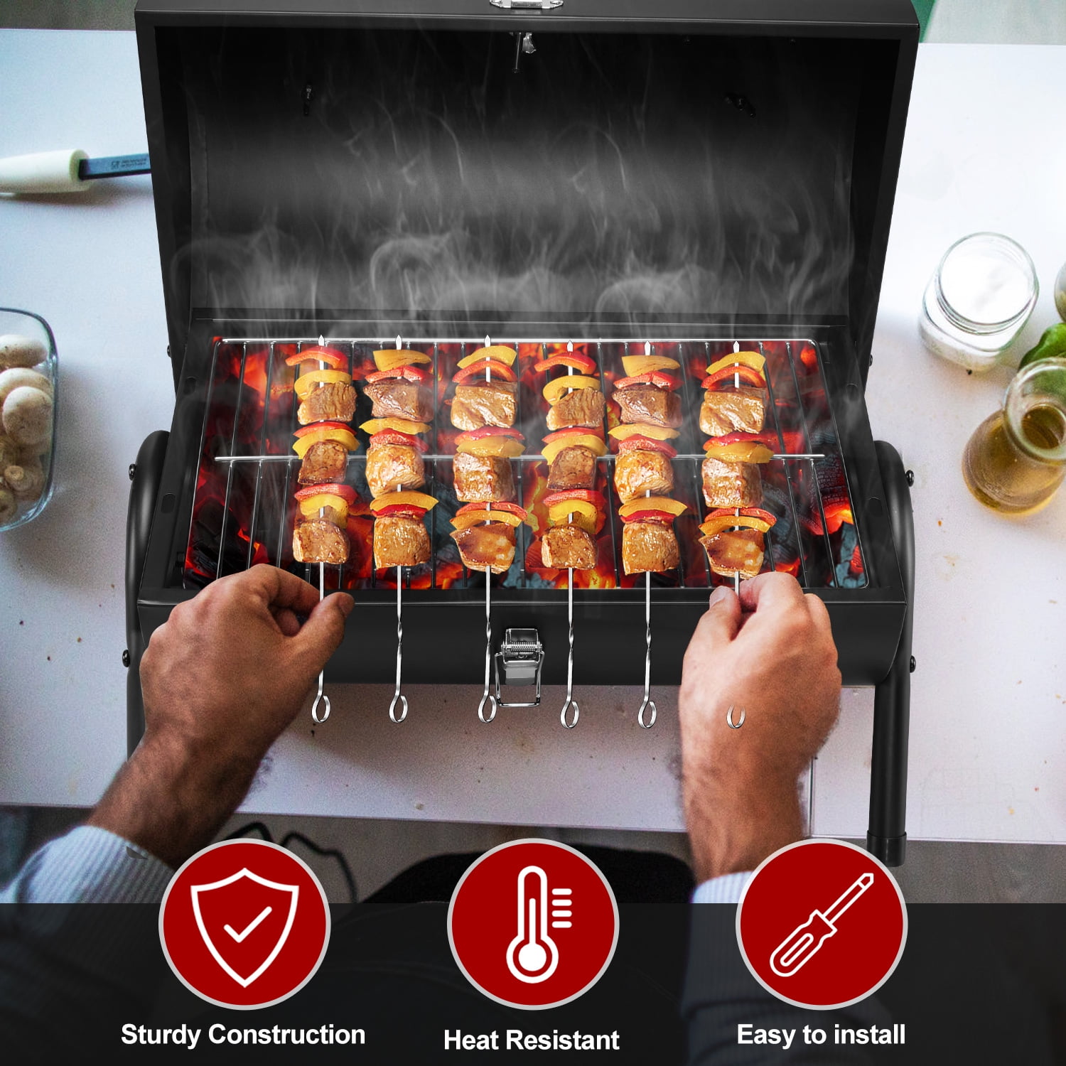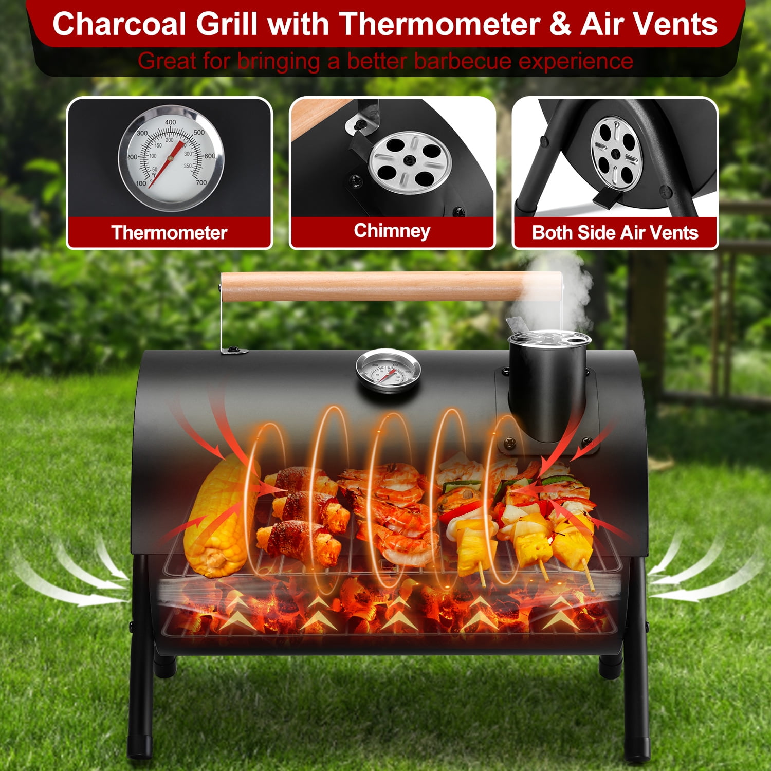 PREMIUM MATERIAL – Walchoice tabletop charcoal grill is made of premium iron steel, Surface of grill is coated by high-fired powder, no worry about peeling off any toxic substances or any poisonous smell under a high temperature of 750°F, healthy and safe for daily use, Good corrosion and rust resistance for a long service time WELL DESIGN – Height of wooden handle is 2.5 inch, great for protecting your hands to prevent scalding from high temperature, High-quality lock catch for securing the lid to avoid popping open when you pick it up, 2 pull rods for supporting the grill lid, Leg on both sides for strengthening the stability of charcoal grill without wobbling UPGRADED GRILL RACK – Made of food-grade chrome material, no worry about any toxic substances seeping into food, Thickened version for not easy to bend or deform, Size of grilling rack is 13.4 x 8.7 inches, roughly equal to 116 square inches cooking area, perfect for dealing with steaks, kabobs, burgers, sausages and so on for 2-4 people GREAT VENTILATION – A thermometer with precise scale is mounted on the lid, great for easy to monitor temperature to bring a better cooking taste, Adjustable air vents on both sides for regulating the airflow to ensure full combustion of charcoal, A vertical chimney for control the emission of heat smoke to adjust internal temperature COMPACT & PORTABLE – Charcoal grill with compact design is portable, Solid construction and suitable size for putting it in the trunk of car easily, Convenient for moving around and carrying to camping, beach, patio, backyard, porch, garden or other outdoor locations, Easy to install by a screwdriver, It could satisfy your different needs